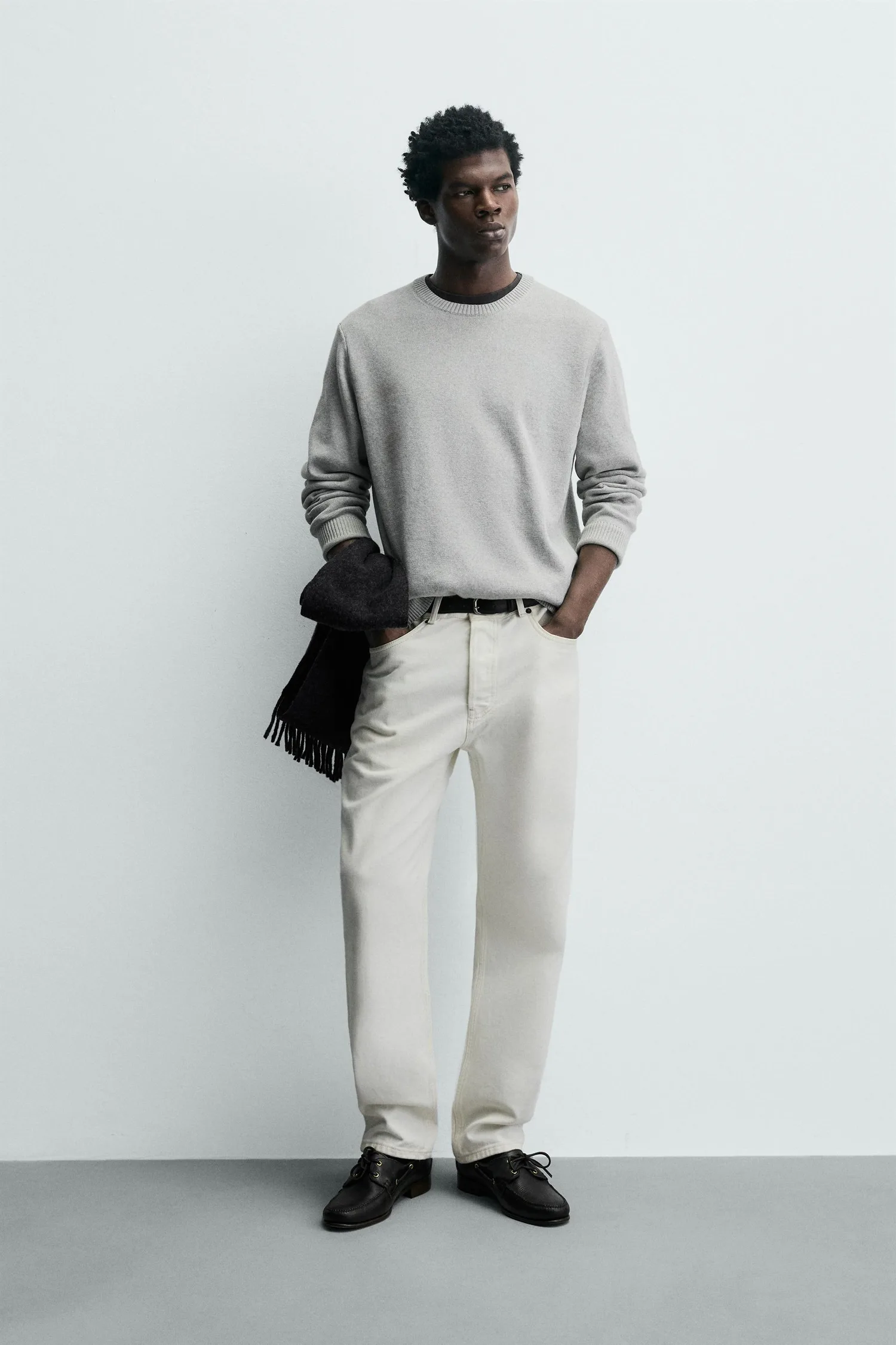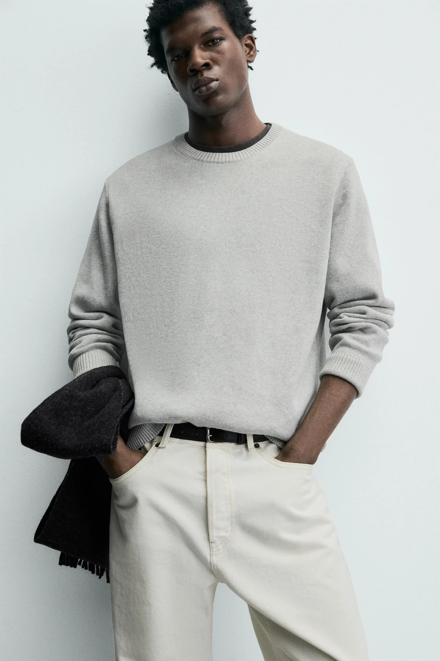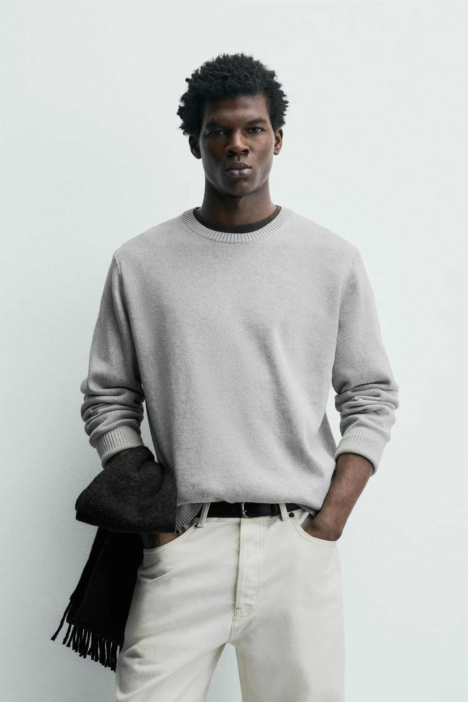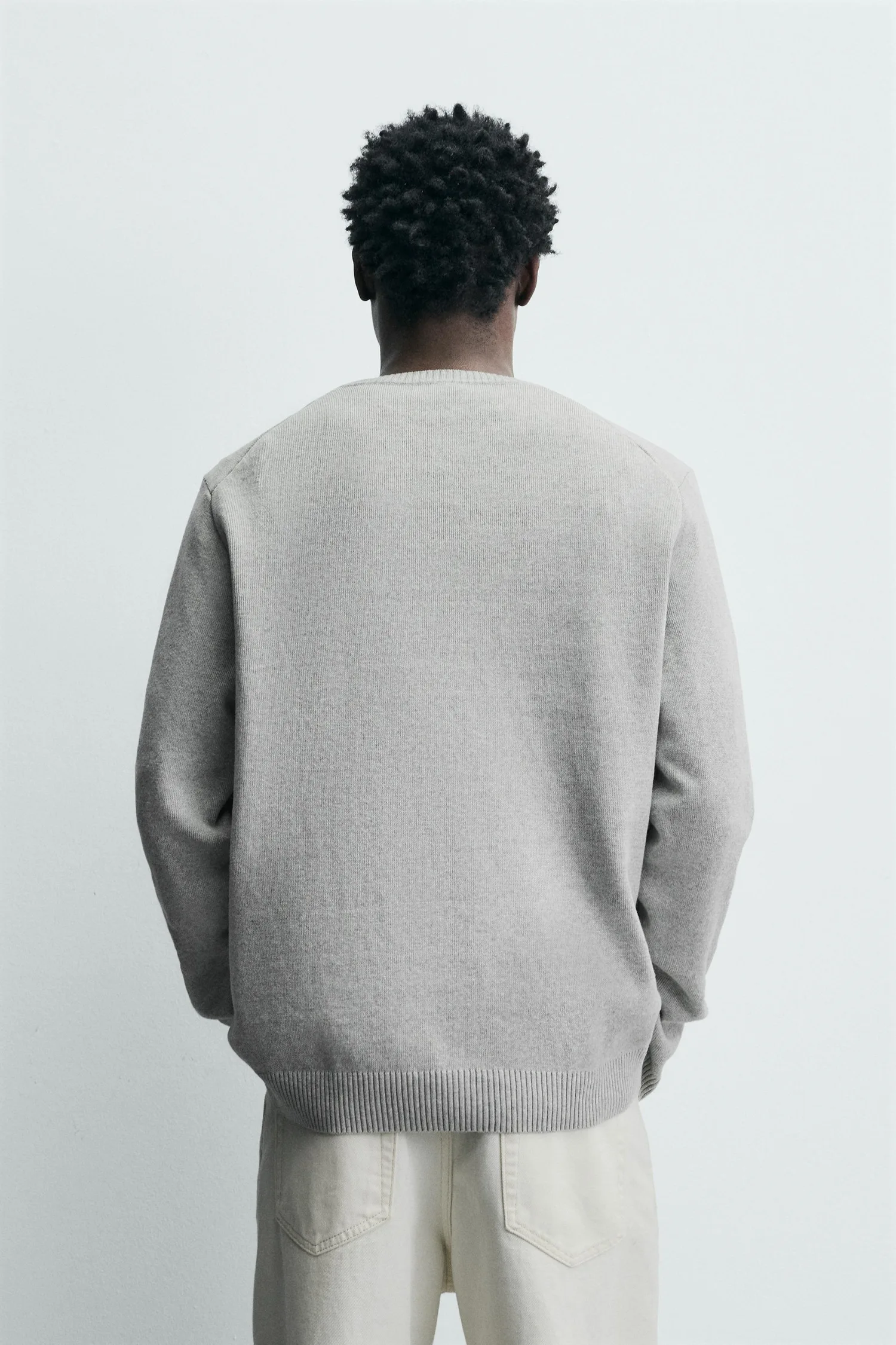 Джемпер стандартного кроя из хлопковой пряжи. Круглый вырез и длинные рукава. Ребристая отделка.