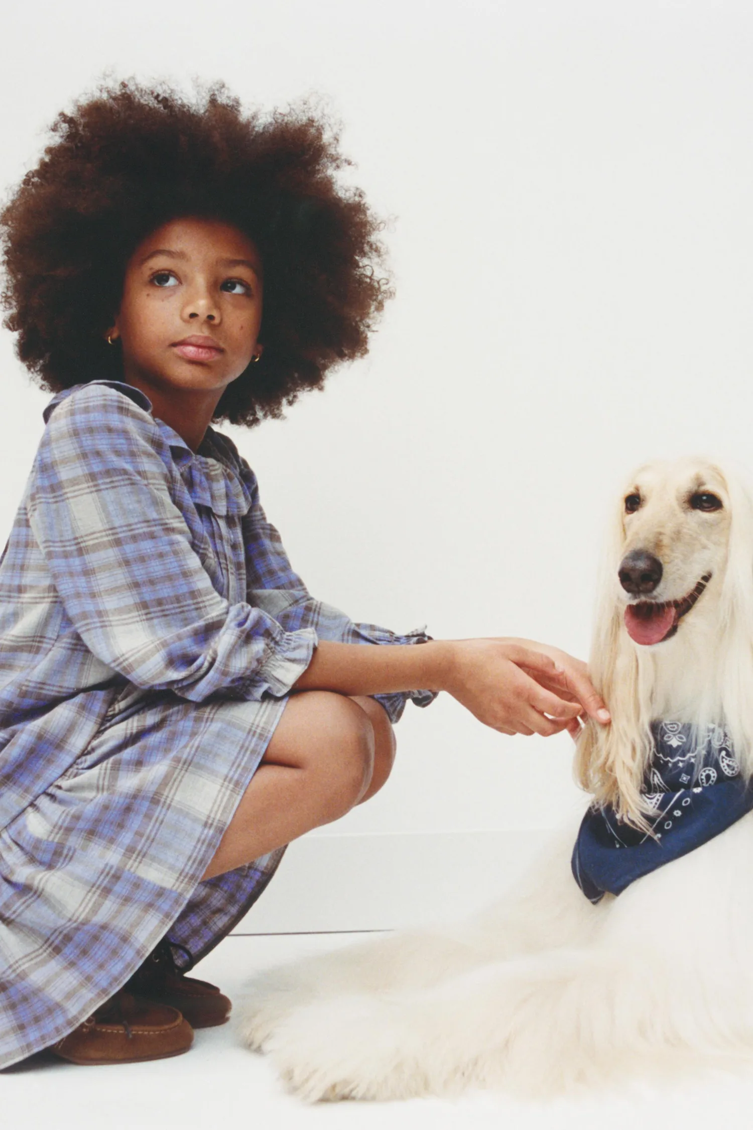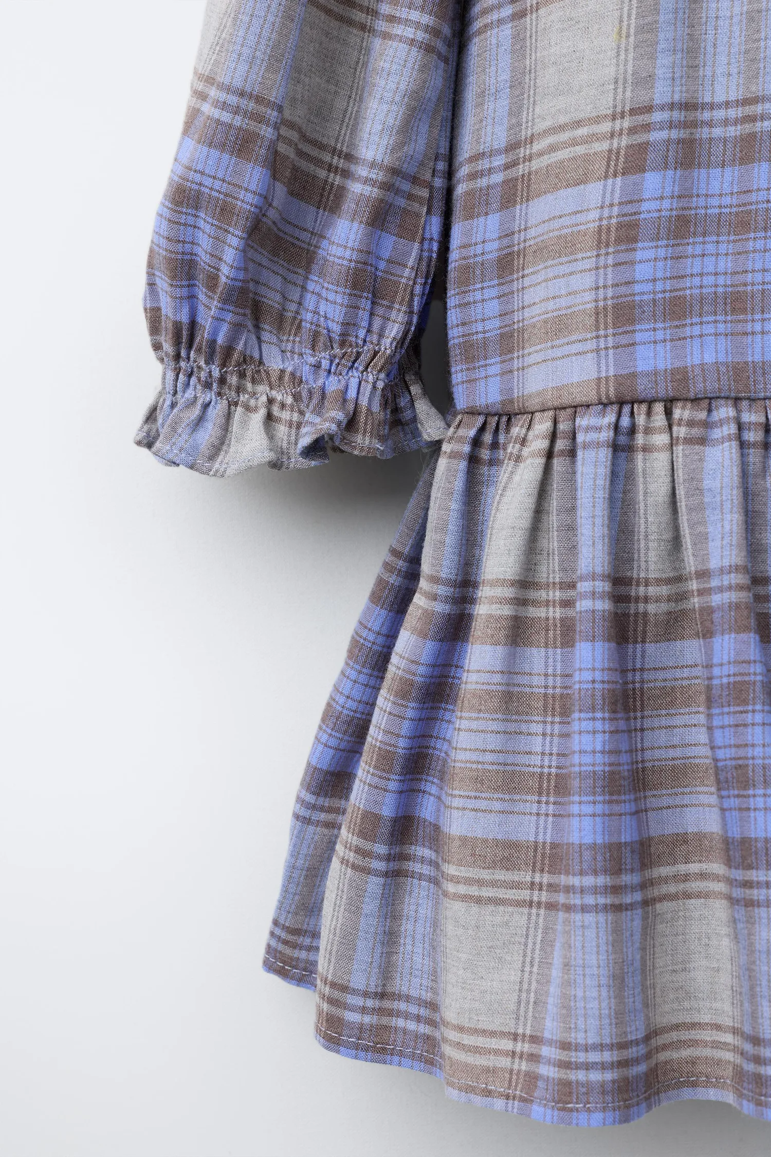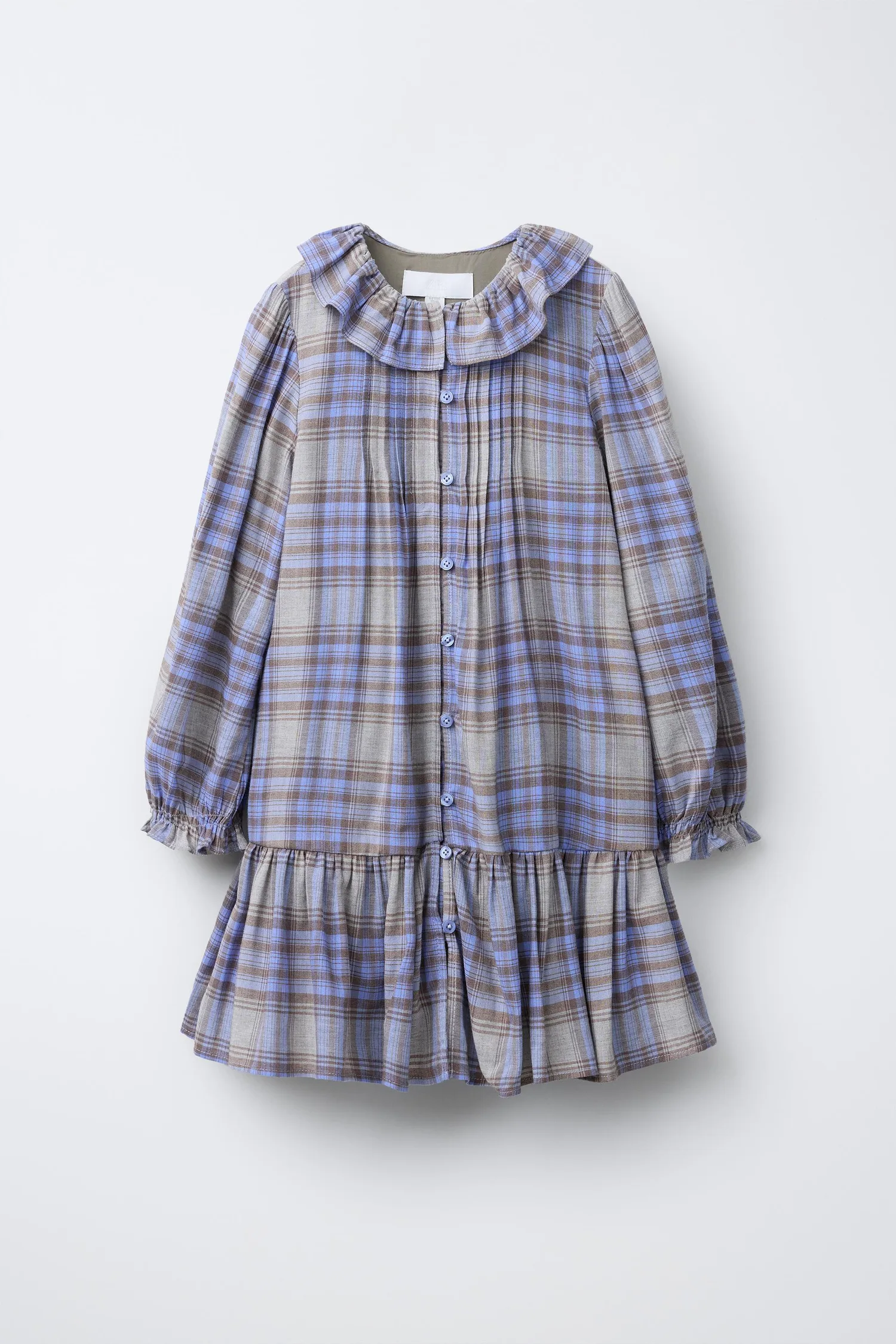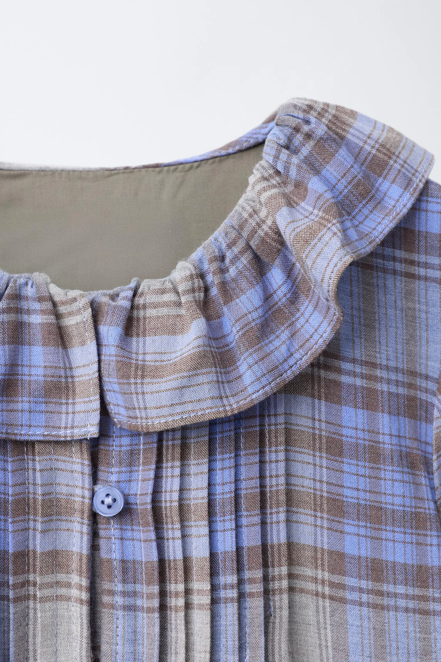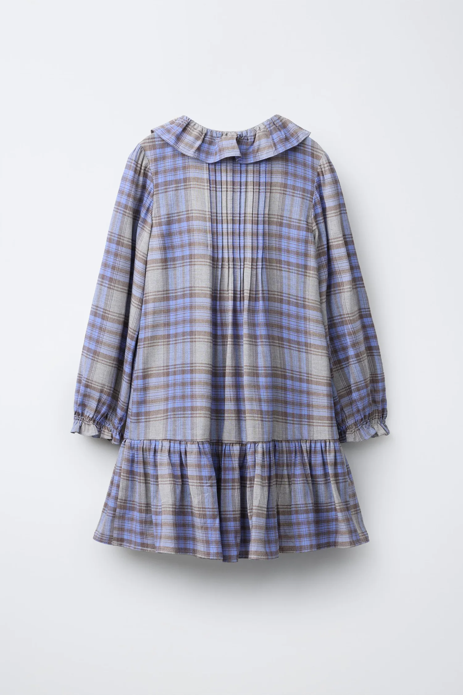 Платье с воротником «Питер Пэн», длинными рукавами с эластичными манжетами, застежкой на пуговицы в форме капли спереди и складками спереди. Клетчатый принт.