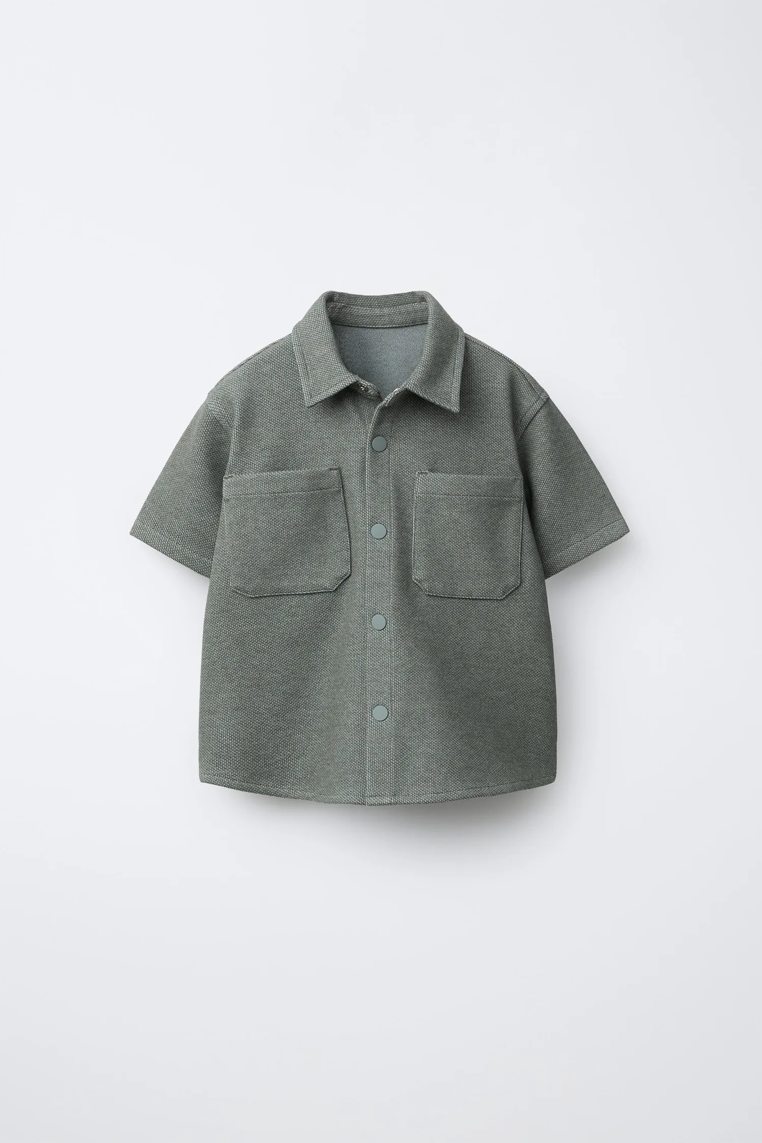 Рубашка с воротником и короткими рукавами. Застежка на кнопки спереди и накладные карманы на груди.
