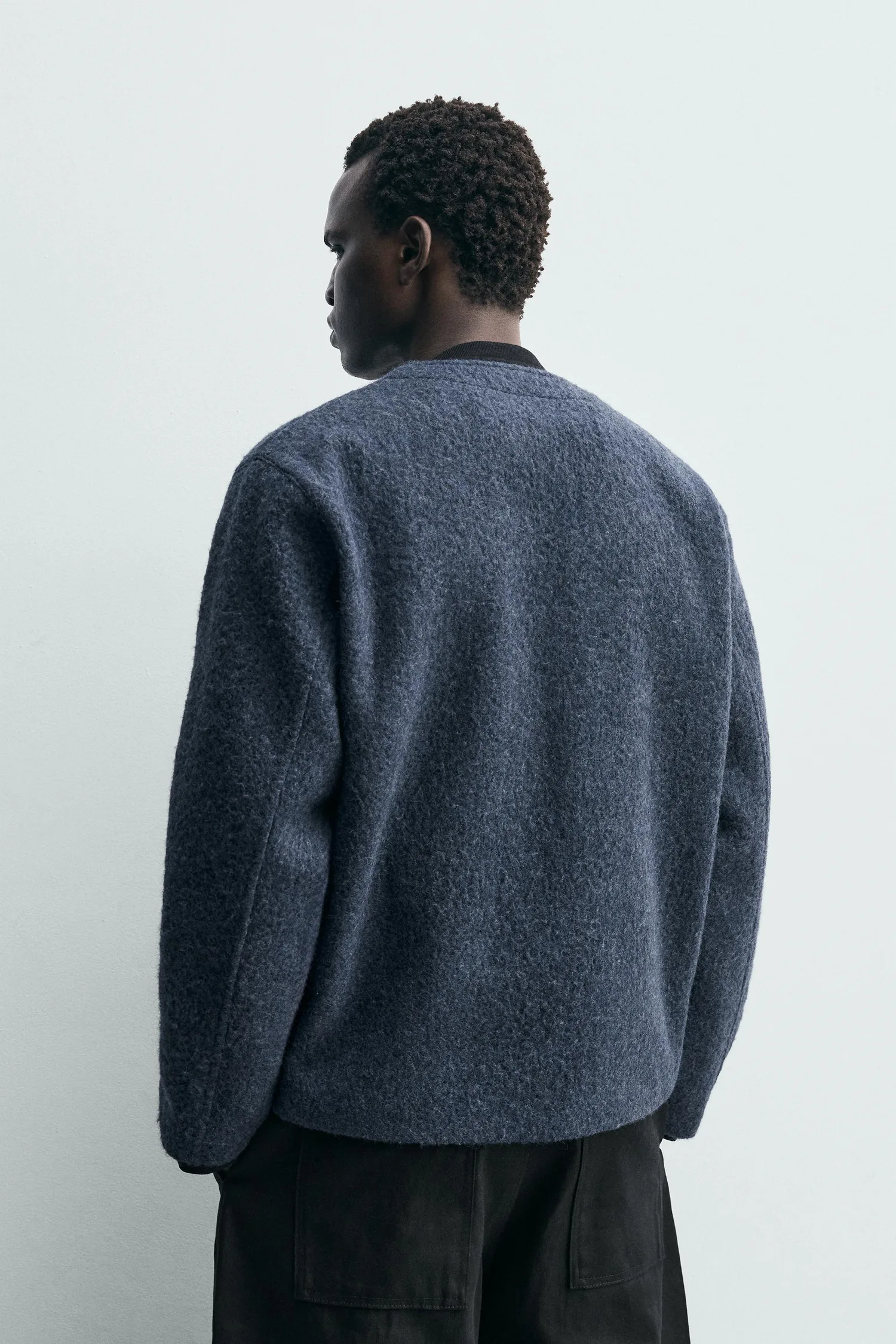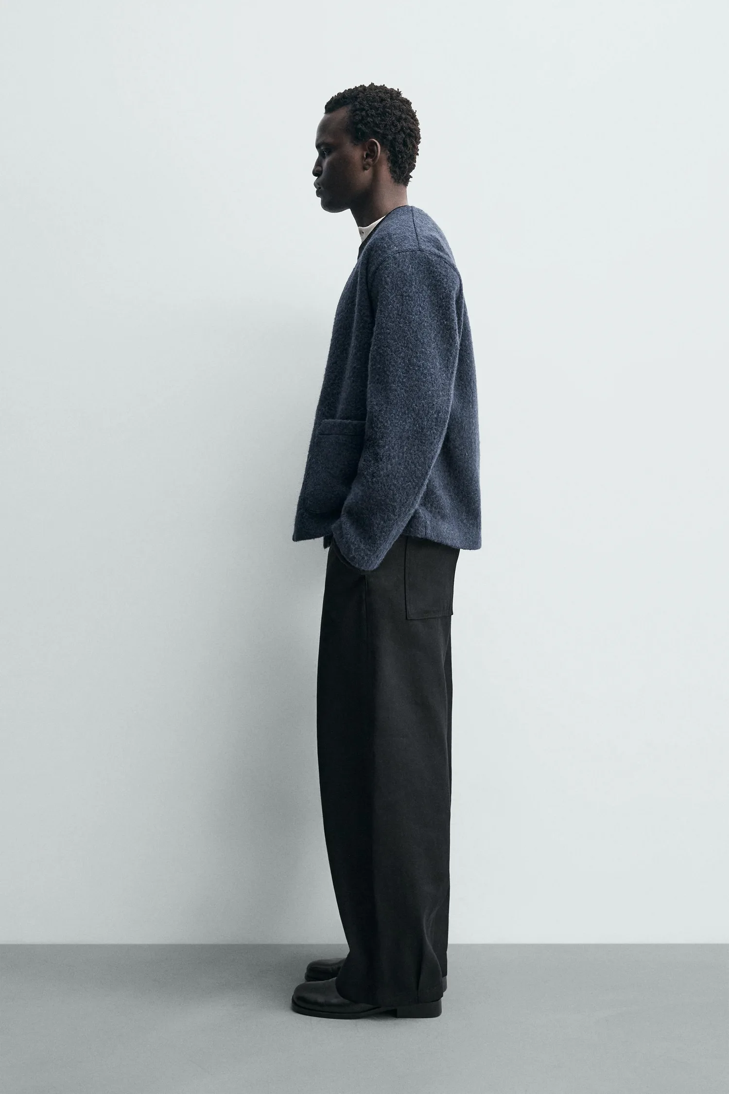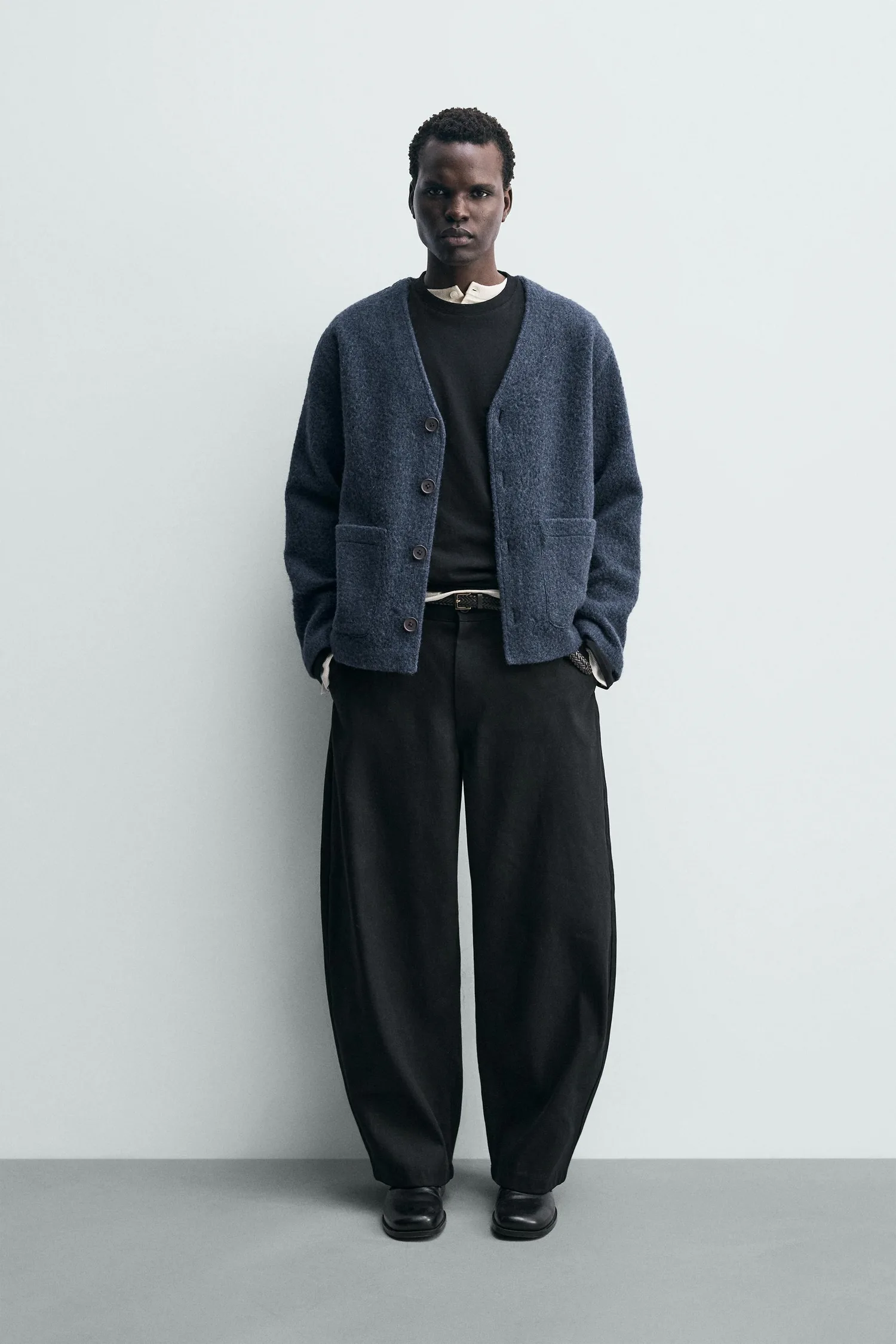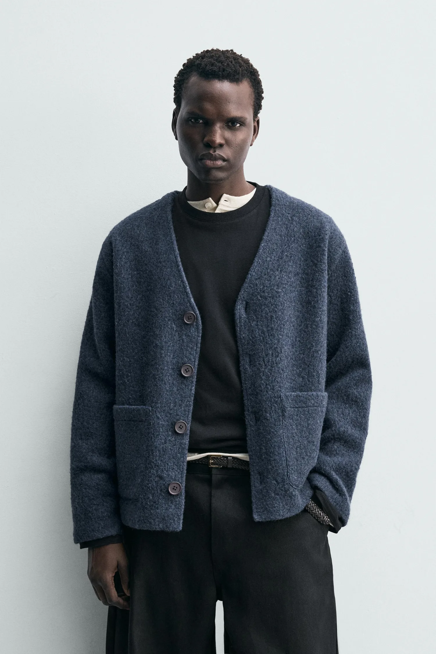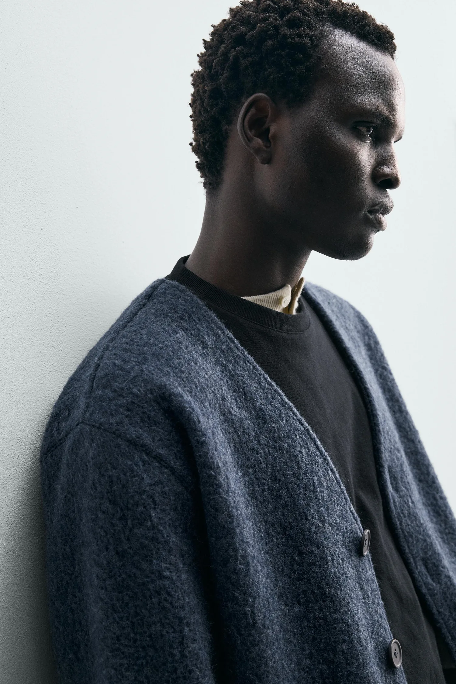 Кардиган свободного кроя из шерстяной ткани. С V-образным вырезом и длинными рукавами. Накладные карманы на бедрах. Застежка на пуговицы спереди.