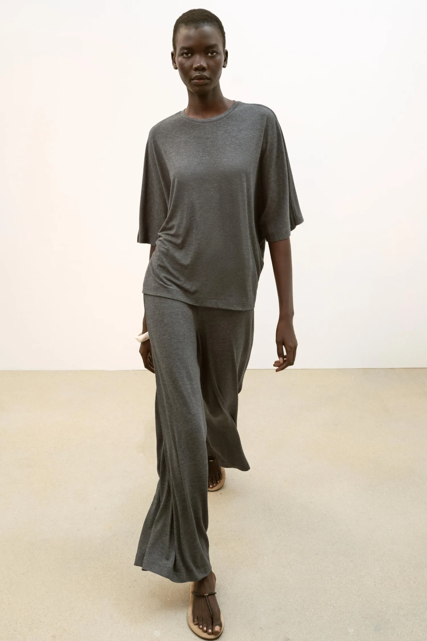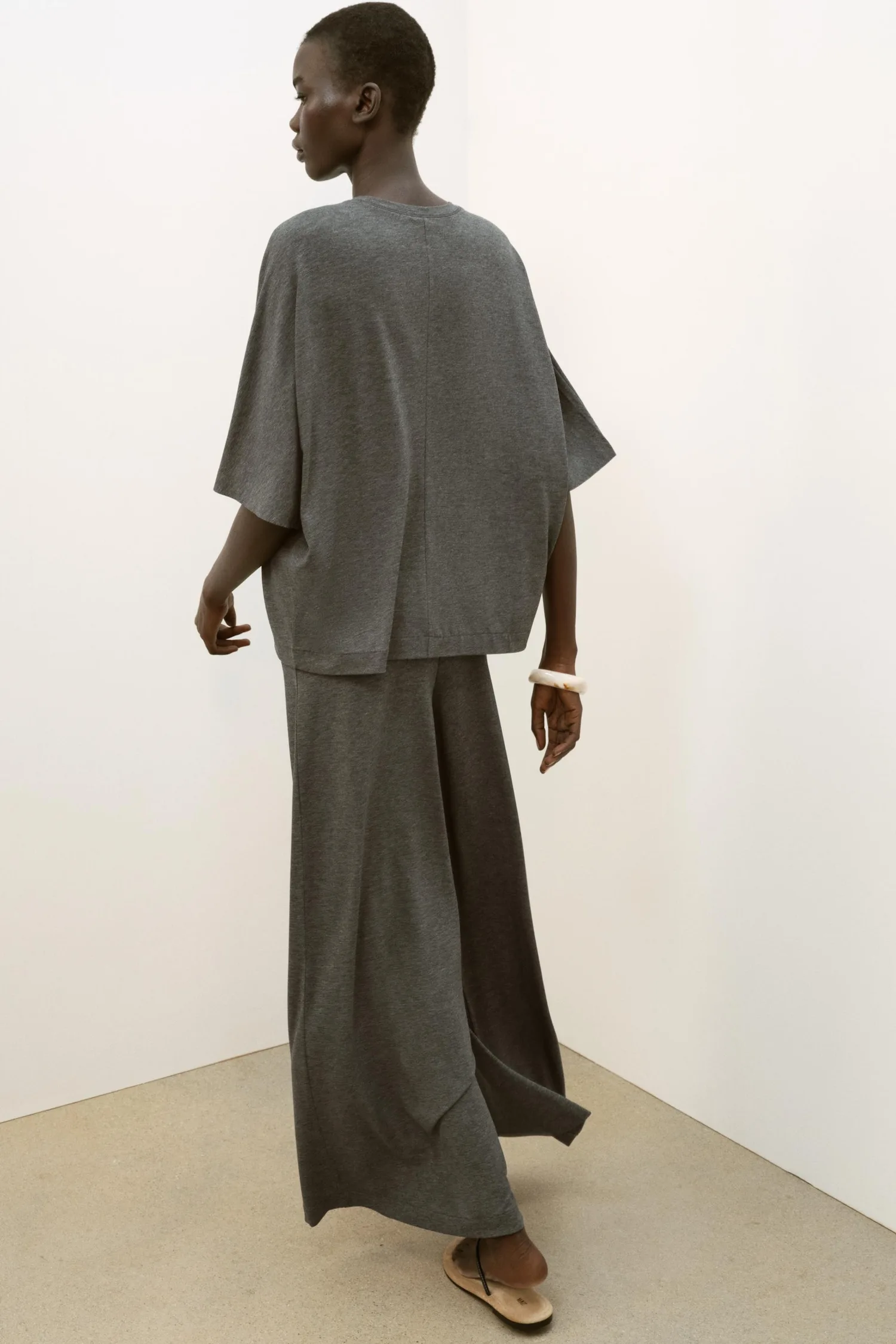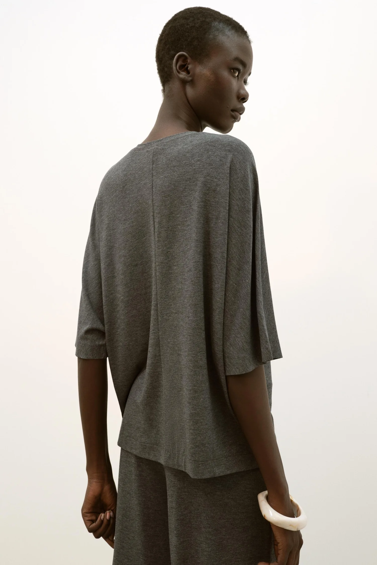 Топ из струящейся ткани с круглым вырезом. Рукава "летучая мышь" с термосварными швами.