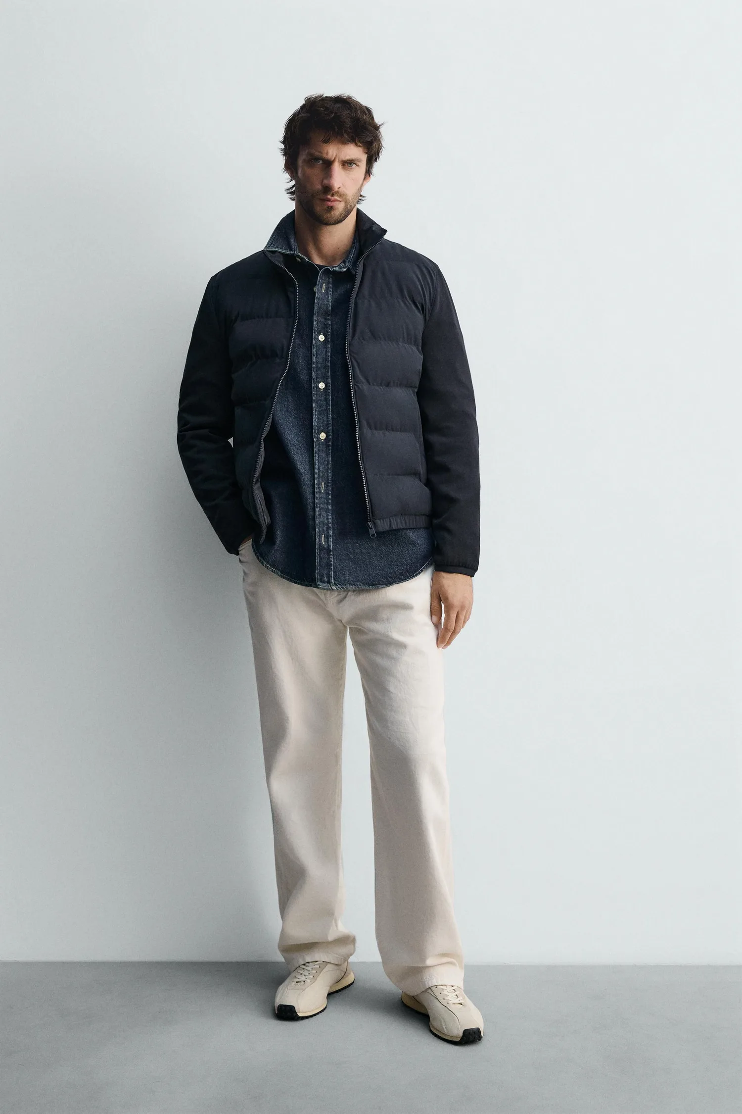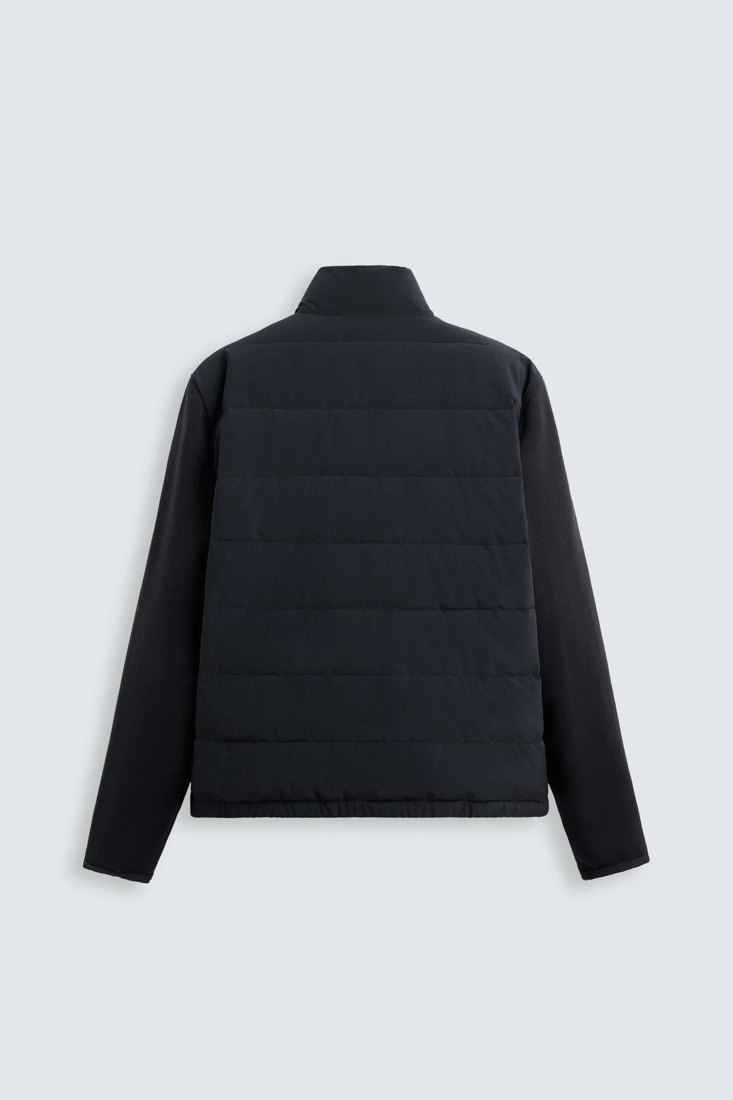 Стеганая куртка с высоким воротником. Длинные рукава из эластичной ткани. Имеет боковые карманы, внутренний карман и эластичный низ. Застежка-молния спереди.