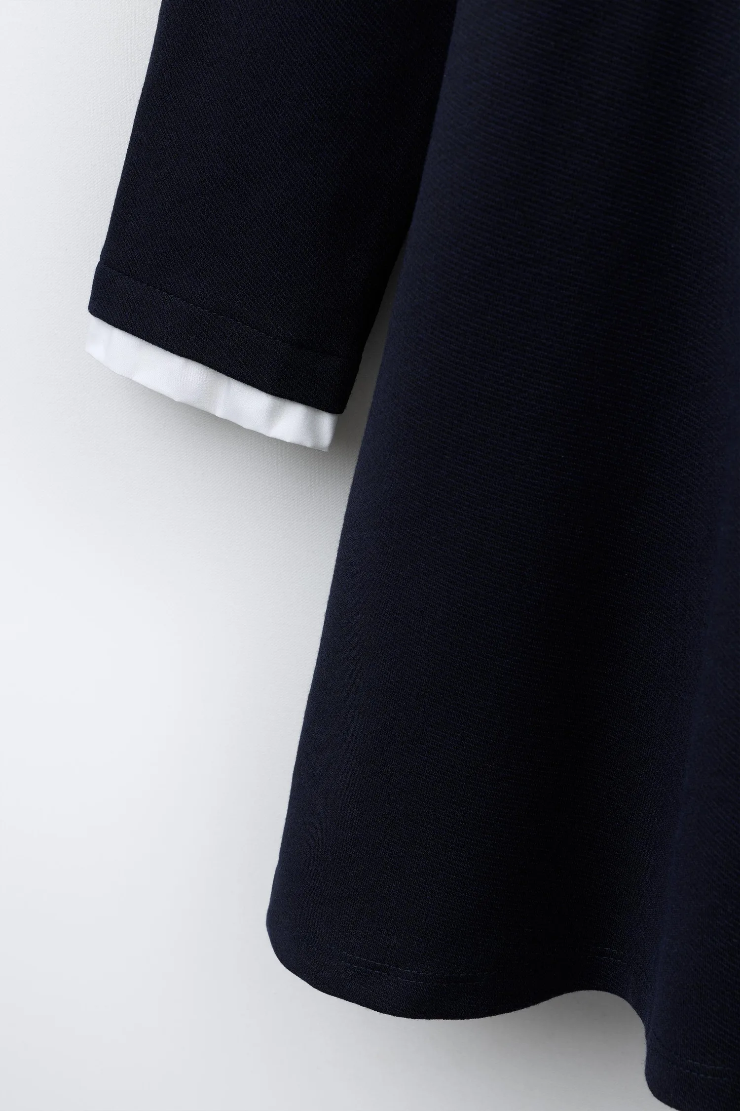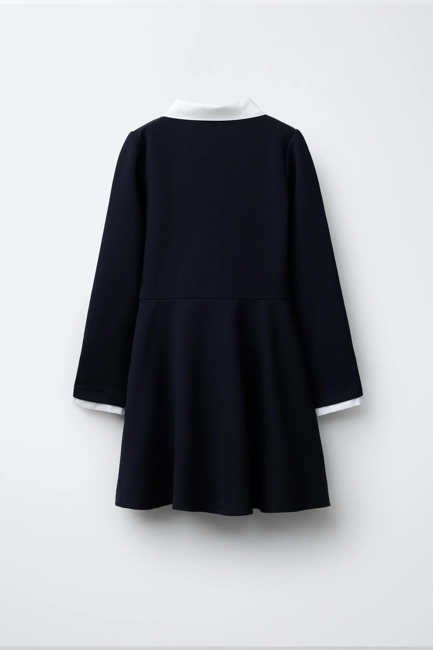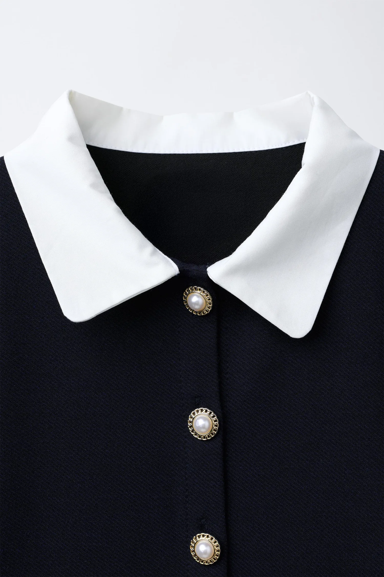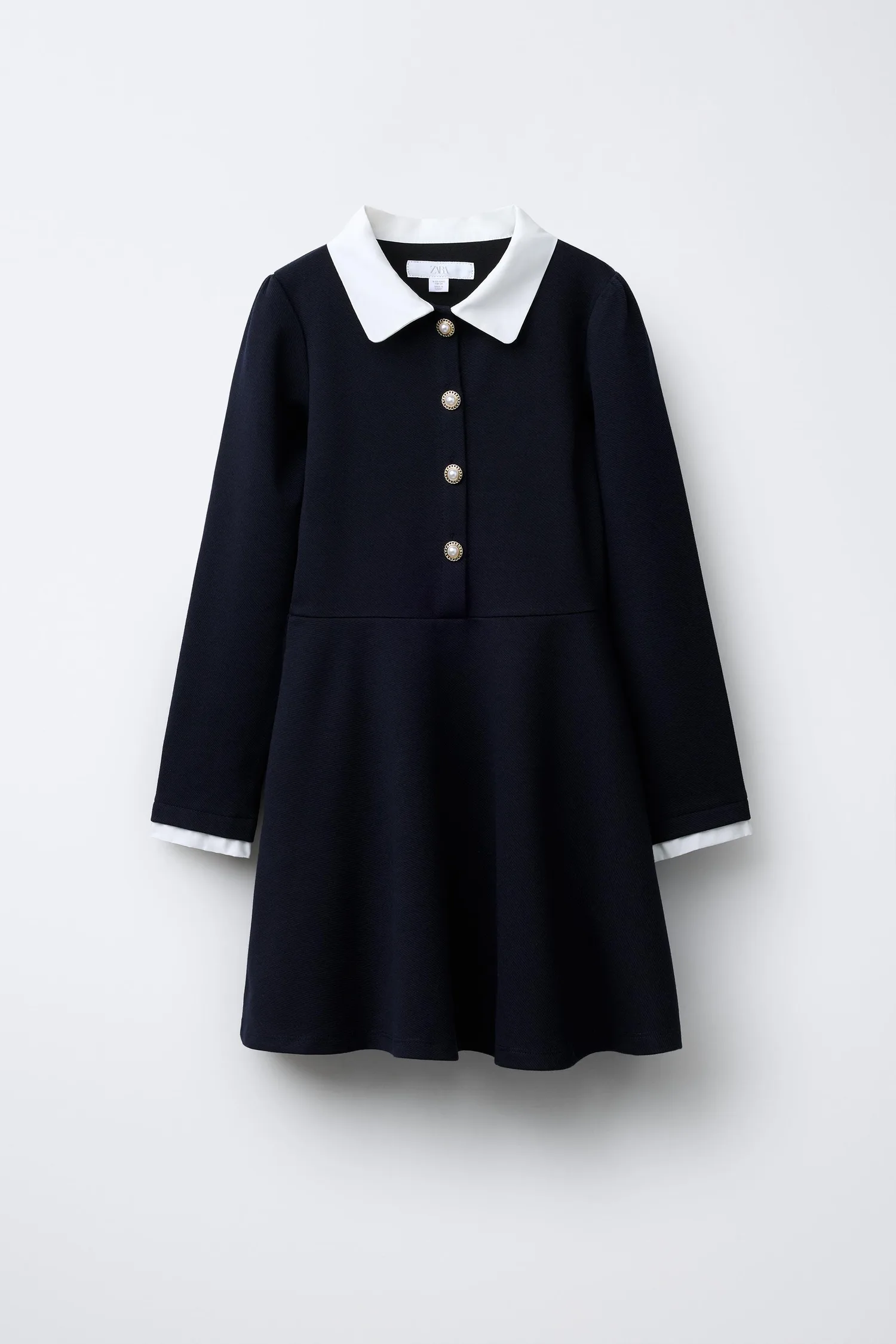 Платье с воротником-стойкой контрастного цвета и длинными рукавами. Застежка на пуговицы из искусственного жемчуга на кокетке спереди.