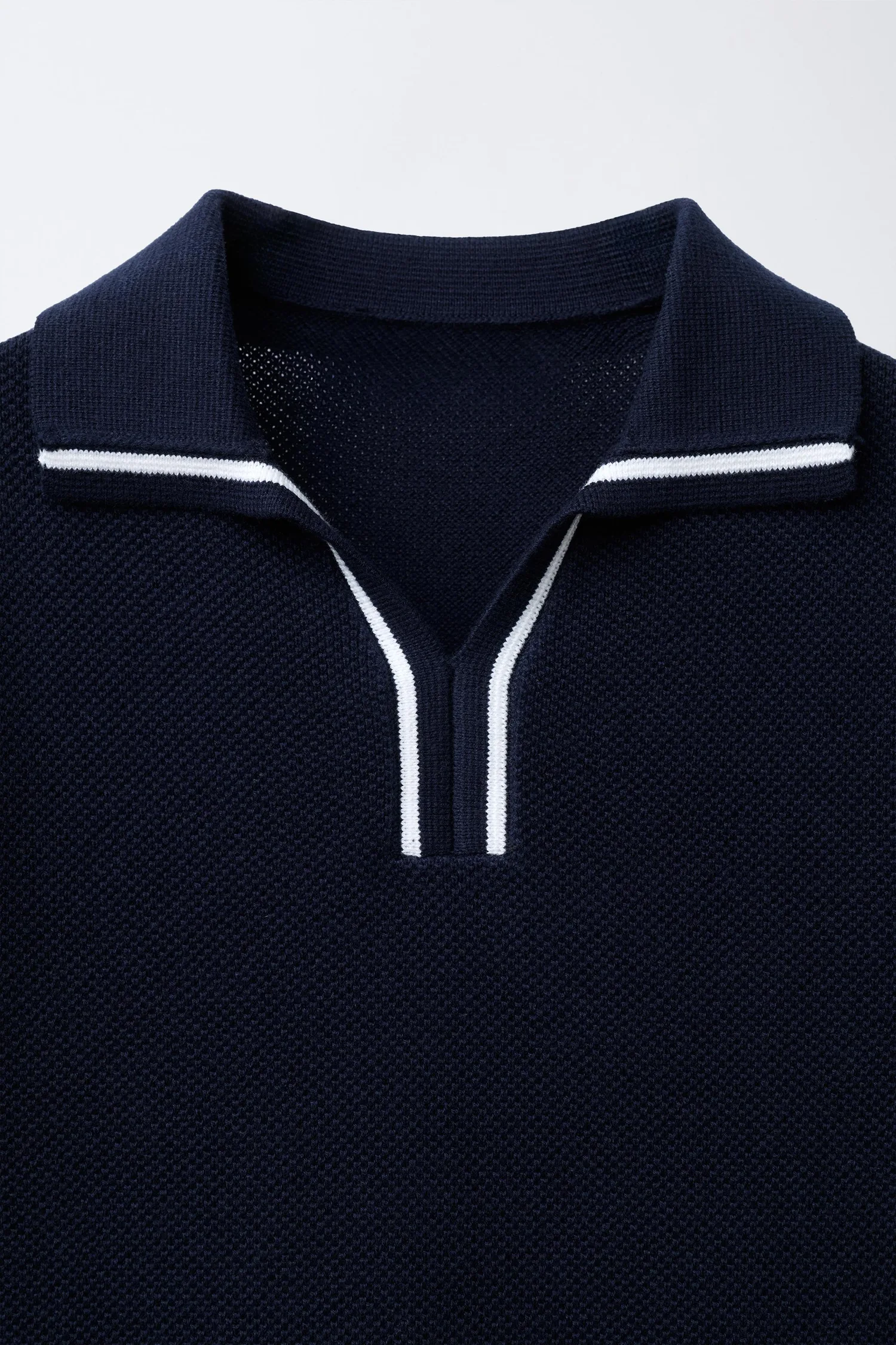 Вязаная рубашка-поло с воротником-поло и короткими рукавами. Контрастная полосатая отделка.