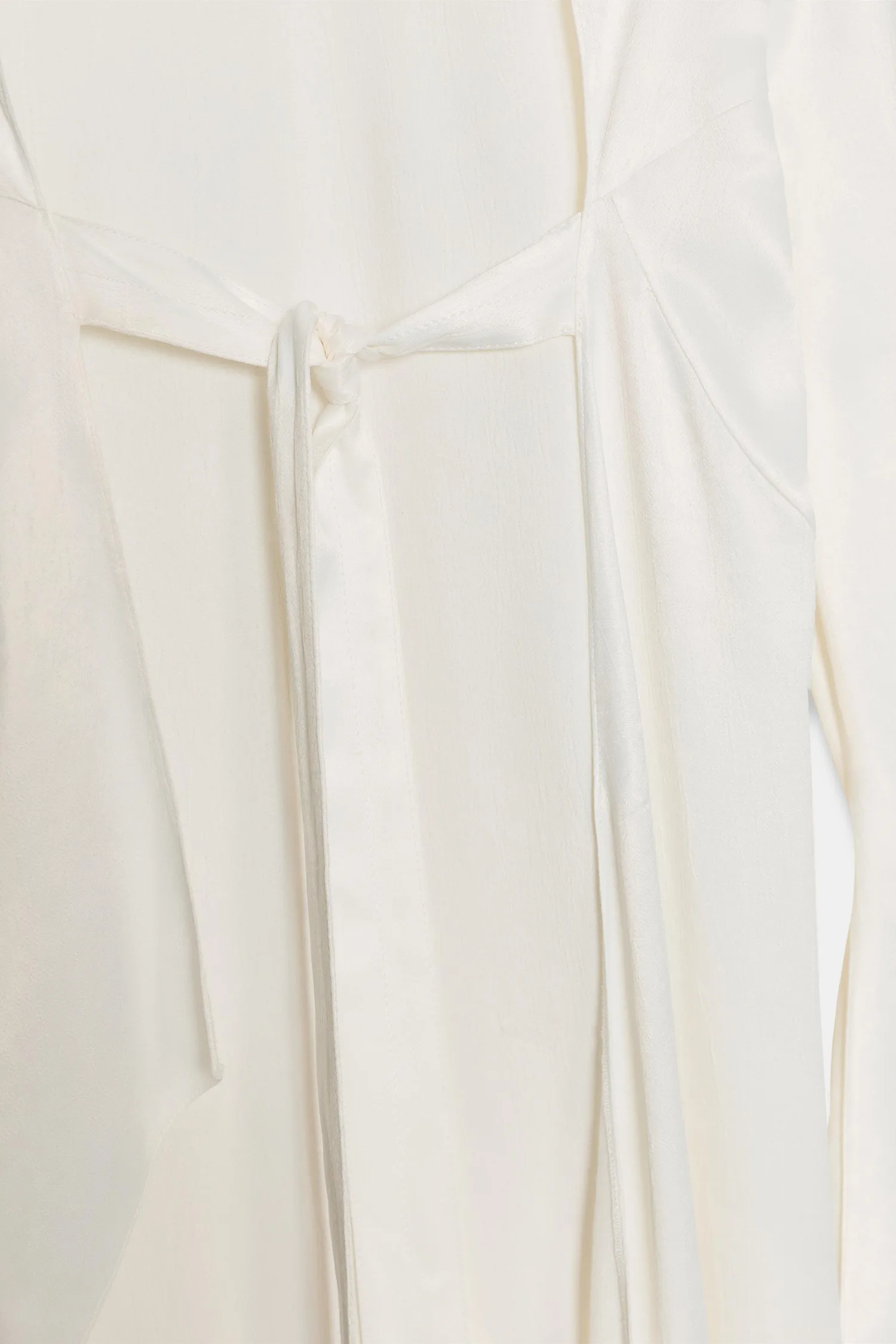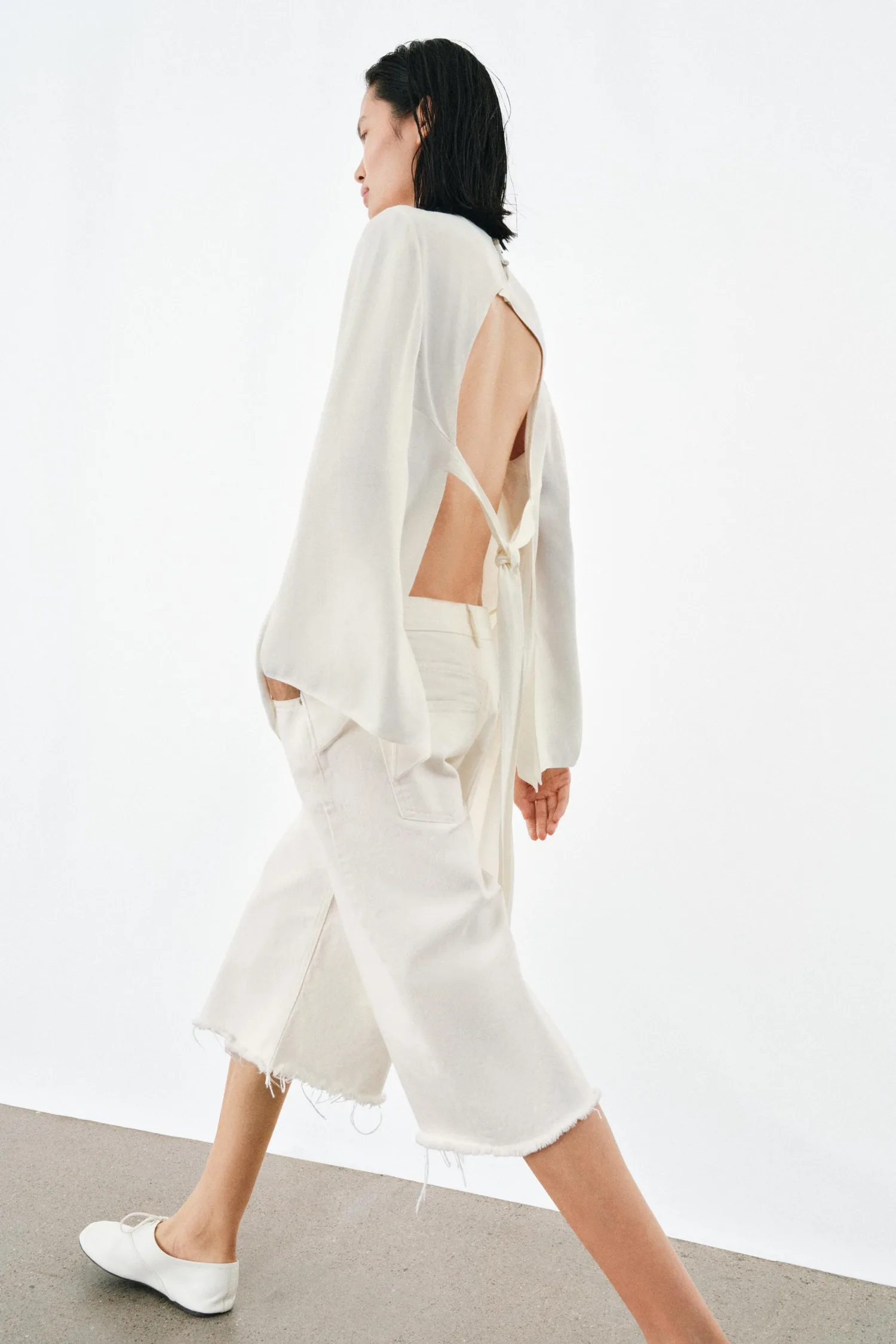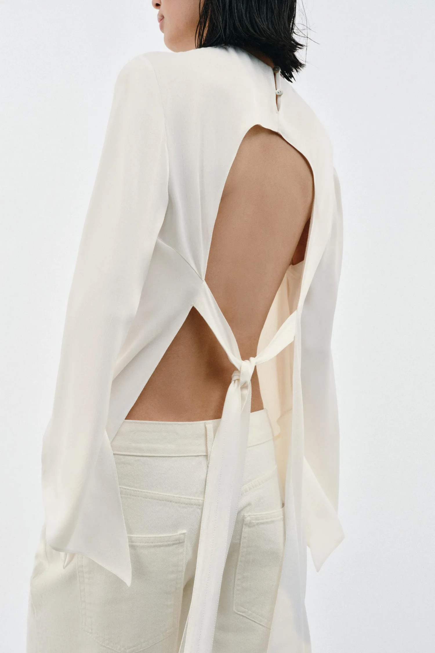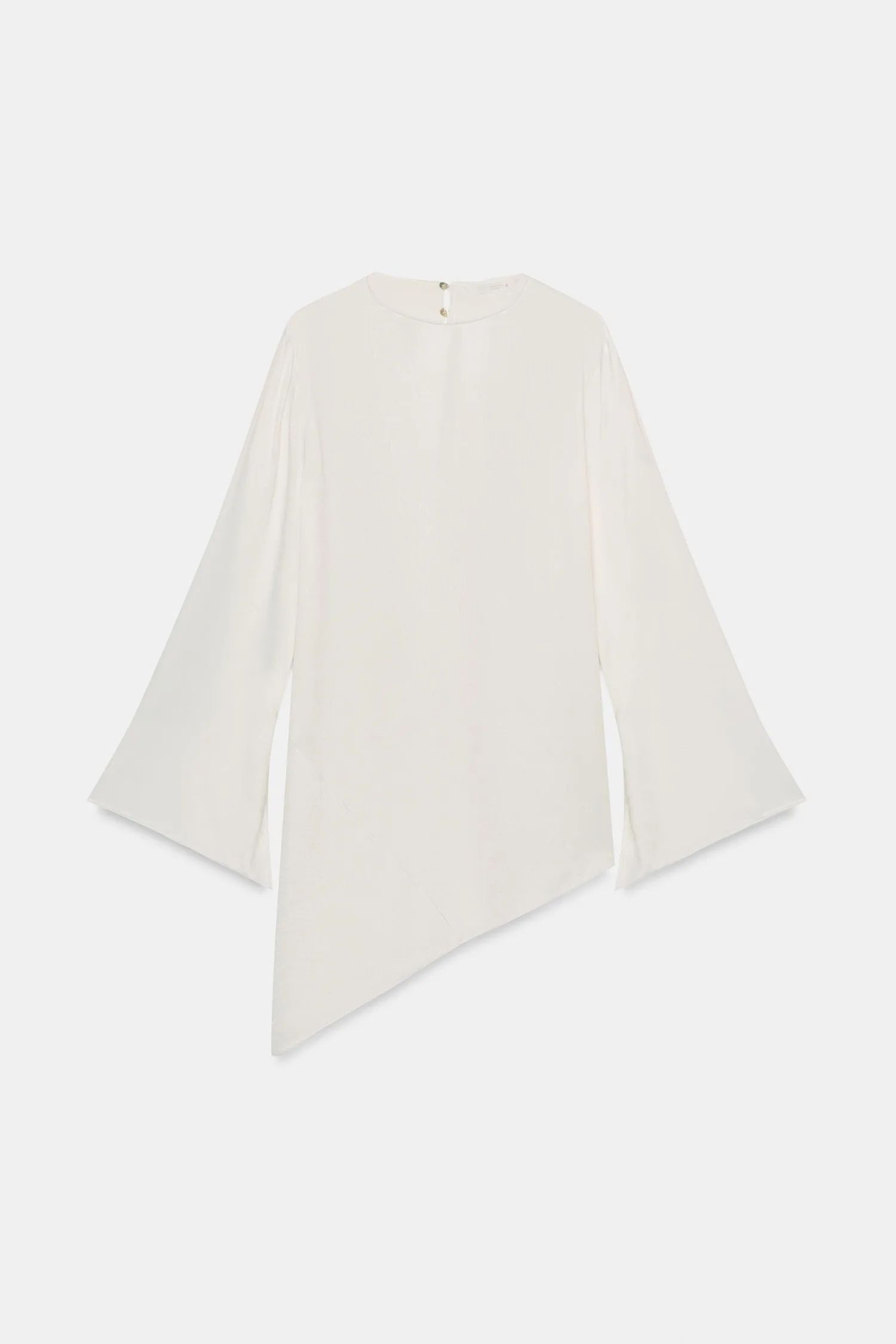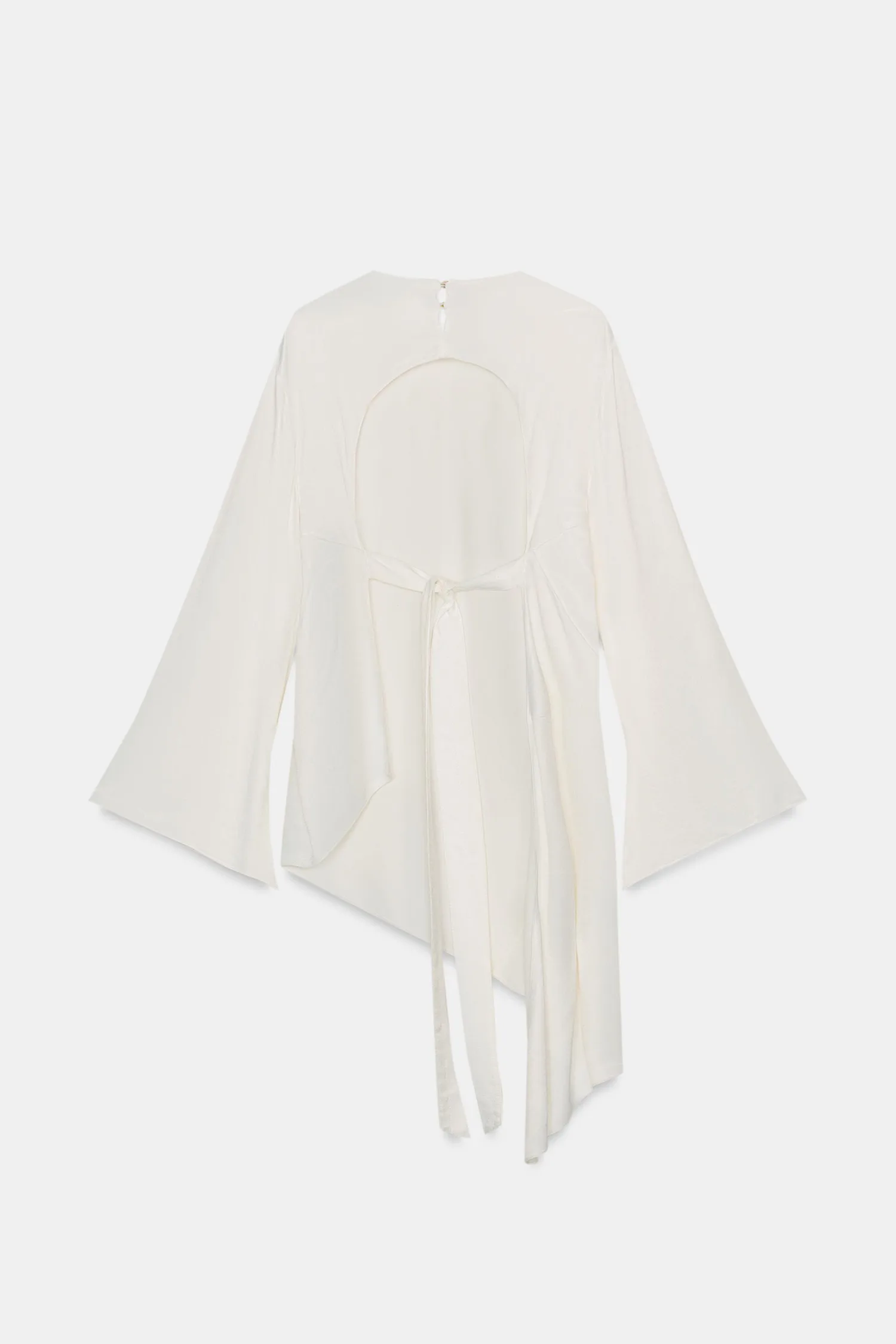 Топ из вискозной ткани. Круглый вырез и длинные рукава. Регулируемая открытая спинка с завязками. Асимметричный подол. Застежка на спине на пуговицах.