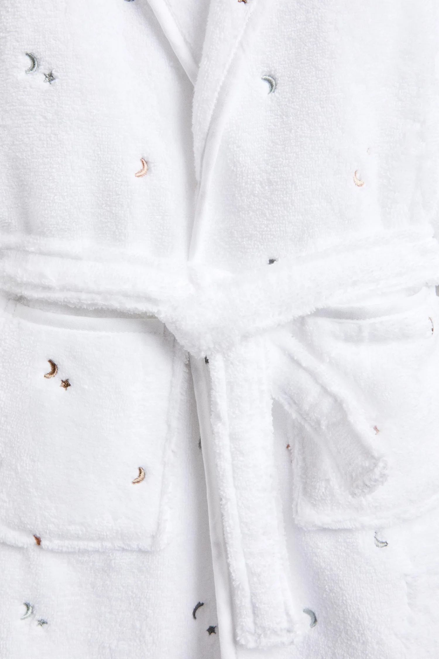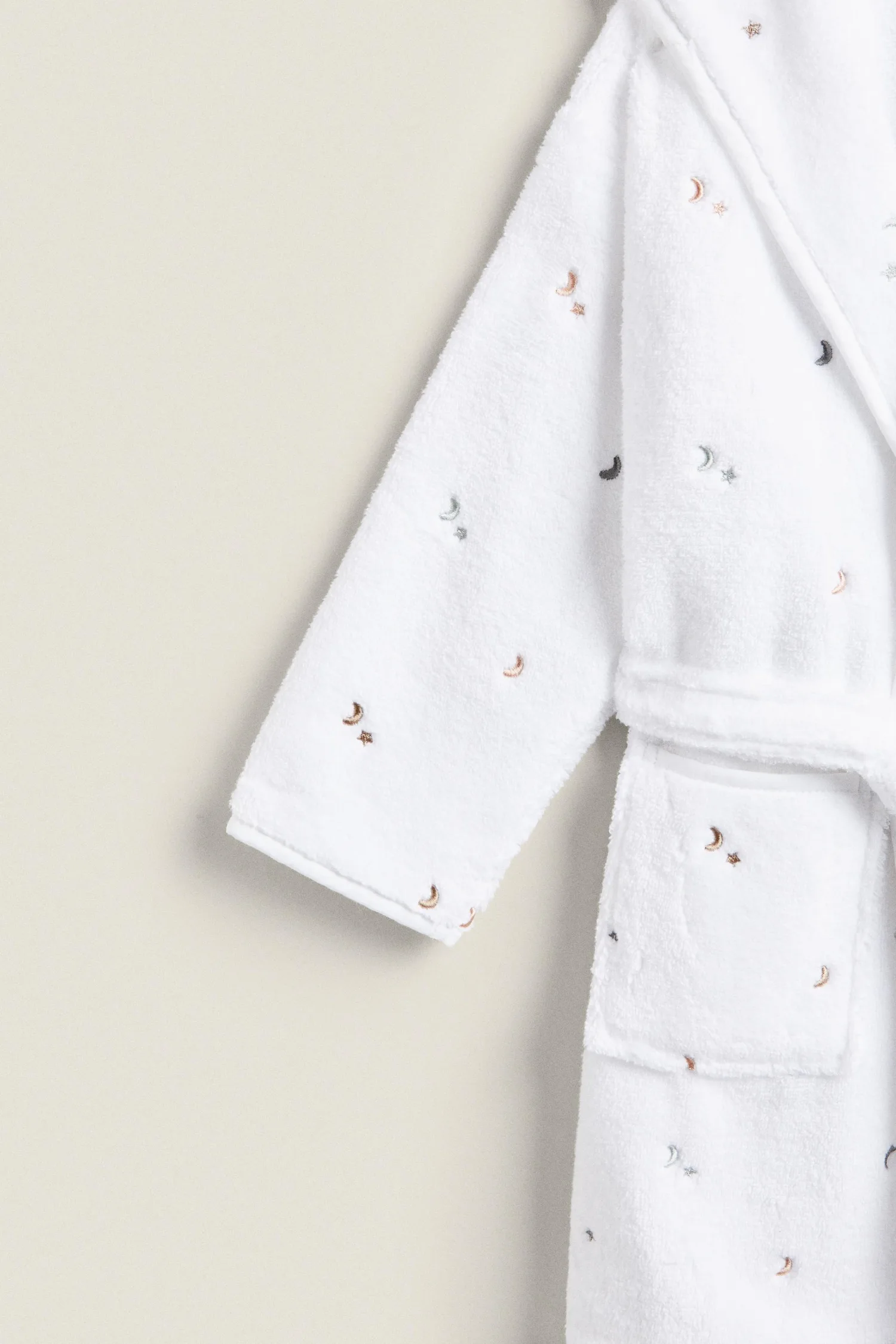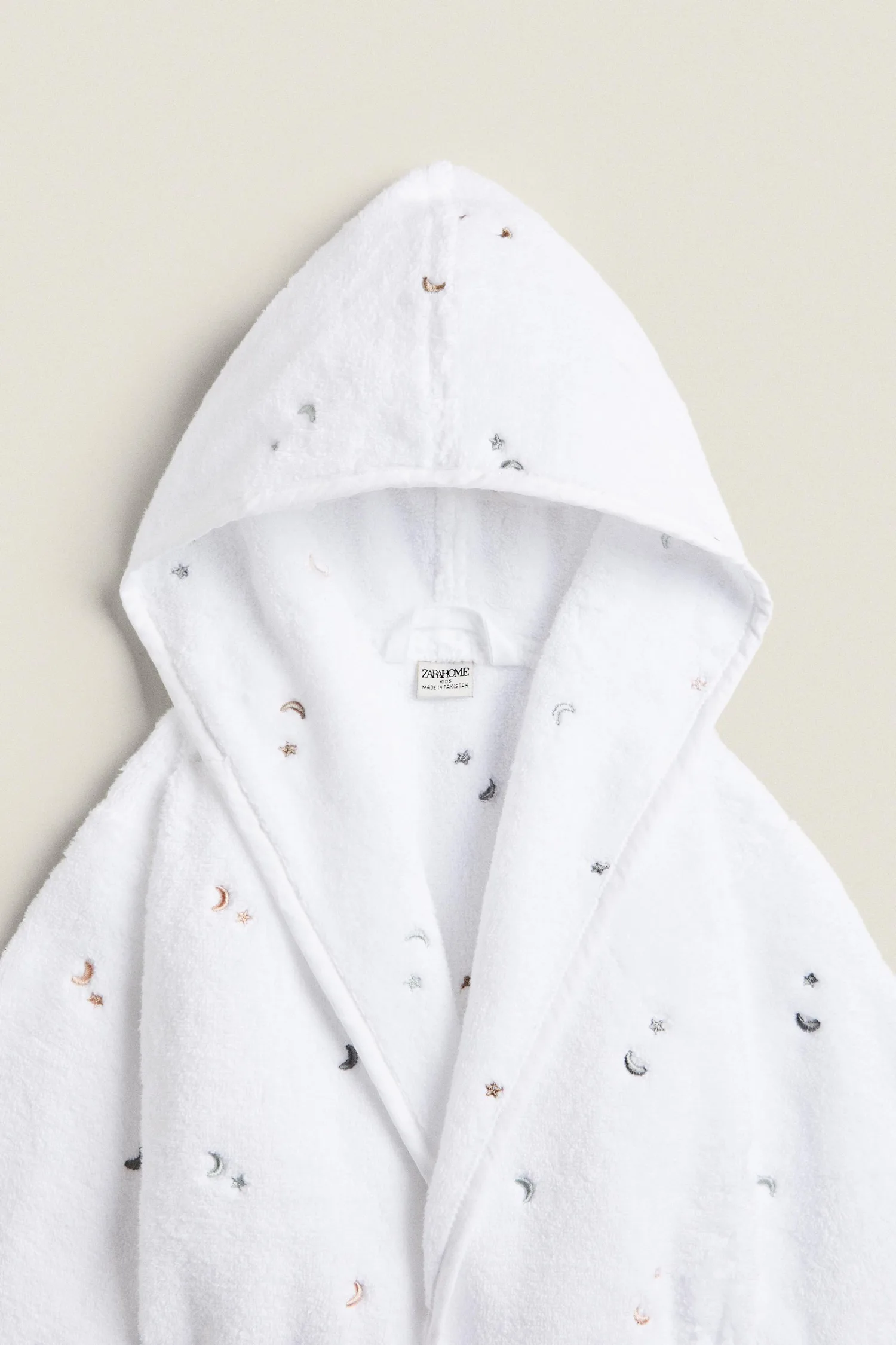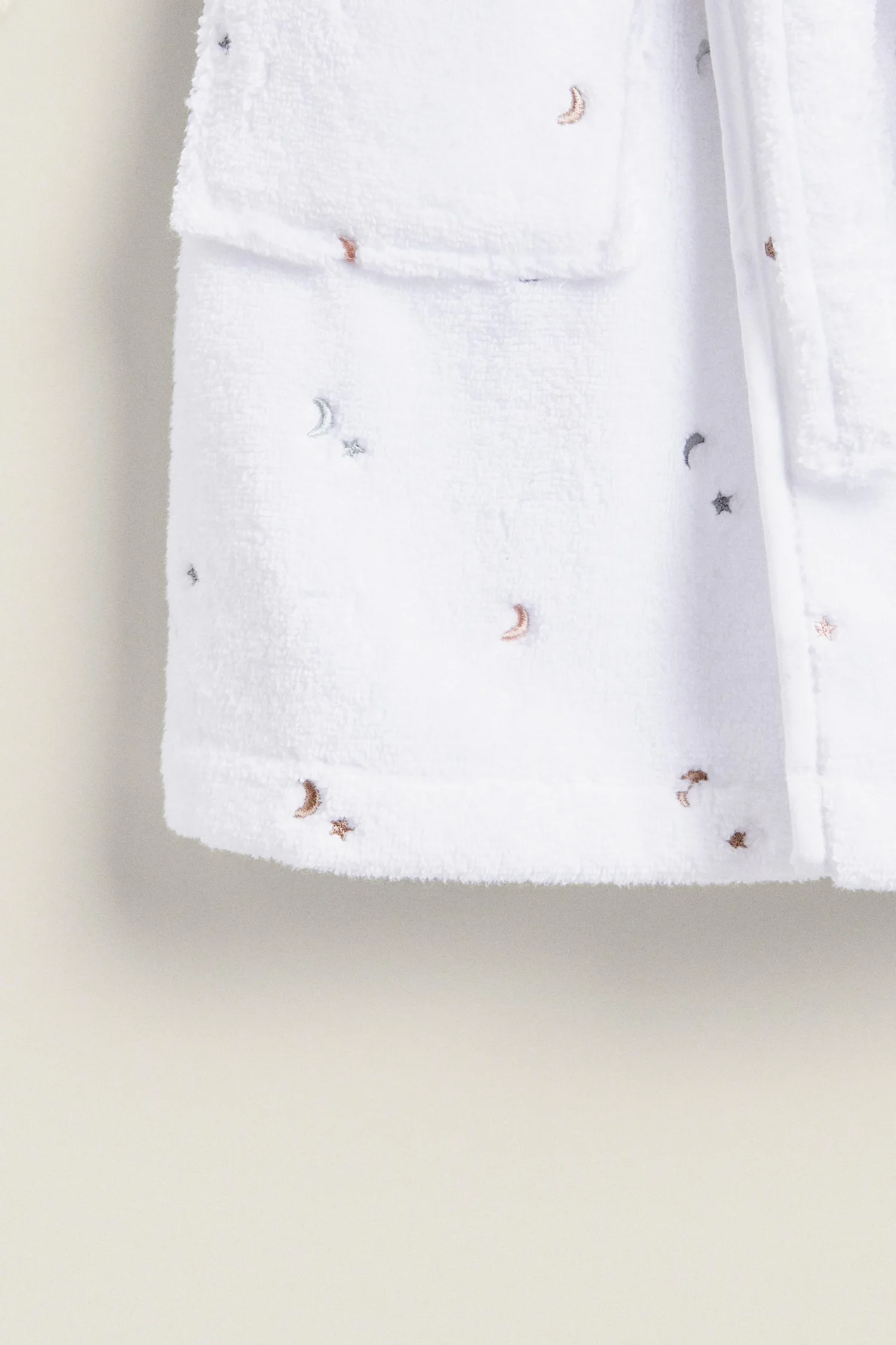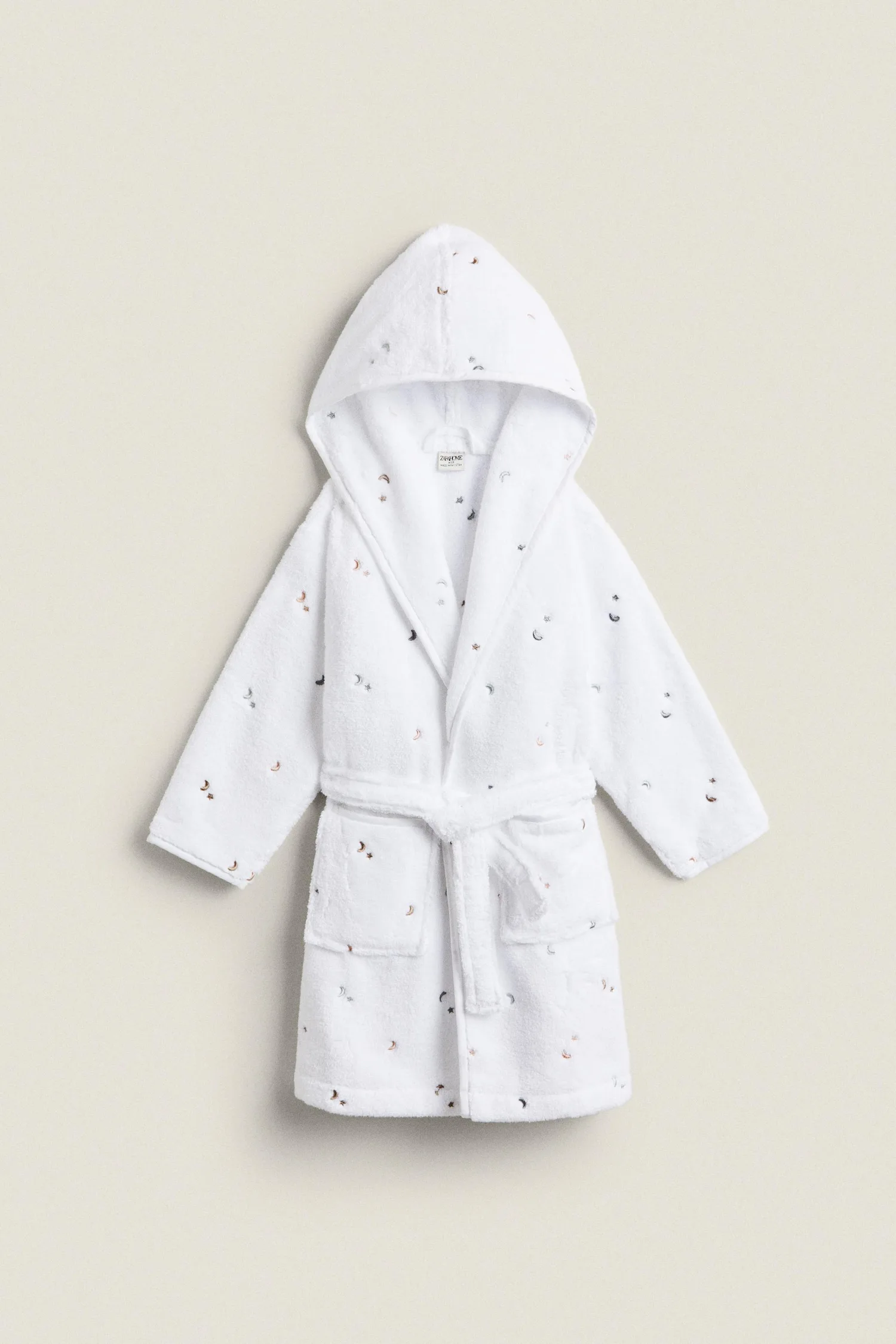 Детский белый банный халат из мягкого хлопка с капюшоном, украшенный вышитыми лунами и звездами.
