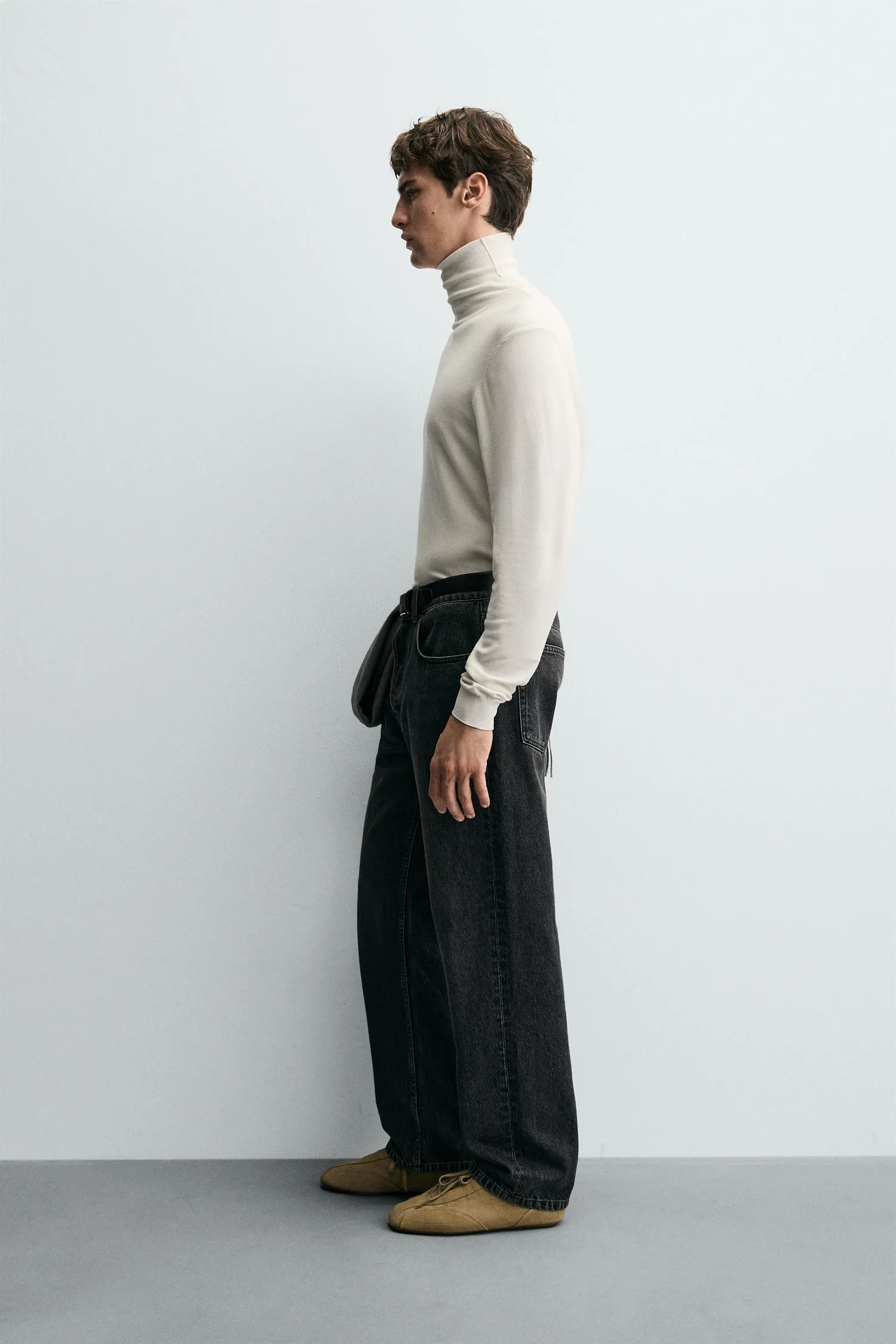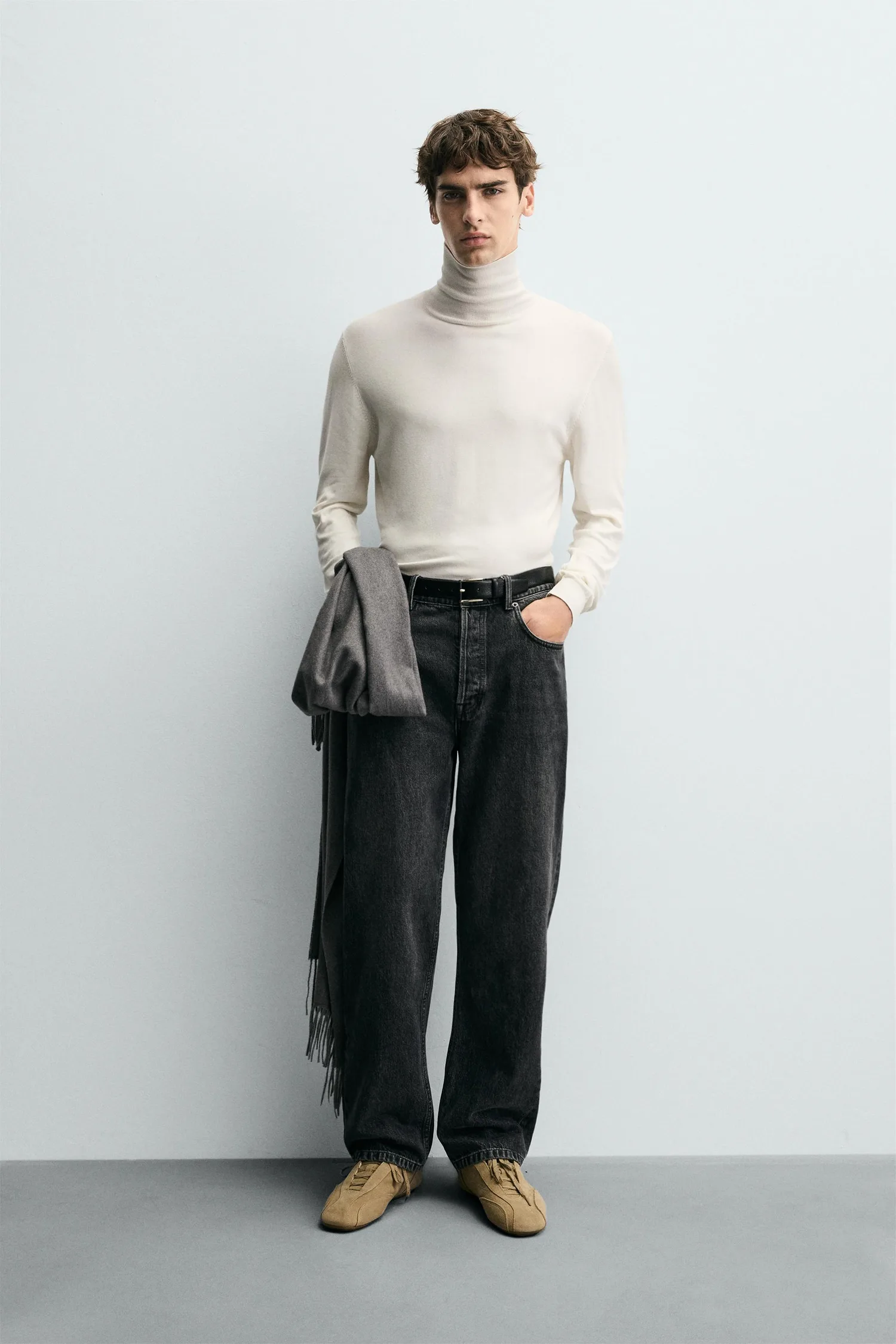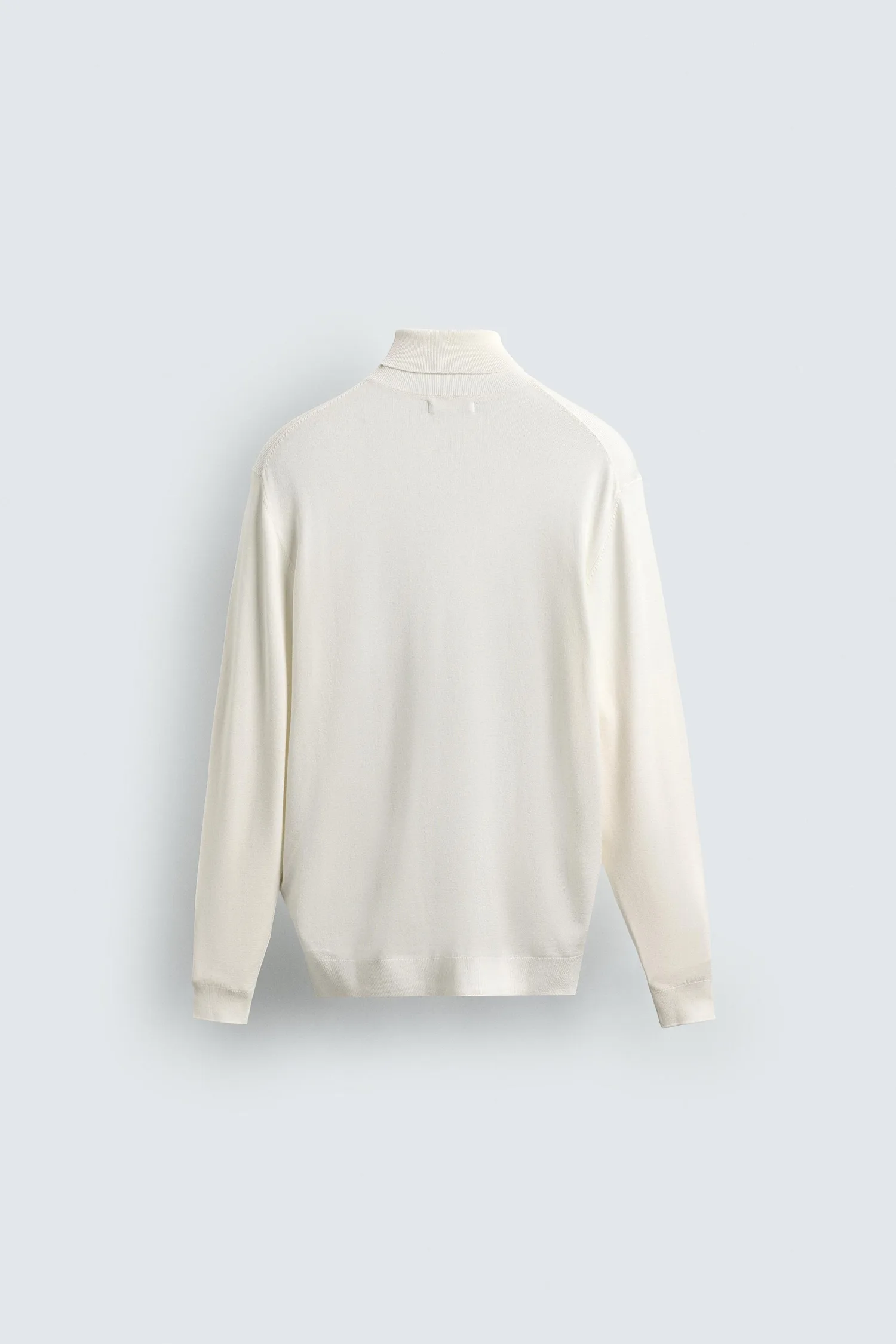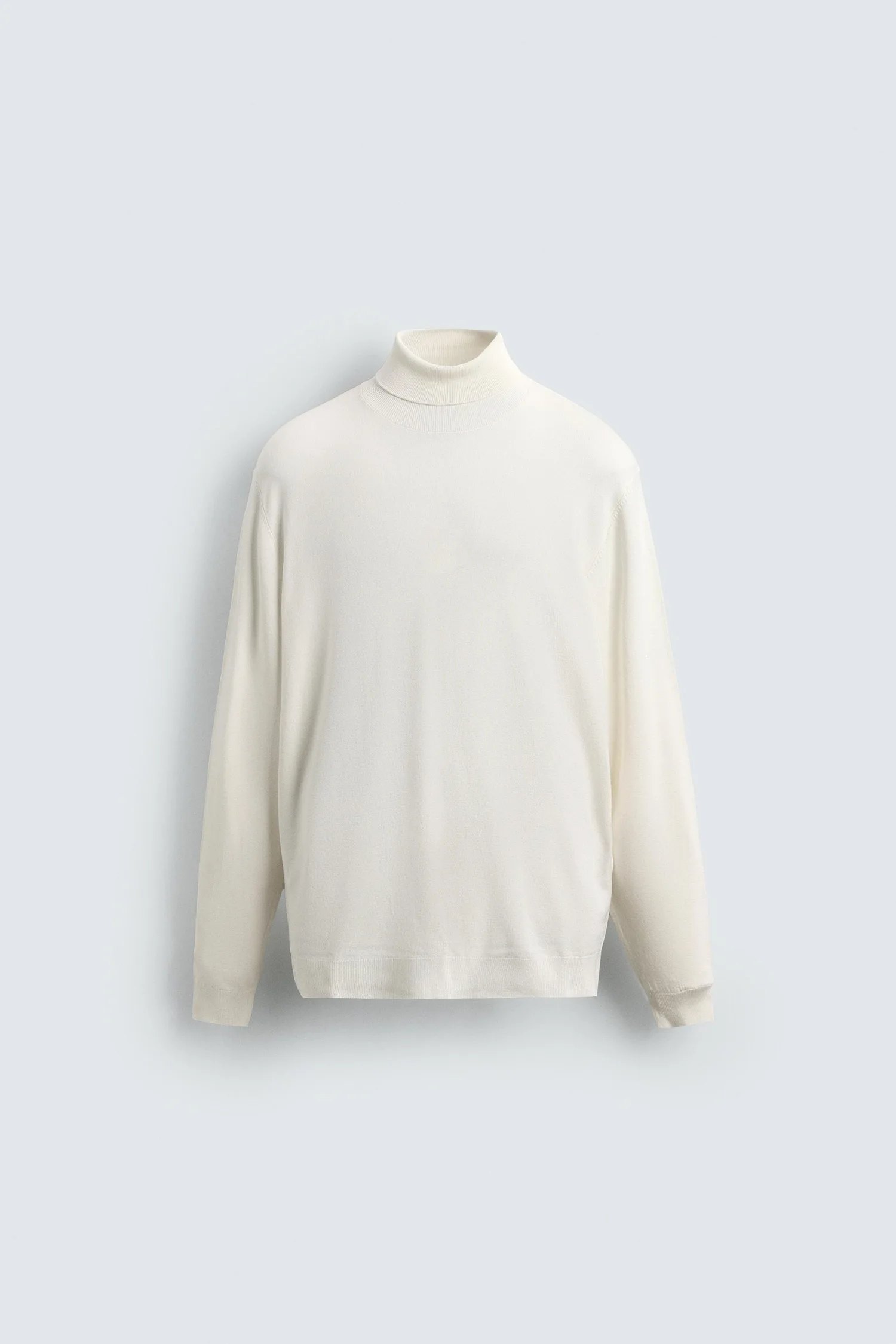 Свитер прямого кроя из вискозной пряжи. Высокий воротник и длинные рукава. Ребристая отделка.