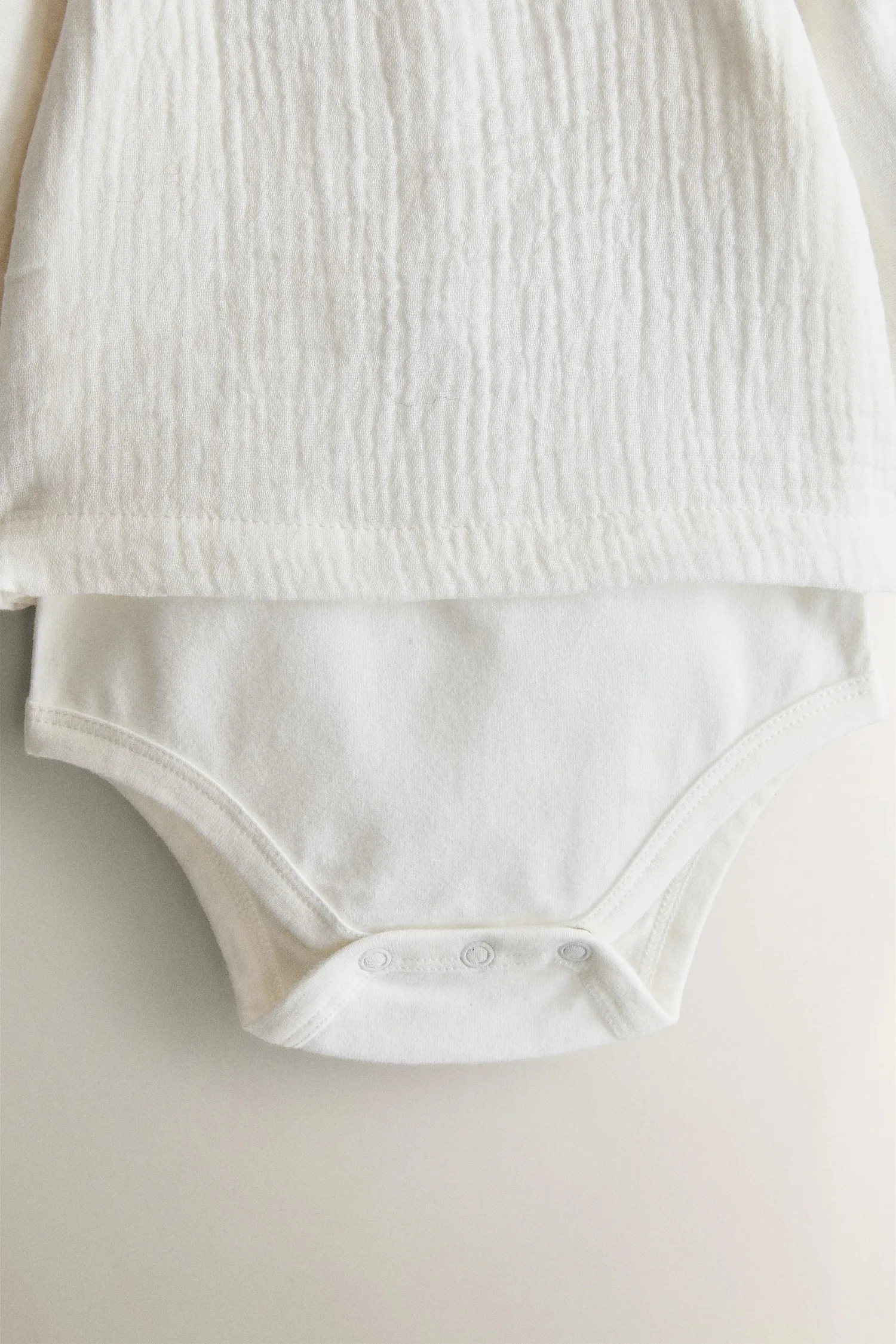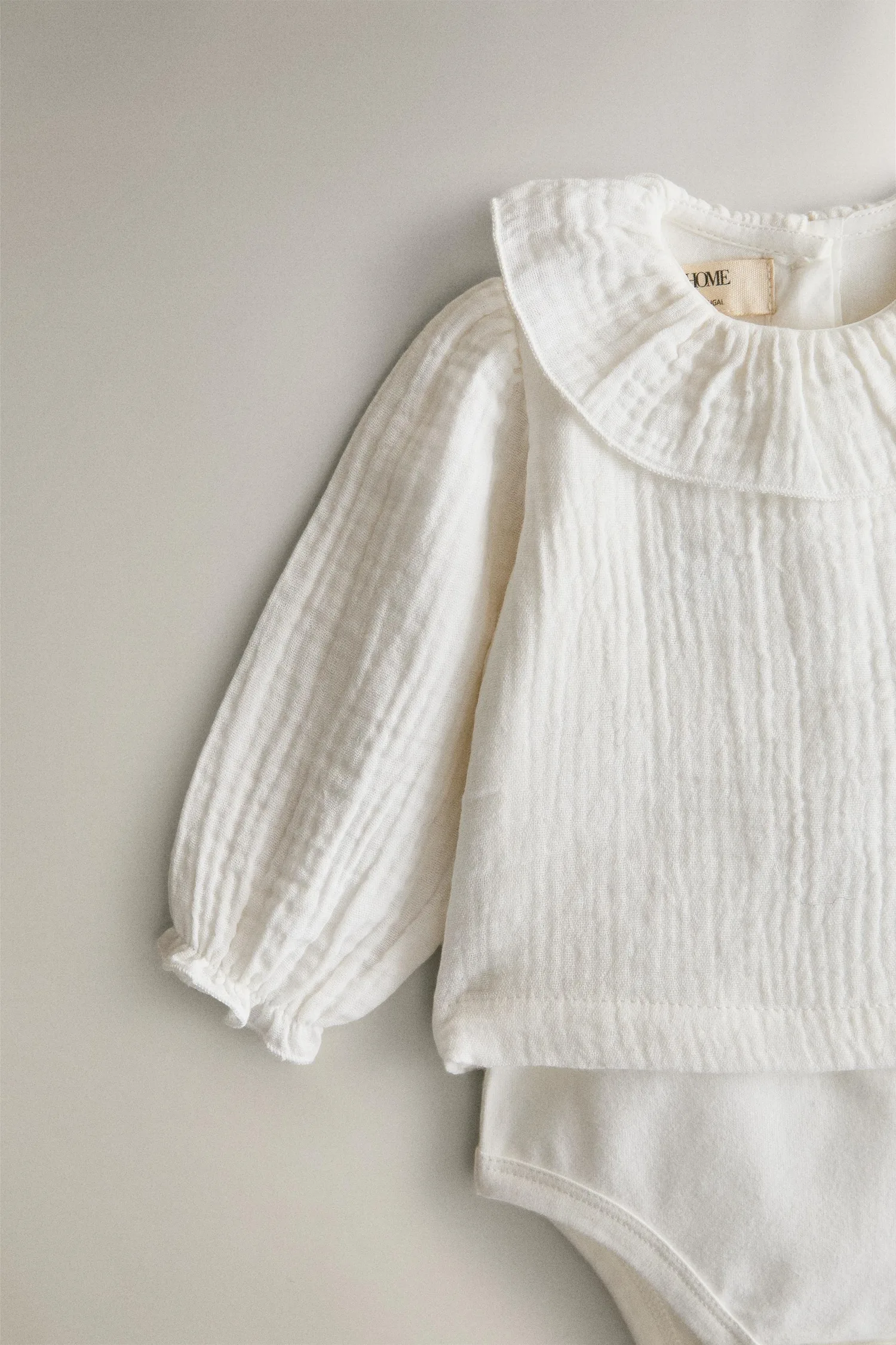 Белый муслиновый детский боди с рюшами на воротнике.