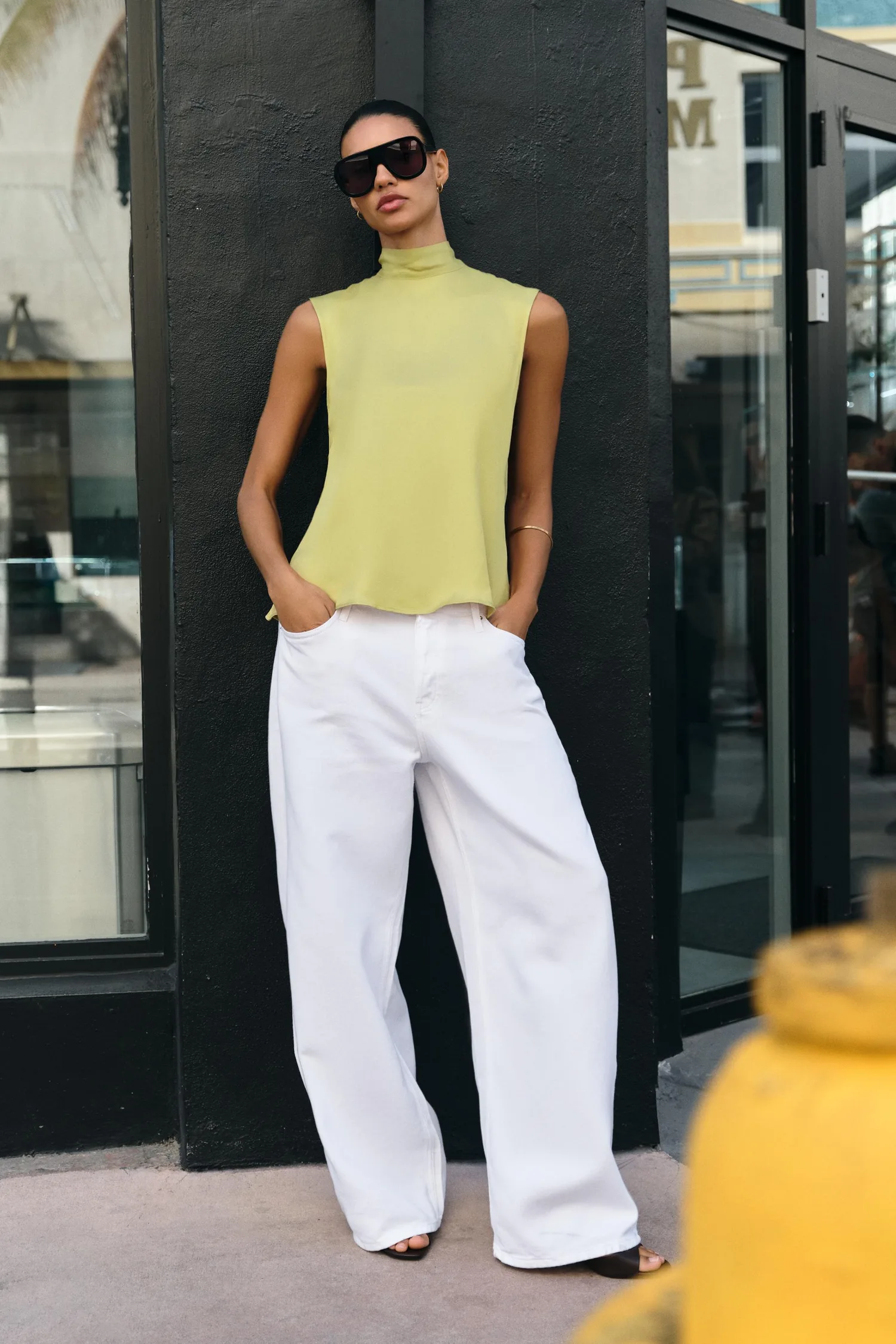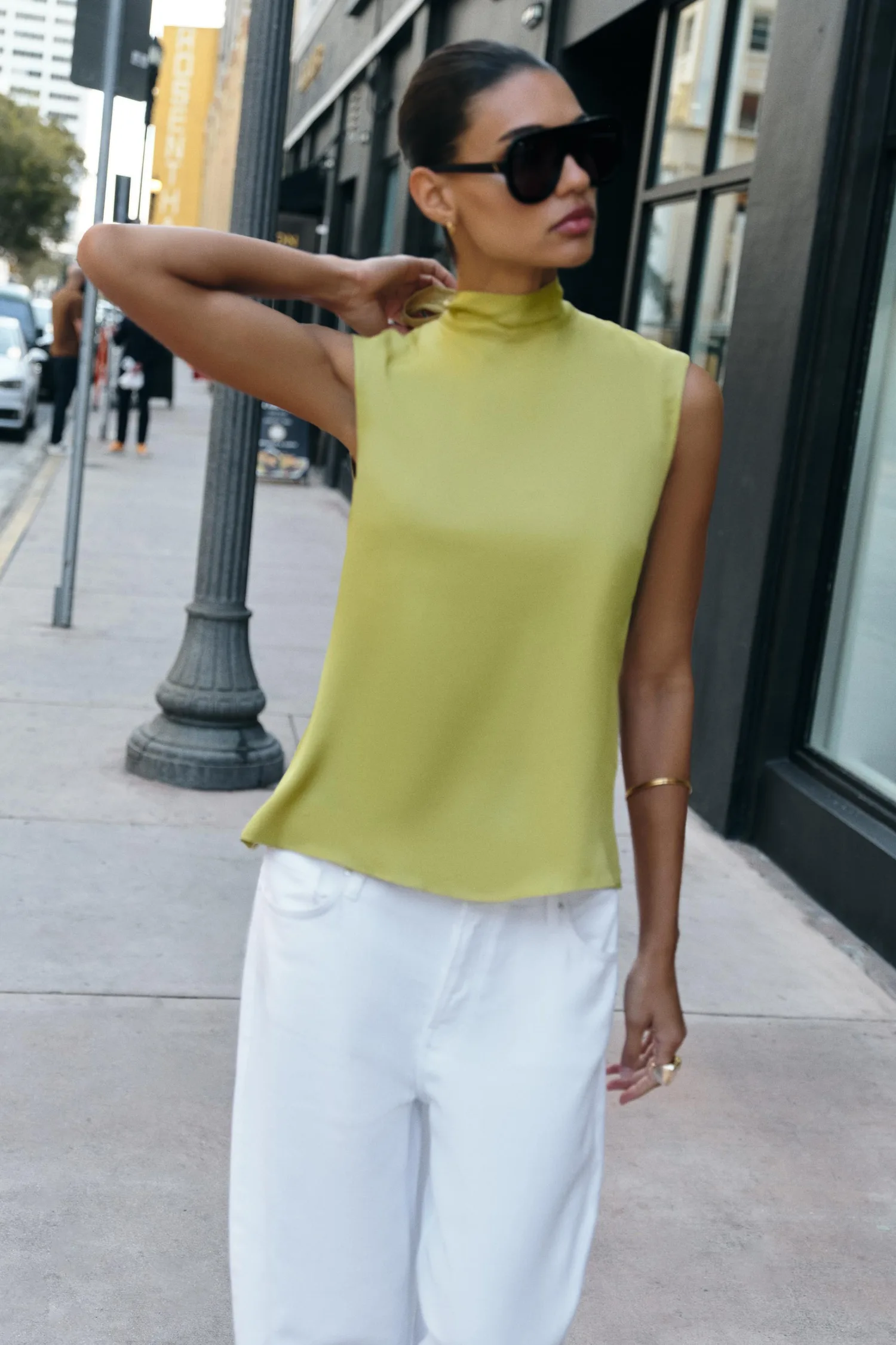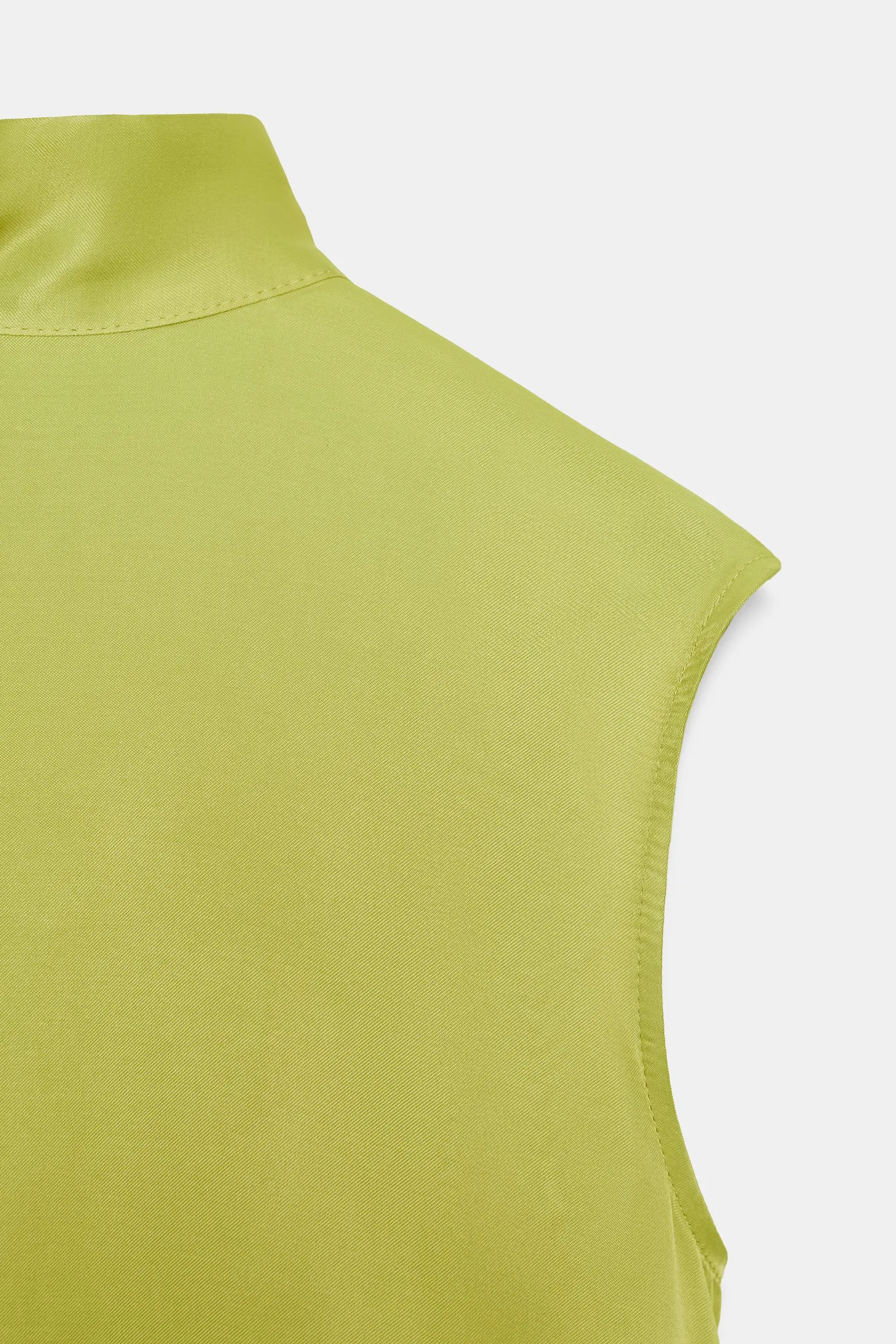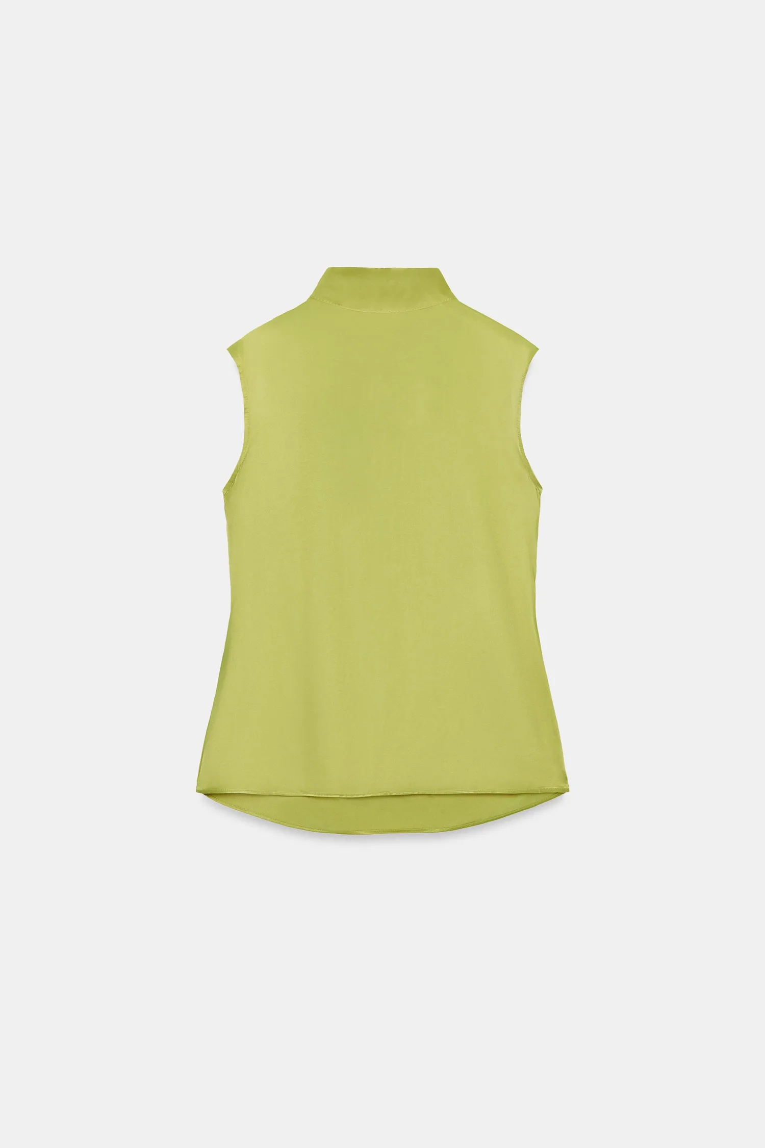 Топ без рукавов с высоким воротником и бантом на спине. Струящийся вырез на спине.