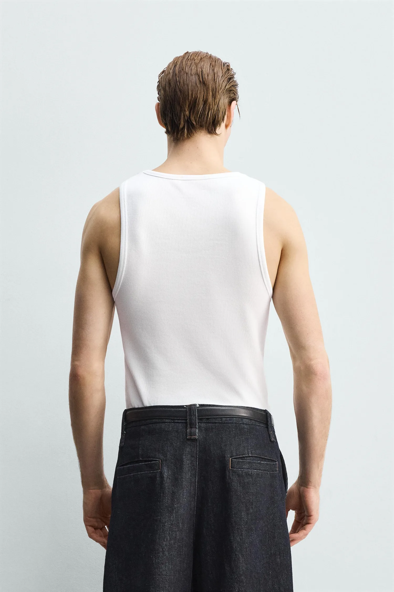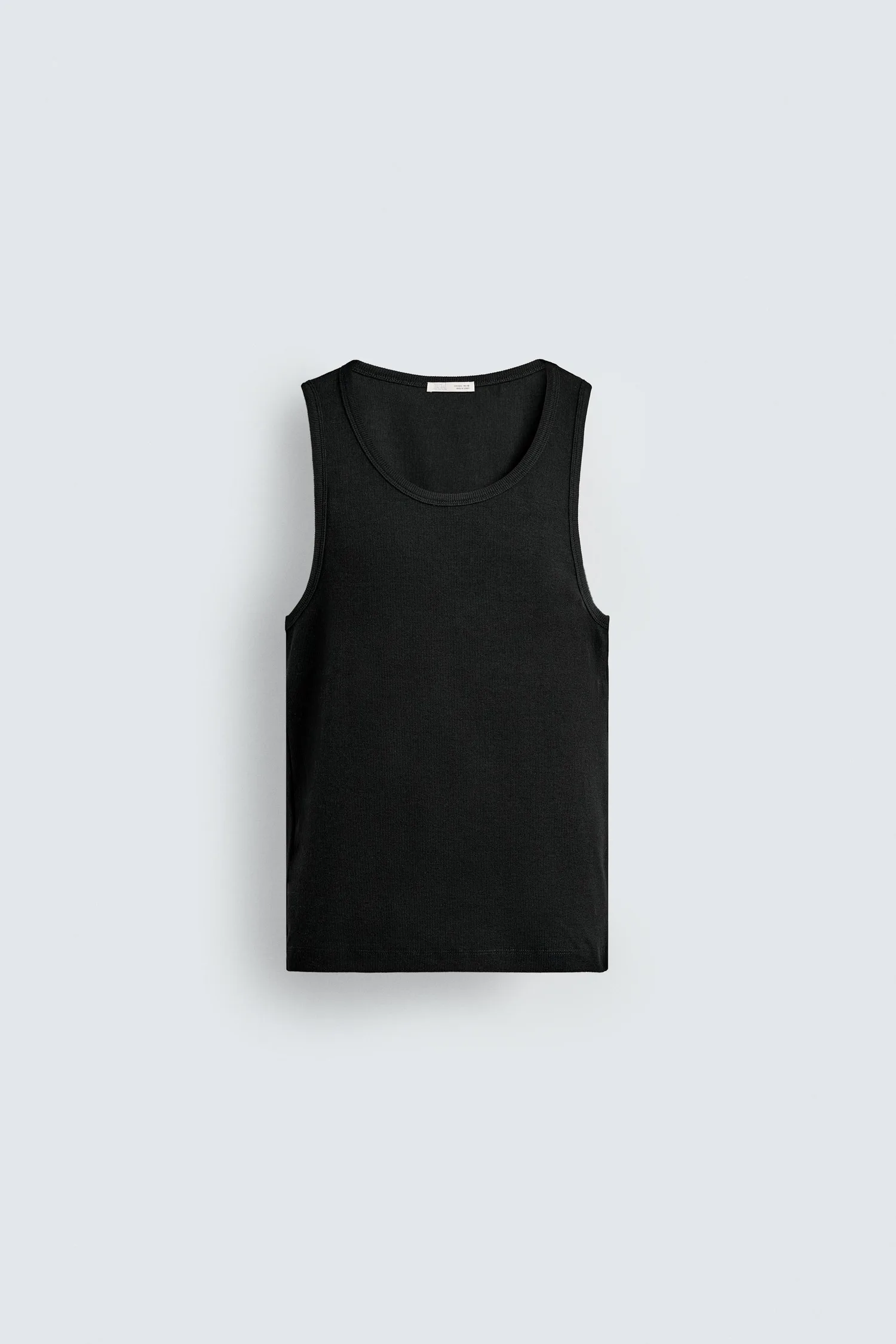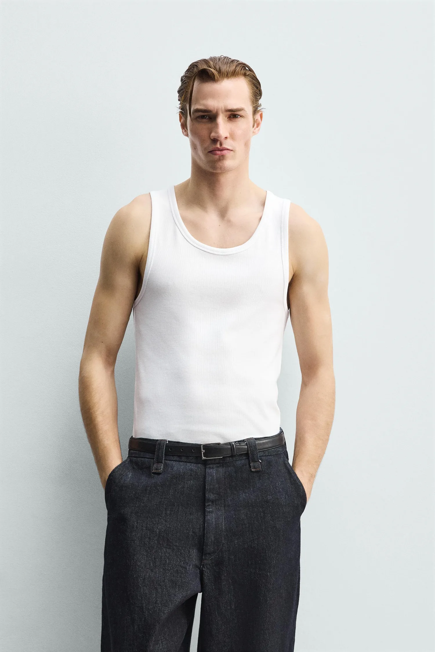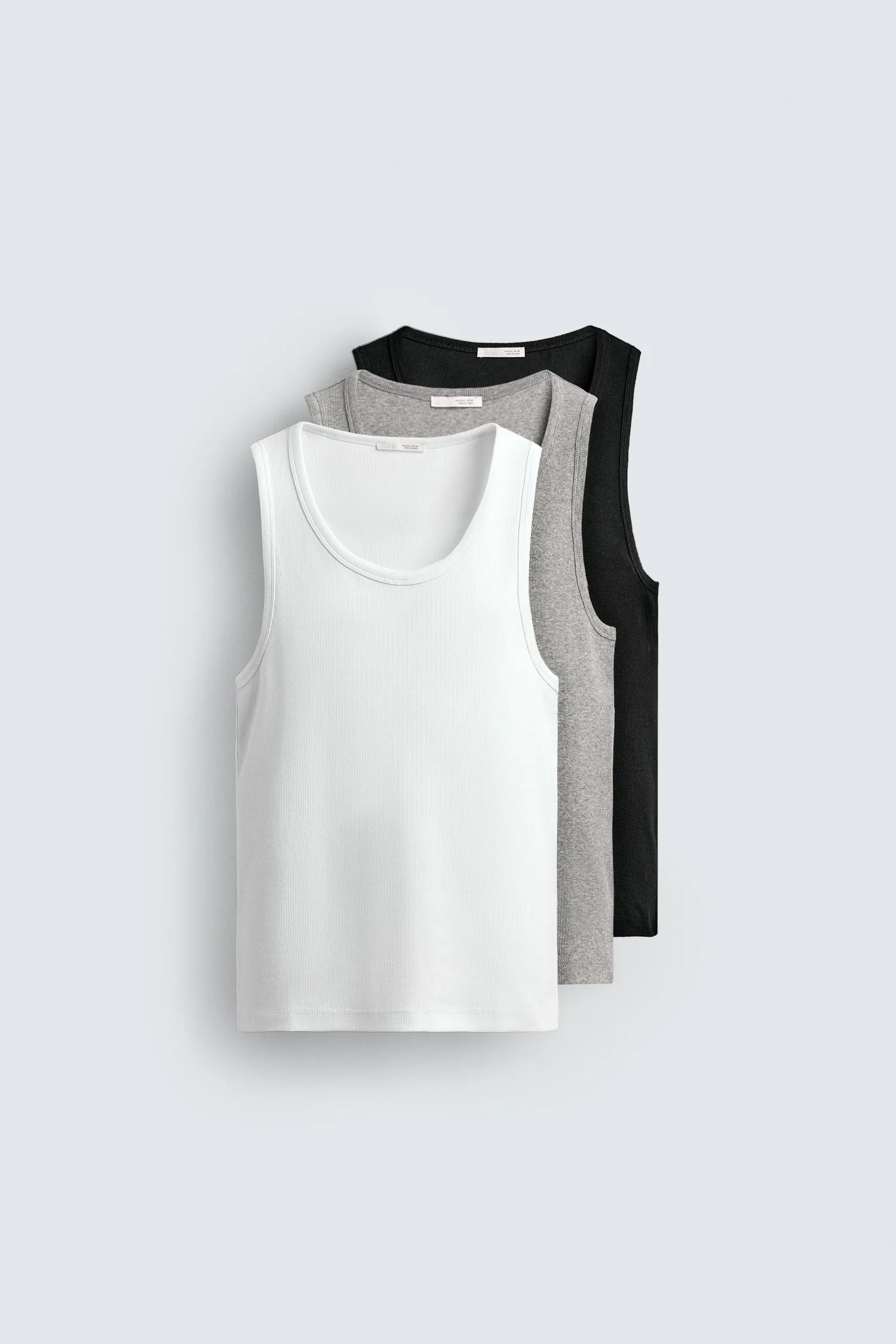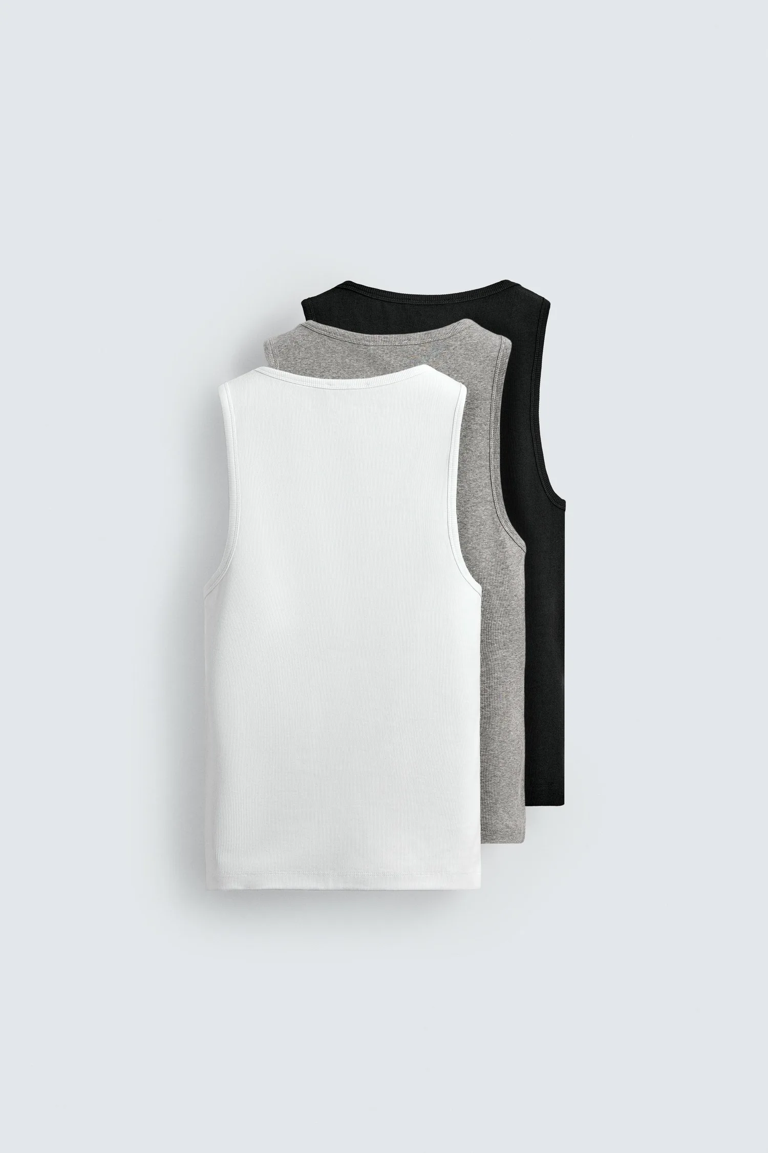 Набор из трех базовых маек стандартного кроя. С круглым вырезом и проймами, отделанными кантом.