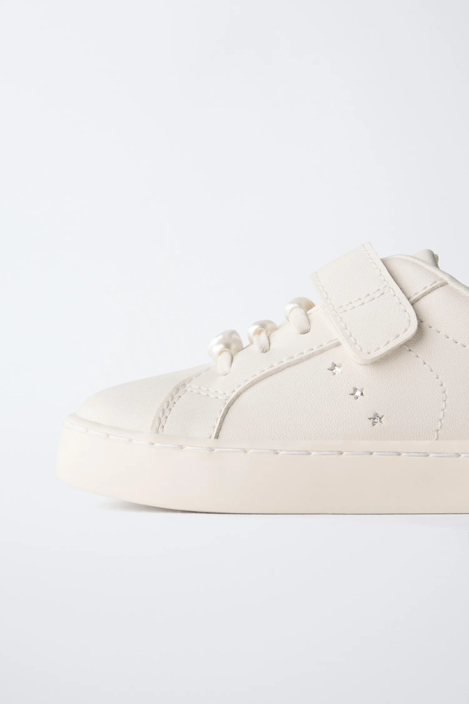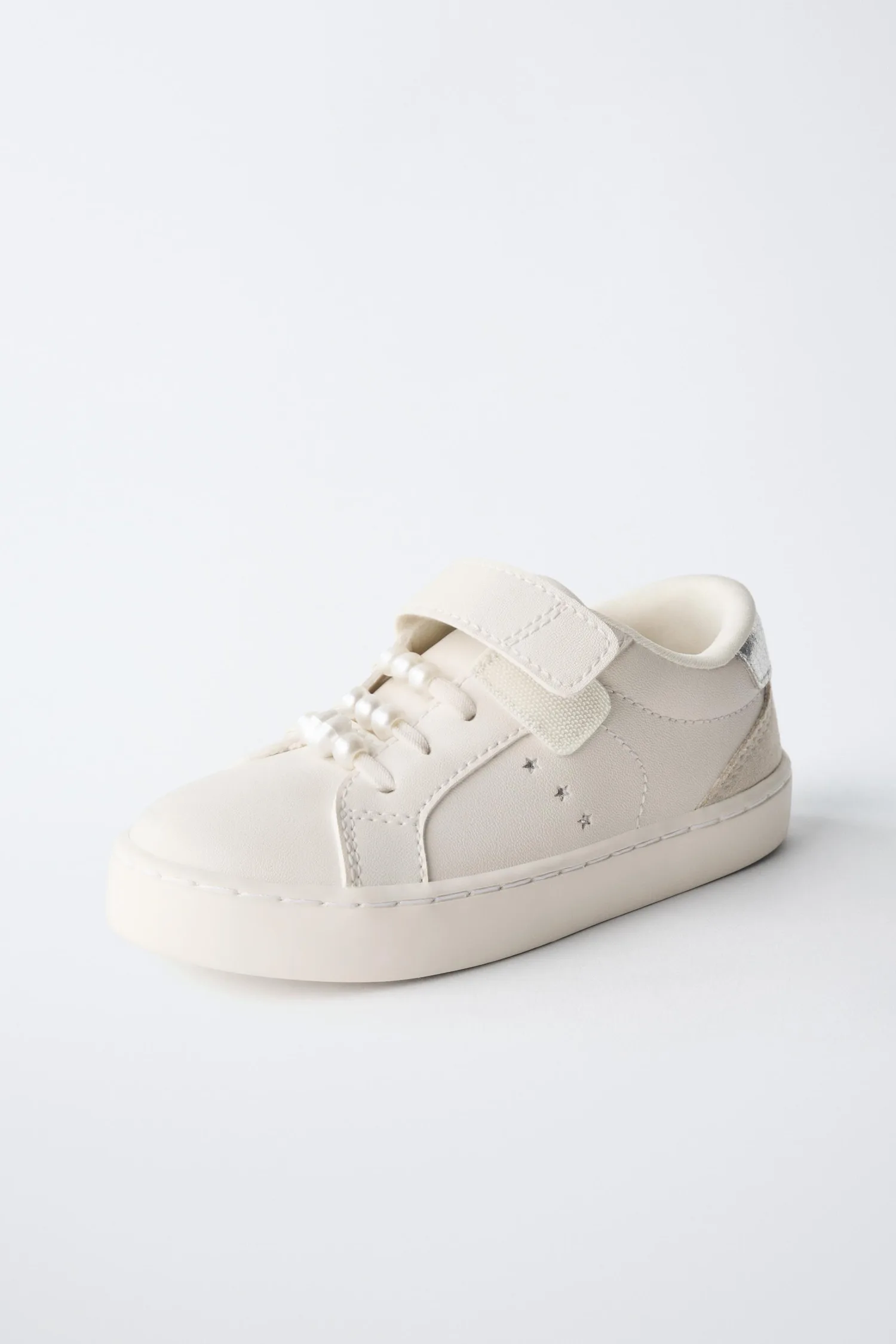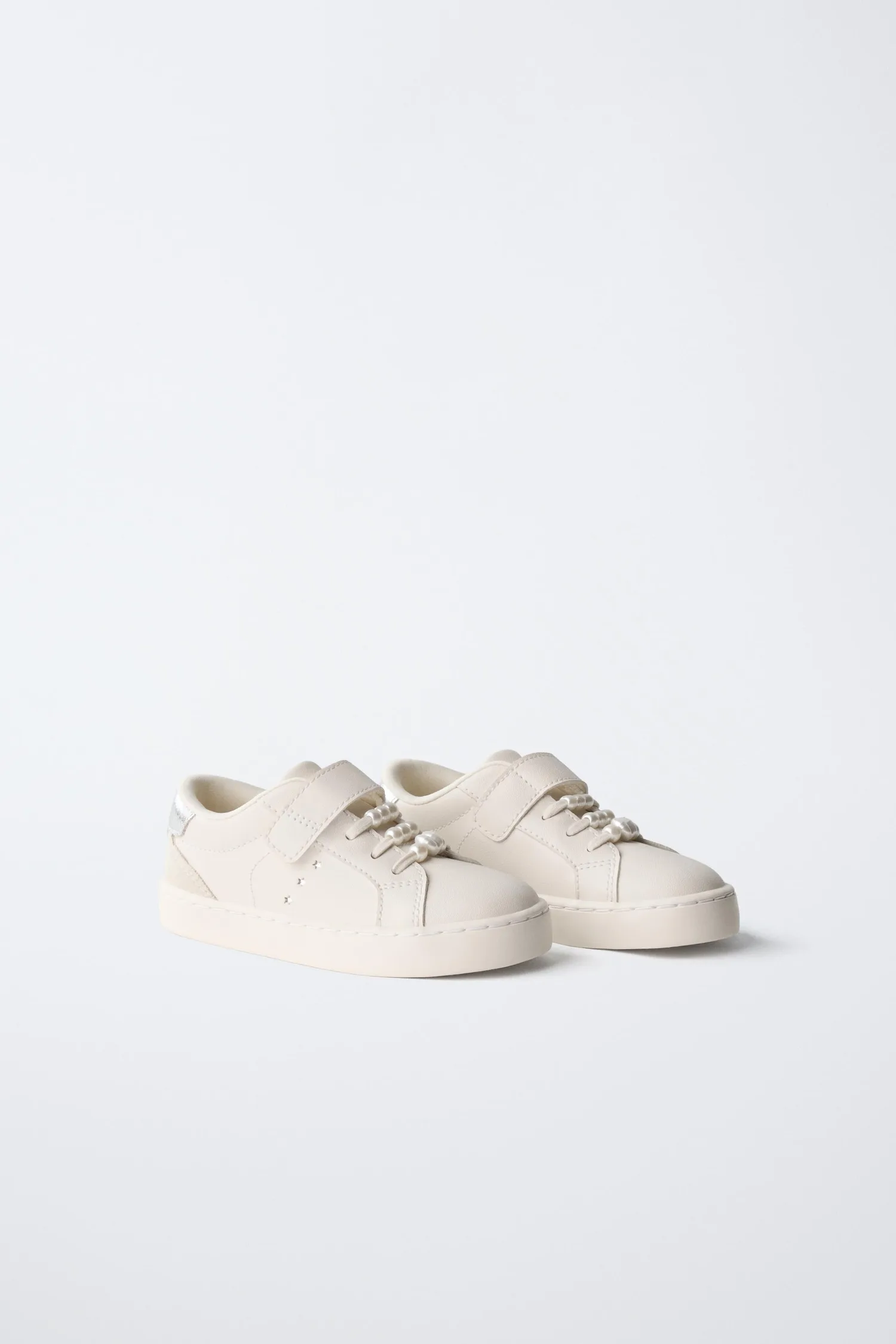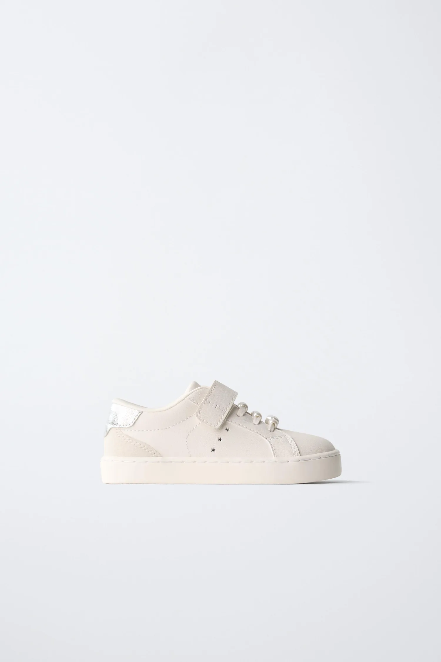 Кроссовки в стиле кедов с жемчужной отделкой и контрастной задней частью. Шнуровка и регулируемый ремешок на подъеме. Гибкая стелька. Резиновая подошва.