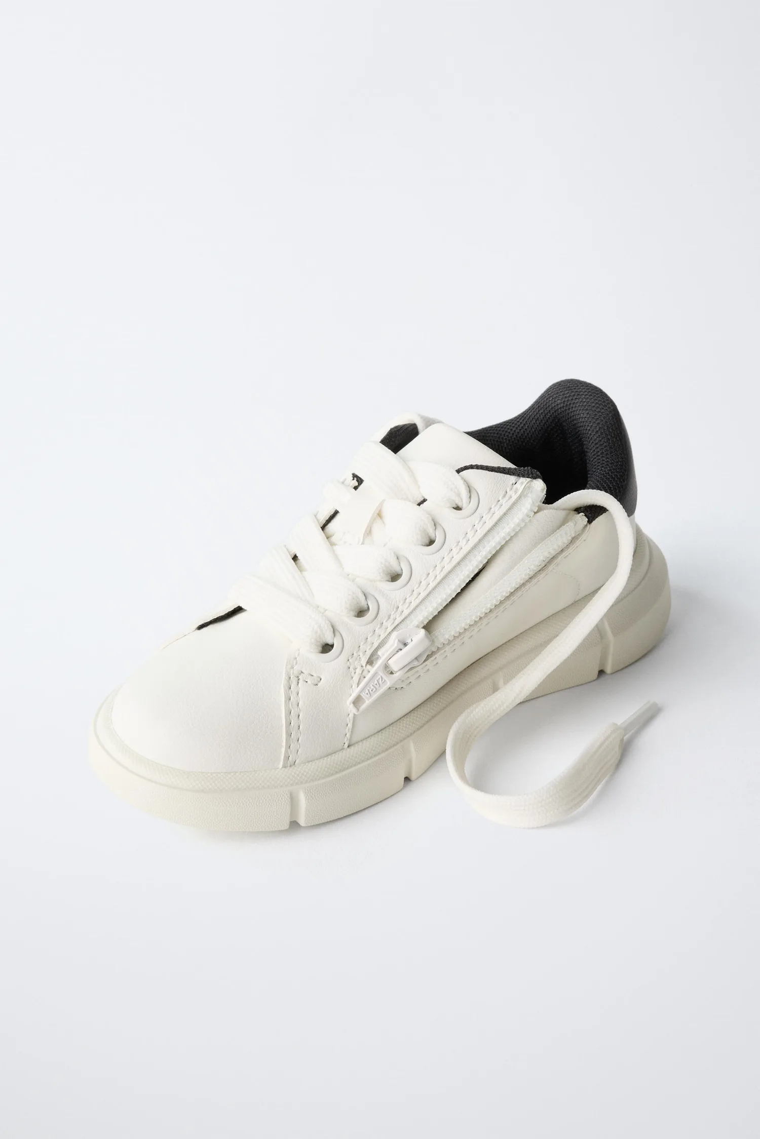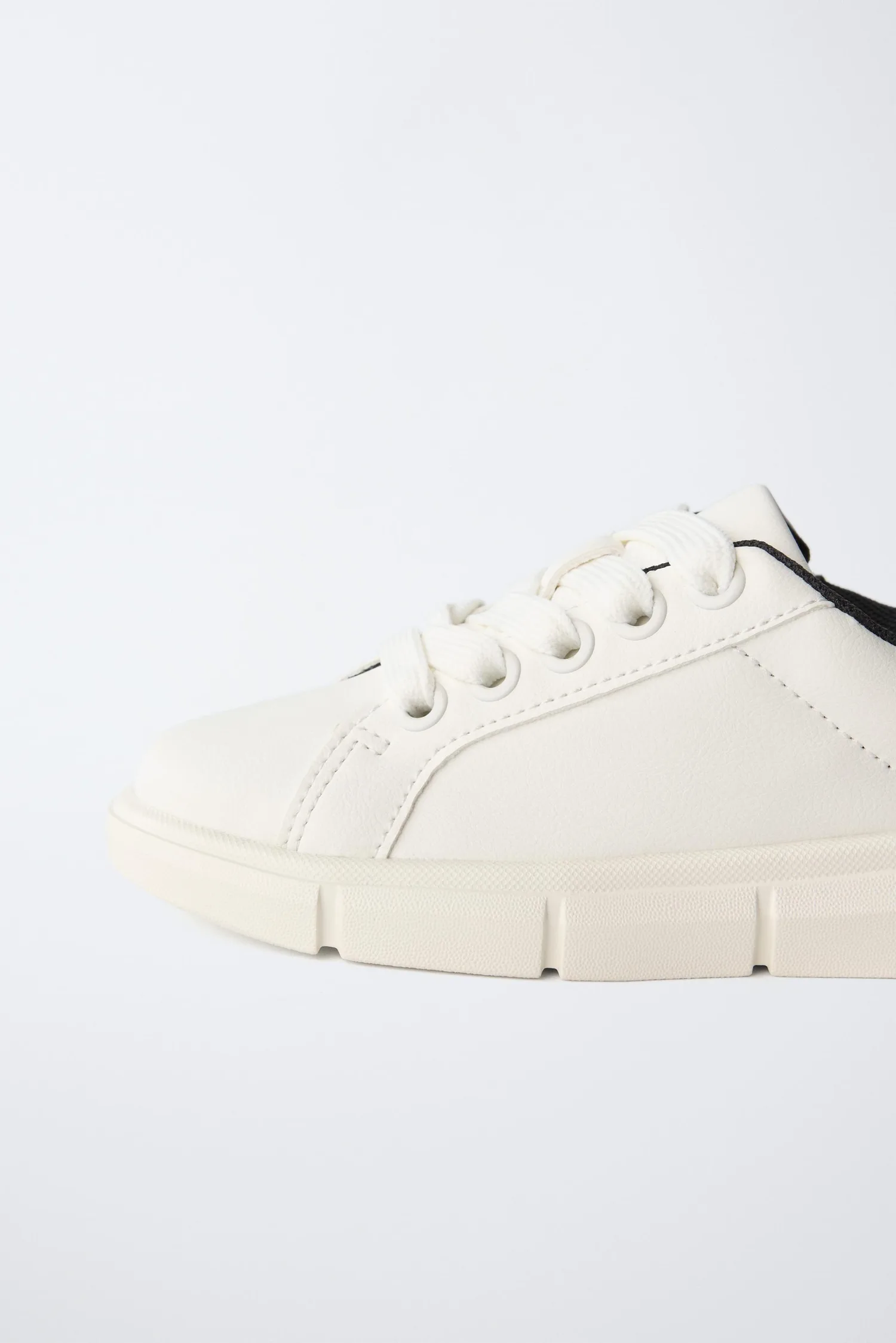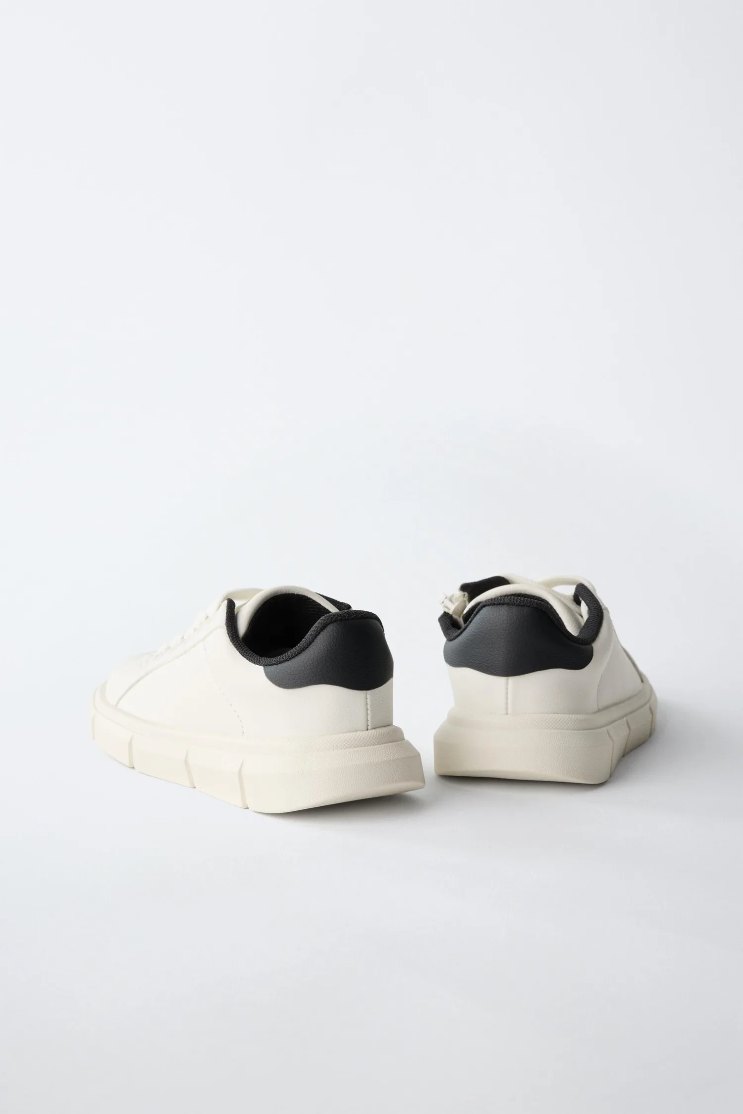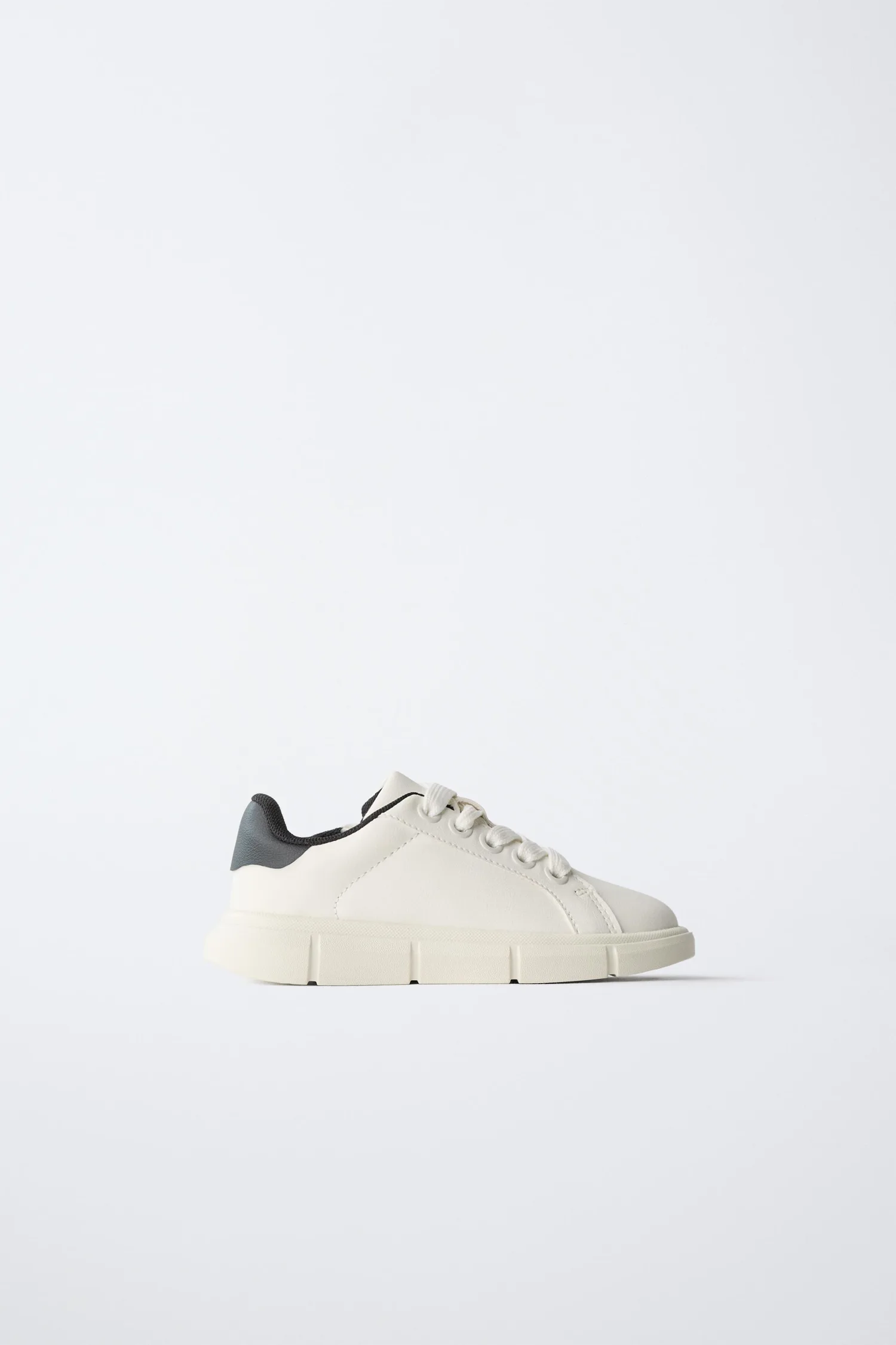 Простые кроссовки с контрастной цветной деталью на пятке. Регулируемая шнуровка. Гибкая стелька. Массивная резиновая подошва с зубчатым рисунком.