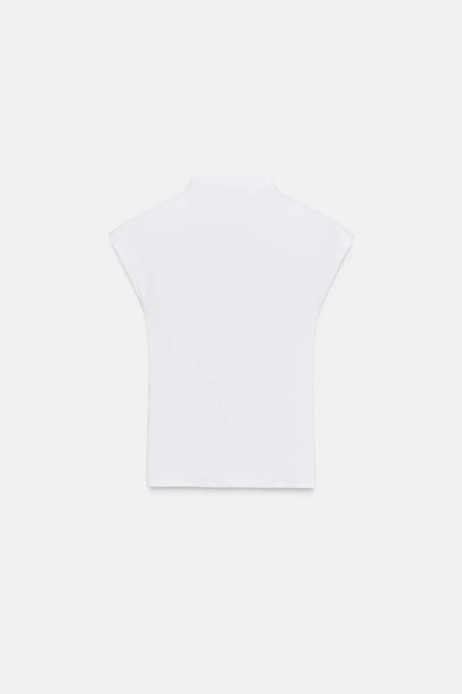 Топ, изготовленный из трикотажа на основе лиоцелла. Имеет высокий воротник, заниженные проймы и прямой низ.