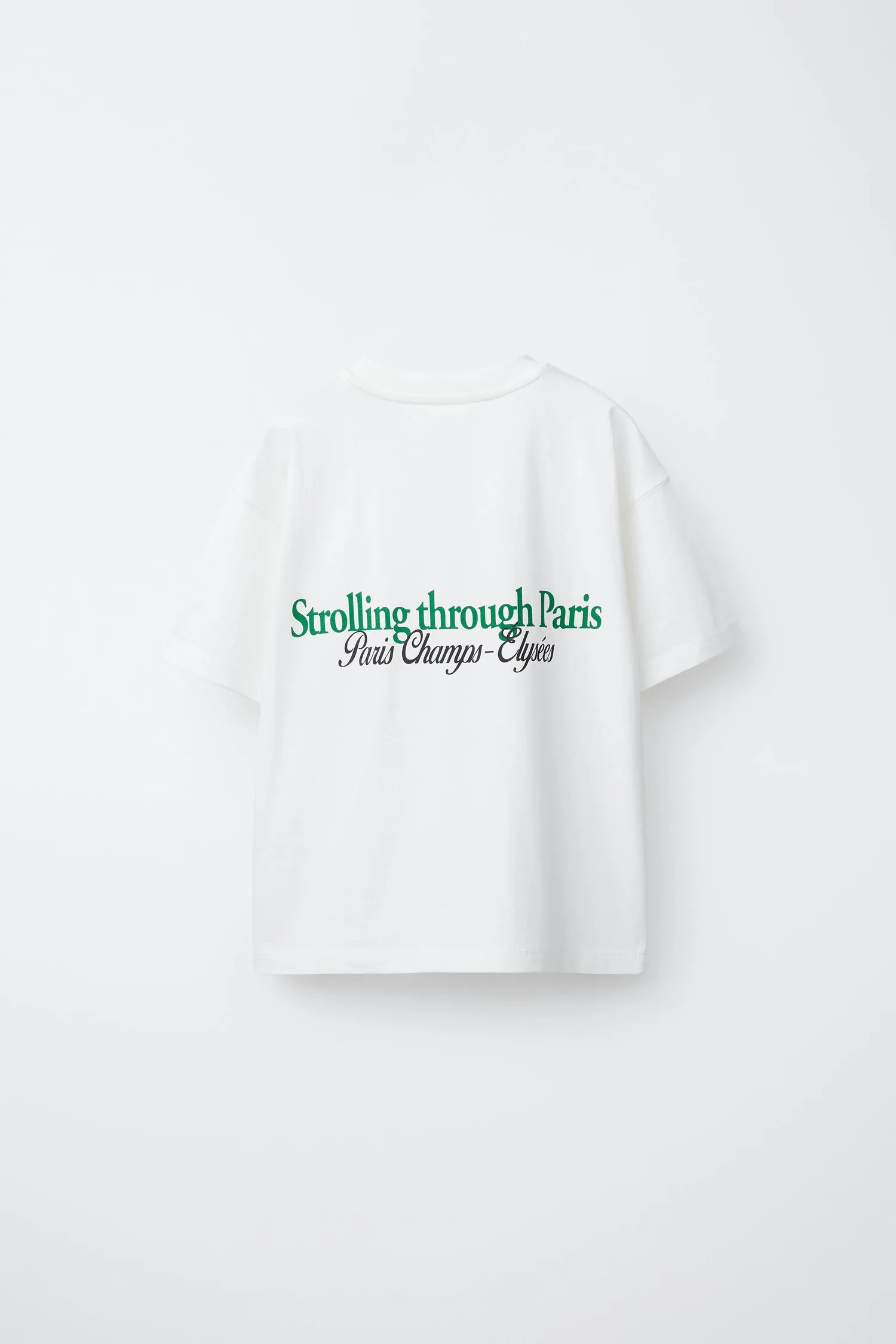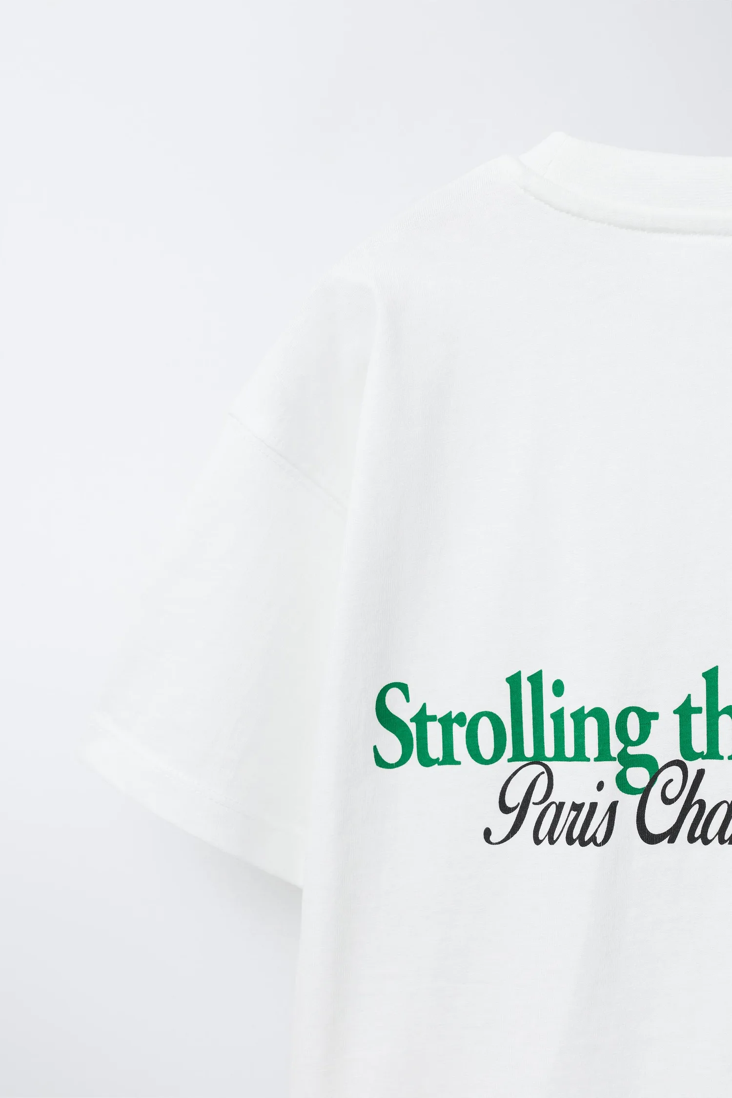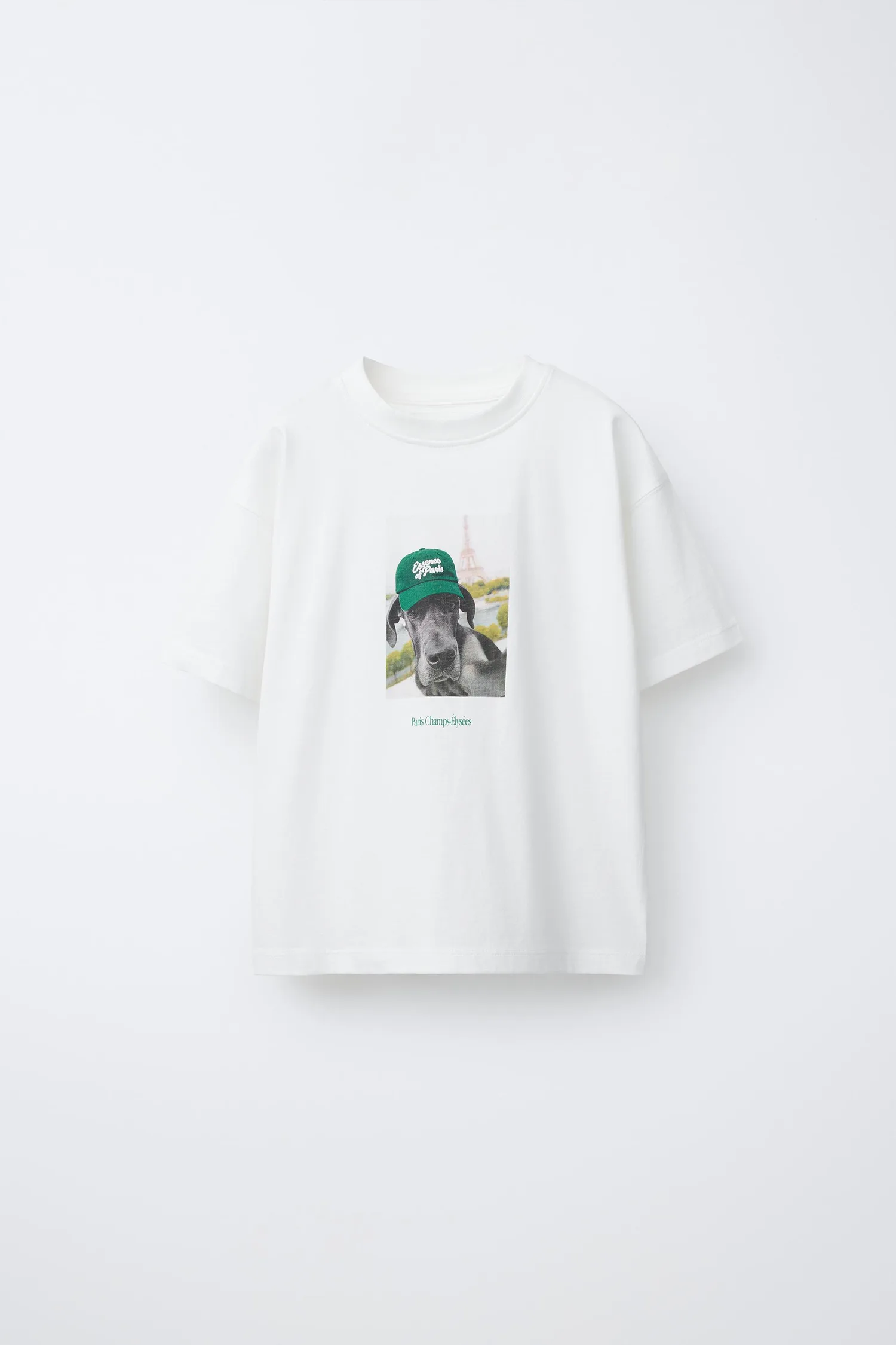 Футболка с круглым вырезом и короткими рукавами. Спереди - принт с собакой, сзади - текст.