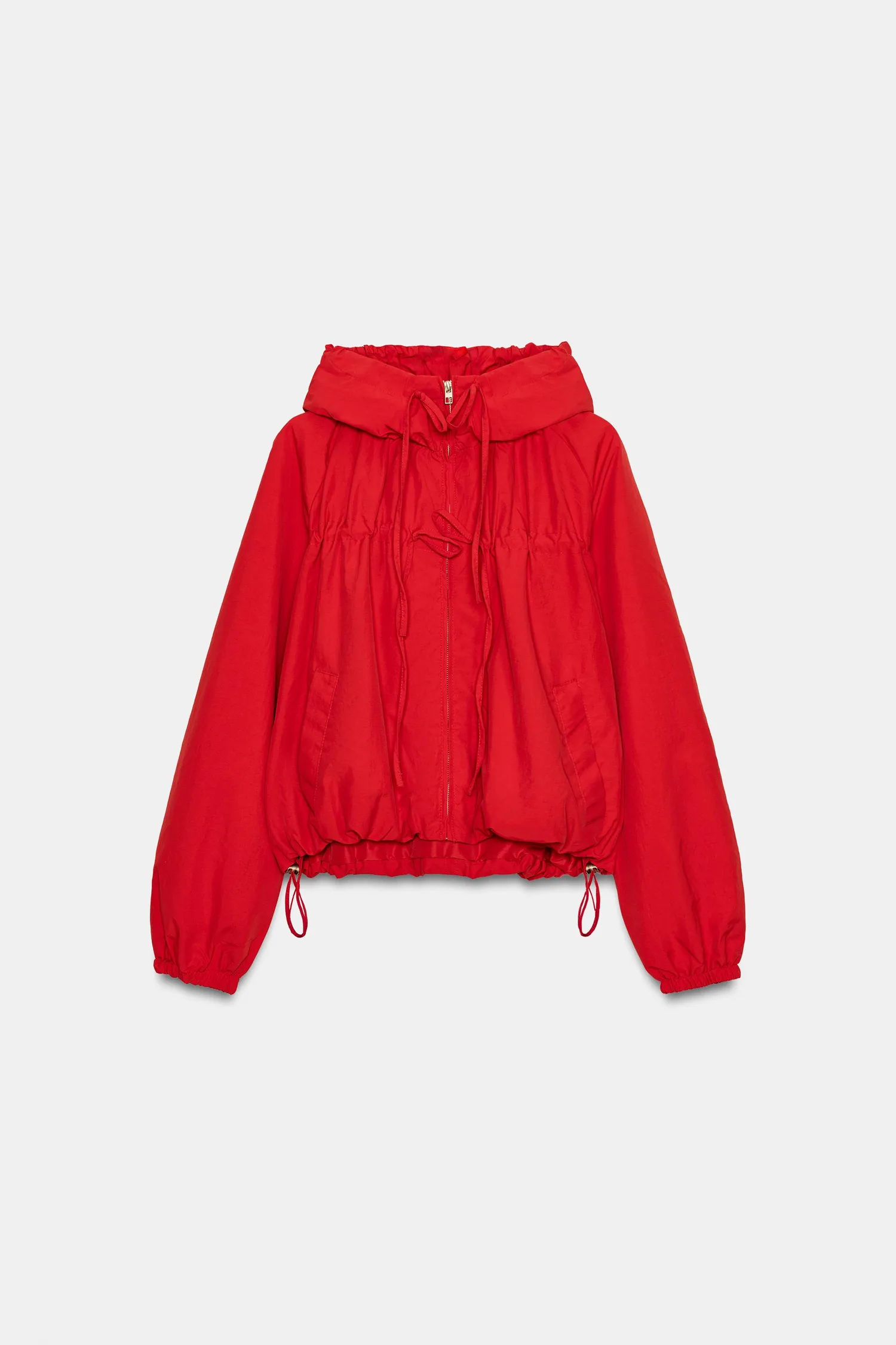 Яке с висока яка и качулка. Дълъг ръкав с маншети. Странични джобове. Вътрешна подплата. Детайл с регулируеми връзки и подгъв с ластичен шнур и стопери. Закопчаване с цип отпред.