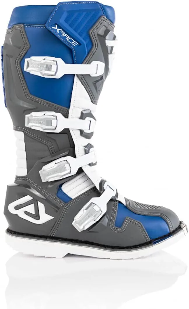 Мотокроссовые ботинки Acerbis X-Race. Компания Acerbis продолжает разрабатывать инновационные и защитные продукты с тем же энтузиазмом и страстью, которые были у основателей Acerbis в последние годы. Особенности конструкции: легкие, защитные и анатомические ботинки. Верх из износостойкой кожи и микрофибры. Молния в области лодыжки между защитой плюсневой кости и манжетой голени, обеспечивающая гибкость вращения стопы и контроль над движением ноги. Анатомически сформированная и усиленная защита голени. Формованная защита пятки для ускорения переключения передач при старте. Защита стопы и расширенный капюшон пальцев ног внутри и снаружи из пластика с ребрами для лучшего поглощения ударов. Застежка на 4 больших алюминиевых рычага. Эксклюзивная подошва Acerbis: ударопрочная, маслостойкая, бензиностойкая и износостойкая. Широкая поверхность подошвы для лучшего сцепления с подножками. Амортизирующая предварительно сформированная стелька. Внутренний материал из 3D-сетки для превосходного комфорта и вентиляции. Пенопластовая подкладка вокруг лодыжек. Примечания: EN 13634: 2017