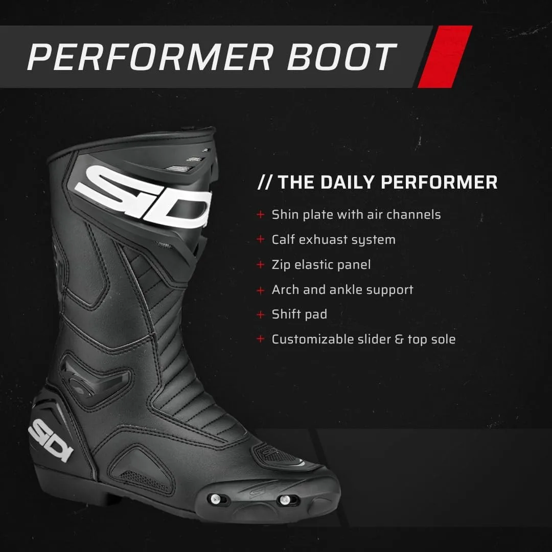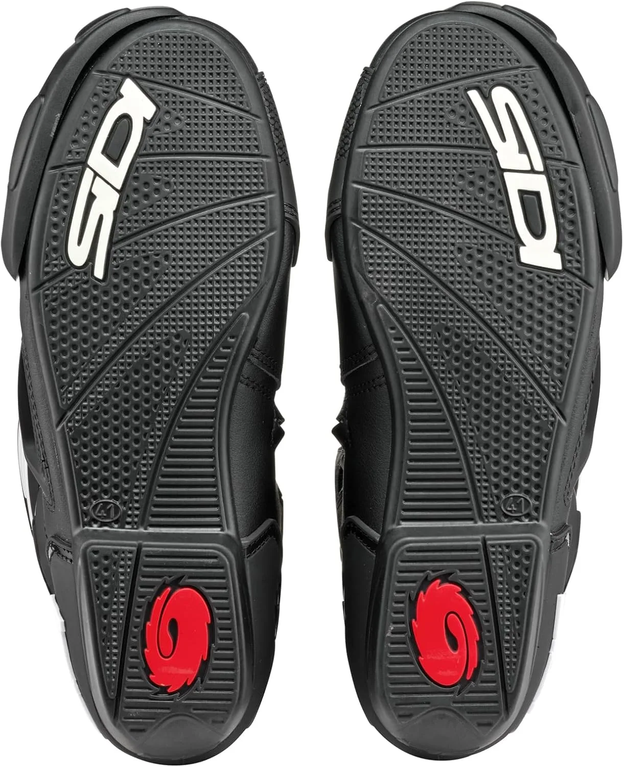 Команда дизайнеров Sidi Sport создала совершенно новые мотоциклетные спортивные ботинки с современным и футуристическим дизайном, в конструкции которых использованы материалы высочайшего качества, что делает их продуктом премиум-класса с точки зрения технологий, функциональности и качества изготовления. Ботинки были разработаны на основе исследований, лабораторных испытаний и тестов на трассе благодаря гонщикам Moto-GP от Sidi, чтобы обеспечить вам превосходные характеристики во время езды. Отличный выбор для любого райдера, ищущего защитные, но при этом дышащие ботинки с универсальной и чрезвычайно удобной посадкой, не говоря уже о легком надевании. Особенности: Верх из микрофибры TECHNOMICRO; Подкладка из сетчатого материала Teflon и Cambrelle в области носка; Формованная и фиксированная защита голени с нижними воздушными каналами; Внешняя защита плюсневой кости; Внутренние и внешние формованные подушечки для лодыжки; Мягкая область свода стопы; Эластичная вставка рядом с застежкой в области голени; Гладкая пяточная чашка для лучшего сцепления с мотоциклом; Накладка на рычаг переключения передач; Сменный слайдер для носка; Нейлоновая внутренняя стелька со съемной поддержкой свода стопы; Резиновая верхняя подошва