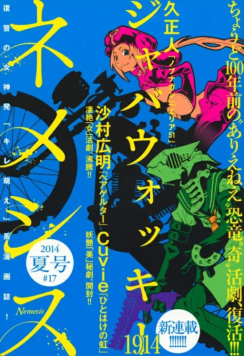 На обложке изображена манга «Jabberwocky 1914», нарисованная Хисой Масато, автором манги «Nobunagun» и «Area 51», а в качестве бонуса прилагается постер! Также включена последняя глава неовестерна Огоши Котаро «Zora»! По-настоящему ужасающая серия ужасов «Aftermath Radio», сборники которой были переизданы в большом количестве, включает четыре коротких рассказа и цветную репродукцию оригинальных иллюстраций в качестве подарка. Серия «Beargarter», боевик о хулиганах от Самуры Хироаки, автора «Blade of the Immortal», и «Nekomachi Shuju», жестокая романтическая комедия от Тамаки Бенкё, также продолжают выходить с большим успехом. «Куви», «Шионо Эцуродзи», «Сугимура Синичи», «Индукция взрыва», «Академия гигантского зла» и другие впечатляющие серии помогут вам пережить летнюю жару!!