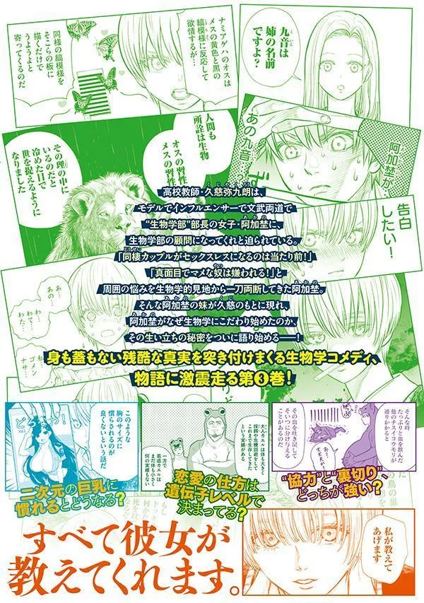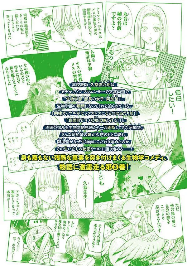 Наконец, Кудзи раскрывает истинную личность Акано, и их отношения погружаются в хаос...! Правда истории раскрывается одна за другой в этой комедии о биологии, том 3!