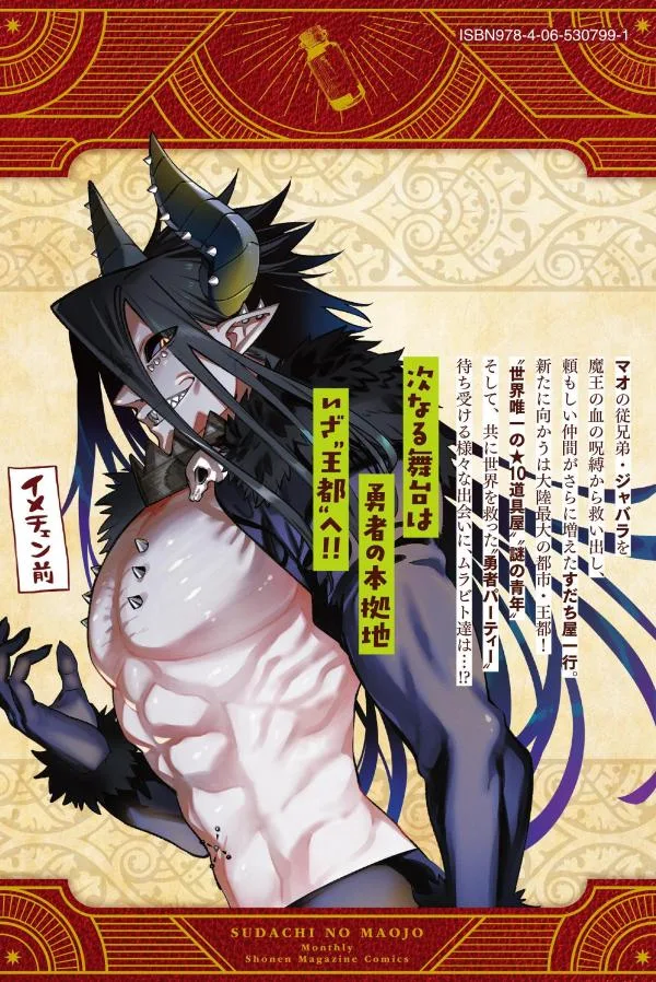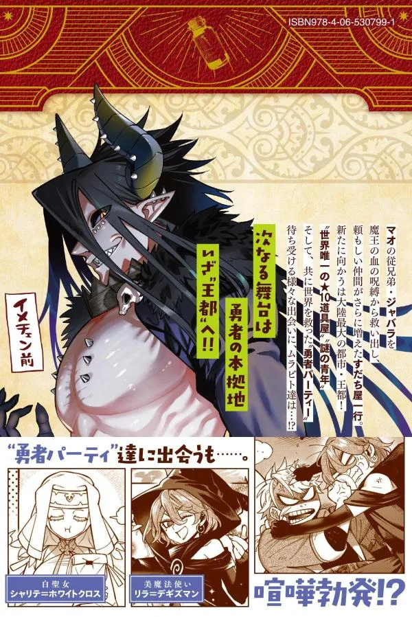После спасения кузена Мао, Джабары, от проклятия крови Короля Демонов, группа Судати-я обрела еще более надежных товарищей. Их следующий пункт назначения — крупнейший город континента, Королевская столица! «Единственный в мире магазин предметов ★10», «загадочный молодой человек» и «группа героев», которые вместе спасли мир. Что будут делать жители деревни, столкнувшись с множеством опасностей...!? [Следующий этап — штаб-квартира героев, «Королевская столица»! !]