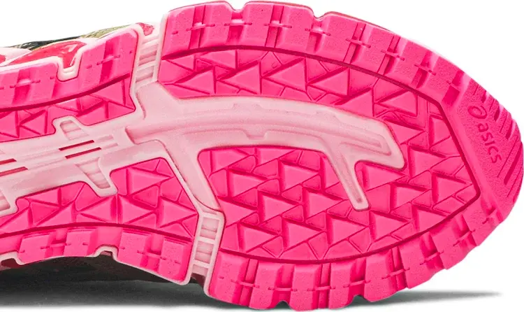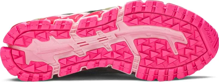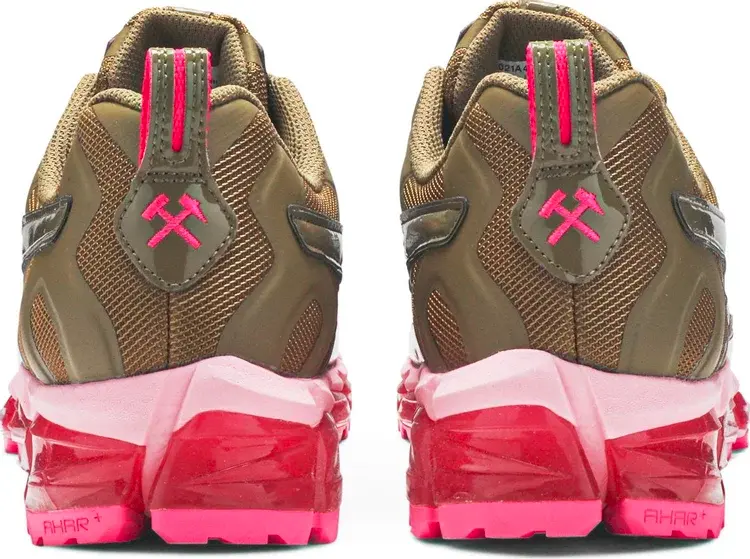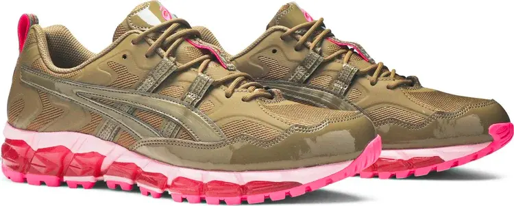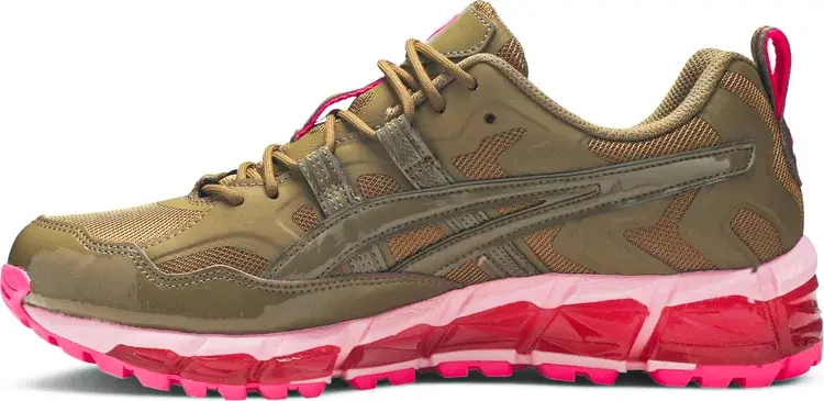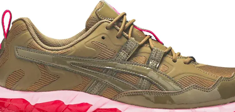 Кроссовки GmbH x Gel Nandi 360 «Rover», разработанные в сотрудничестве с берлинским модным лейблом, демонстрируют резко контрастирующие оттенки между верхом и промежуточной подошвой. Последний отделан смесью розовых и пурпурных оттенков, что смягчает ребристую структуру инструмента, в том числе ярко-розовую подошву с выступами под ногами. Сверху однотонный оливково-зеленый цвет нанесен на сетку и лакированную кожу. Контрастные розовые пятна отличают фирменные элементы кроссовок.