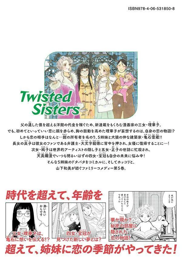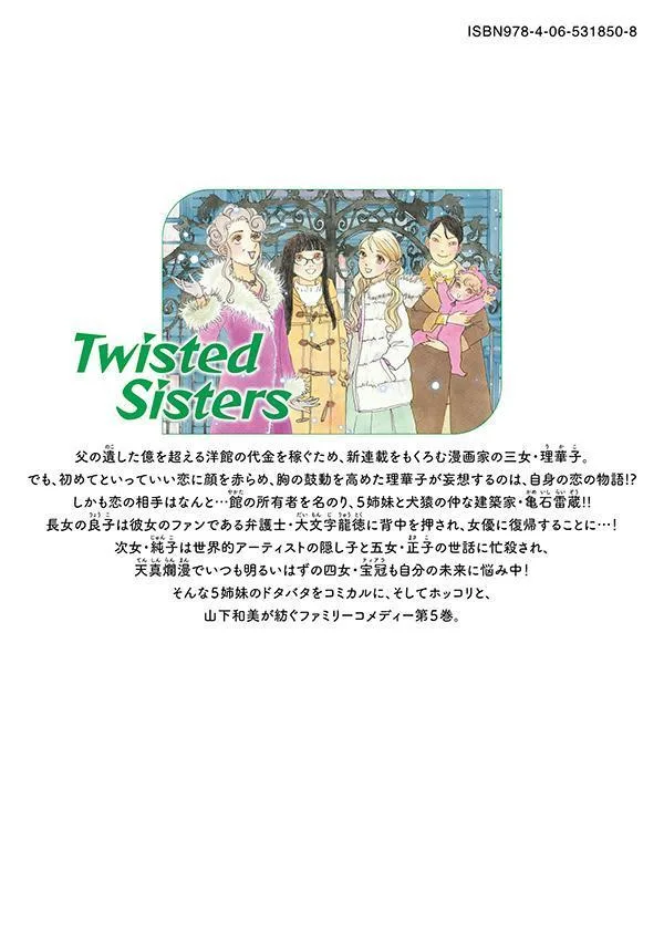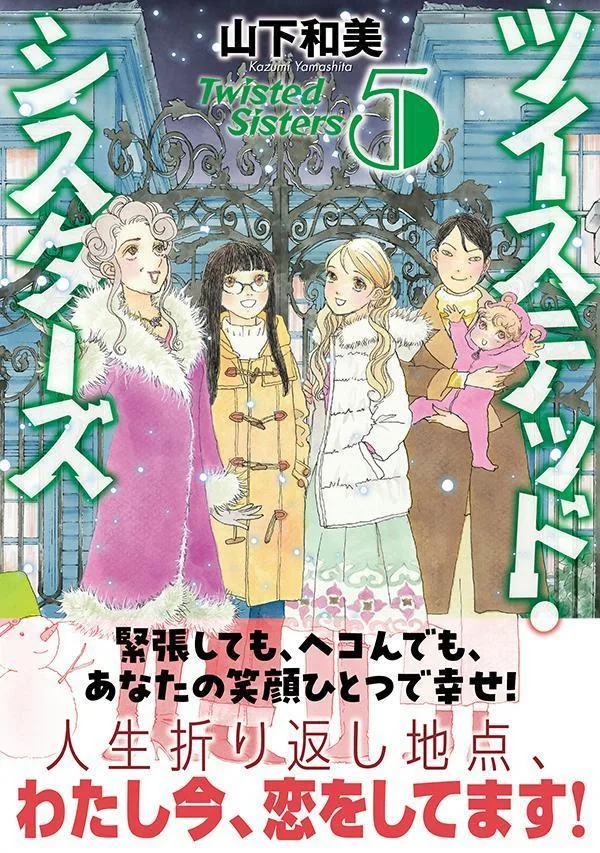Чтобы заработать деньги на оплату особняка, оставленного ей отцом, стоимостью более ста миллионов йен, Рикако, третья дочь мангаки, планирует начать новую серию. Но, краснея и испытывая сильное волнение от того, что можно назвать её первой любовью, Рикако начинает фантазировать о собственной истории любви!? И объектом её привязанности оказывается не кто иной, как... Камейши Райдзо, архитектор, который утверждает, что является владельцем особняка и находится в плохих отношениях с пятью сёстрами!! Старшая дочь, Рёко, получает поддержку от своего поклонника, адвоката Даймондзи Рютоку, чтобы вернуться к актёрской карьере...! Вторая дочь, Дзюнко, занята заботой о внебрачном ребёнке всемирно известного художника, а пятая дочь, Масако, и даже обычно весёлая и невинная четвёртая дочь, Хокан, беспокоятся о своём будущем! Это пятый том семейной комедии, созданной Ямаситой Казуми, в которой комичный и трогательный юмор, основанный на фарсе, рассказывает о проделках пяти сестер.