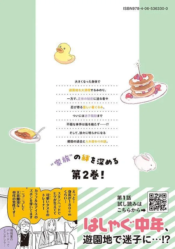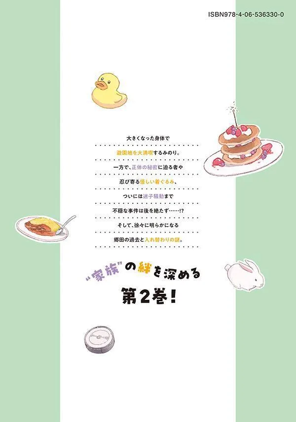 Минори получает огромное удовольствие от парка развлечений в своем новом увеличенном теле. Тем временем, тревожные инциденты продолжают накапливаться: от попыток раскрыть секрет ее истинной личности и подозрительного талисмана, скрывающегося в тени, до пропавшего ребенка...!? И постепенно раскрывается прошлое Гоуды и секрет обмена телами. Второй том этой трогательной, но тревожной комедии укрепляет узы «семьи»!