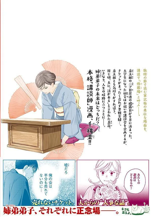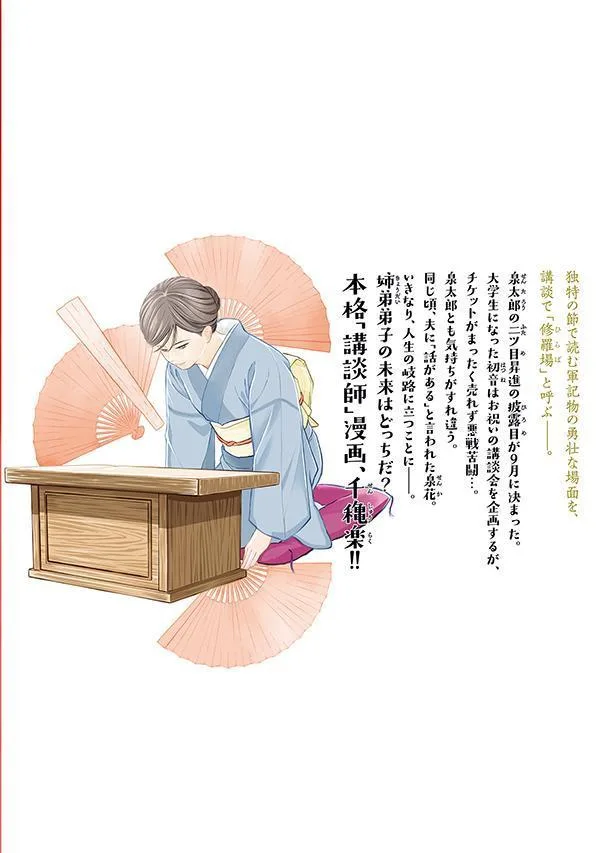 Изуми Таро получил звание второго ранга рассказчика кодан. Однако его беспокоит то, что он видит Хацунэ, теперь уже студентку колледжа, сидящую рядом с незнакомым молодым человеком. Примерно в то же время муж Изуми Ханы говорит ей, что ему «нужно поговорить». Внезапно она оказывается на перепутье в своей жизни. Что же ждет в будущем брата и сестру-учеников? Завершается подлинная манга о рассказчике кодан!