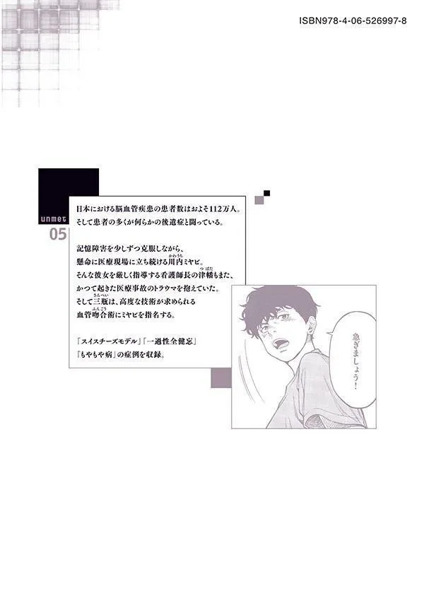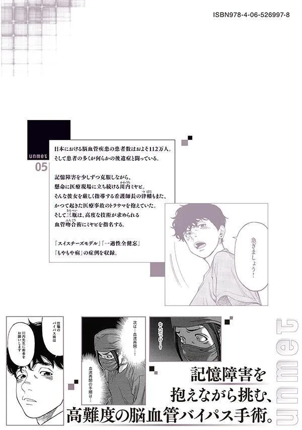 Незначительная ошибка, таящаяся в больнице, может угрожать жизни пациента. Эта книга углубляется в механизмы и истинные причины медицинских ошибок. / В Японии насчитывается около 1,12 миллиона пациентов с цереброваскулярными заболеваниями. И многие из этих пациентов борются с теми или иными последствиями. Каваучи Мияби продолжает усердно работать в медицинской сфере, постепенно преодолевая свою потерю памяти. Цубата, старшая медсестра, которая строго ее контролирует, также несет на себе травму медицинской ошибки, произошедшей в прошлом. А Санпей поручает Мияби выполнить процедуру сосудистого анастомоза, требующую высокого уровня квалификации. Включает в себя клинические случаи «модели швейцарского сыра», «транзиторной глобальной амнезии» и «болезни Моямоя».