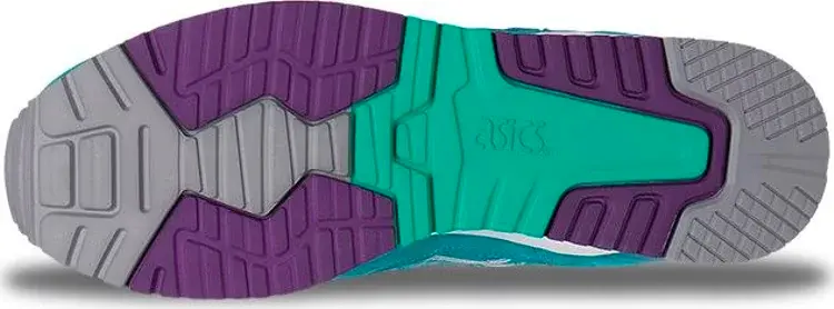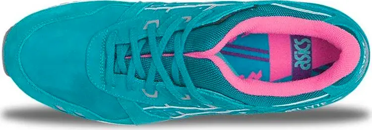 Эта итерация Gel-Lyte 3 в тропическом зеленом цвете относится к «всепогодному пакету» Asics 2015 года. Верх из водонепроницаемой замши со светоотражающими полосками Asics и розовой внутренней подкладкой. Под ногами белая межподошва с гелевой технологией сочетается с фиолетово-зеленой резиновой подошвой.