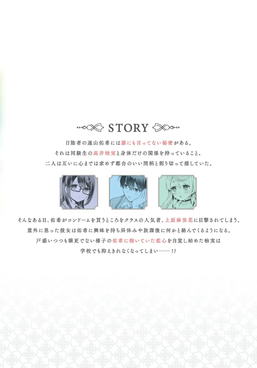 Тояма Юки, изгой, хранит секрет, о котором никому не рассказывал. А именно, у него чисто физические отношения со своим одноклассником Такаи Юдзуми. Они не стремятся к сердцу друг друга и относятся друг к другу как к удобному союзу. Однажды Уэхара Марика, популярная девушка в классе, видит, как Юки покупает презервативы. Удивлённая, она заинтересовывается Юки и начинает приставать к нему во время обеденных перерывов и после школы. Видя Юки, который смущён, но не совсем против её ухаживаний, Юдзуми начинает осознавать свои чувства к нему, и она больше не может их сдерживать в школе!? Начинается откровенная, но горько-сладкая молодёжная романтическая комедия!