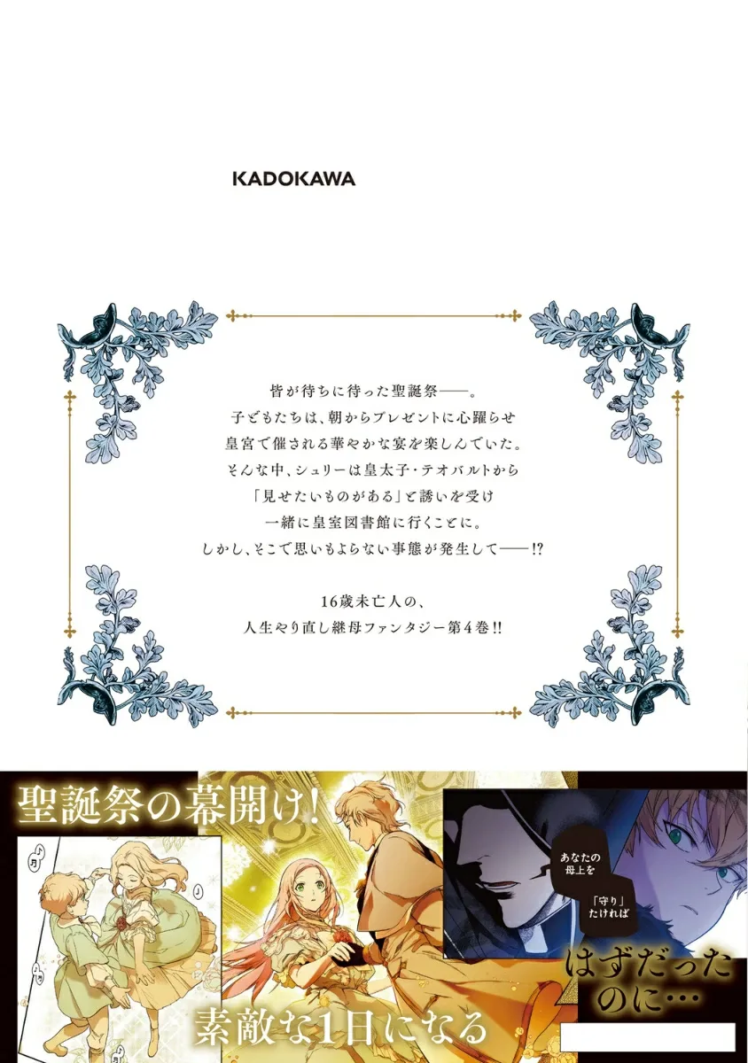 Долгожданные рождественские торжества наступили. Дети с утра до вечера с нетерпением ждали подарков, наслаждаясь великолепным пиром в Императорском дворце. В разгар всего этого Шури получает приглашение от наследного принца Теобальда, который говорит, что хочет ей кое-что показать, и она отправляется с ним в Императорскую библиотеку. Однако там разворачивается неожиданная ситуация —!? Четвертый том фэнтезийной серии о 16-летней вдове, получившей второй шанс в жизни в качестве мачехи!!