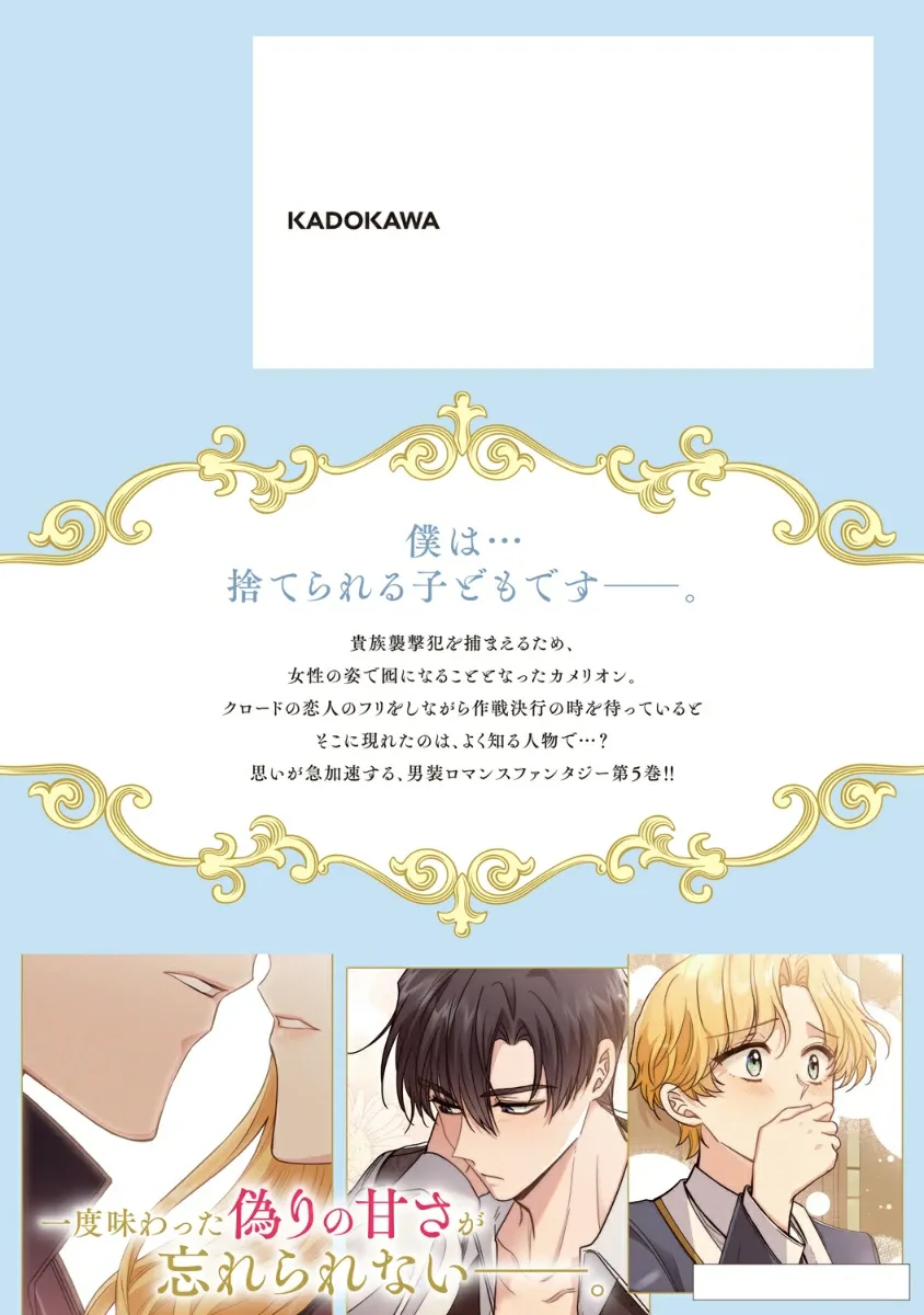 Я... брошенный ребенок... Камелион вынужден переодеться в женщину, чтобы стать приманкой для поимки убийц, напавших на дворян. Притворяясь любовником Клода и ожидая момента для осуществления плана, он встречает кого-то, кого хорошо знает...? Пятый том этой романтической фэнтези с переодеванием в женскую одежду, где чувства развиваются стремительно!!