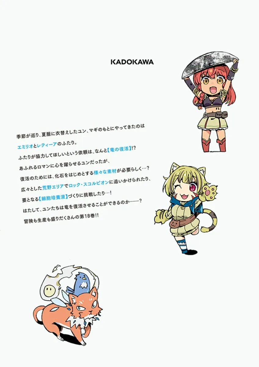 С изменением времен года Эмилио и Летия навещают Юна и Маги, которые переоделись в летнюю одежду. Двое, ищущие окаменелости драконов, замышляют воскресить "дракона"-монстра...!? Команда девушек (?) занята поиском материалов и алхимией в 18 томе!