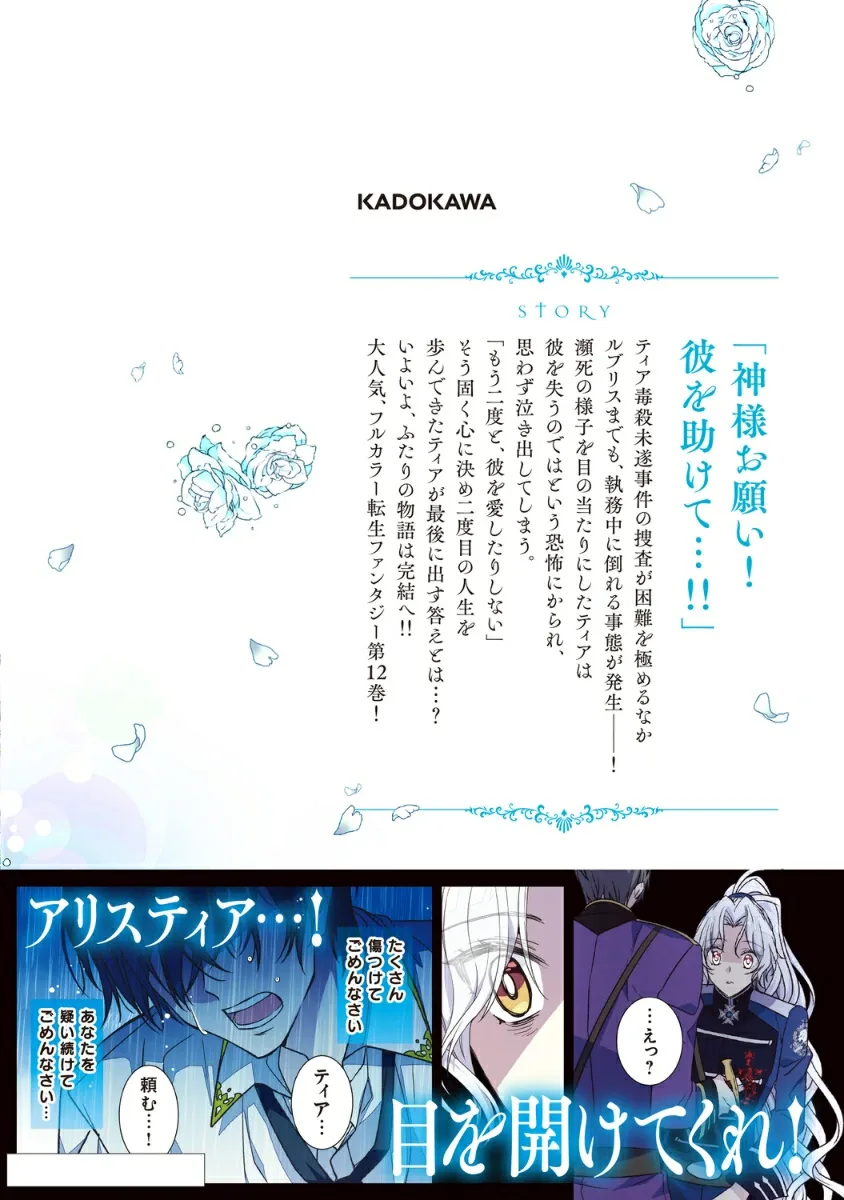 Расследование попытки отравления Тии оказывается крайне сложным, и даже Рублис падает в обморок во время дежурства! Став свидетельницей его предсмертного состояния, Тия охватывает страх потерять его, и она разражается слезами. «Я никогда больше не полюблю его», — твердо решила Тия, прожив свою вторую жизнь. Но каким будет ее окончательный ответ...? История этих двоих наконец подходит к своему завершению! Чрезвычайно популярная полноцветная фэнтезийная история о реинкарнации, том 12!