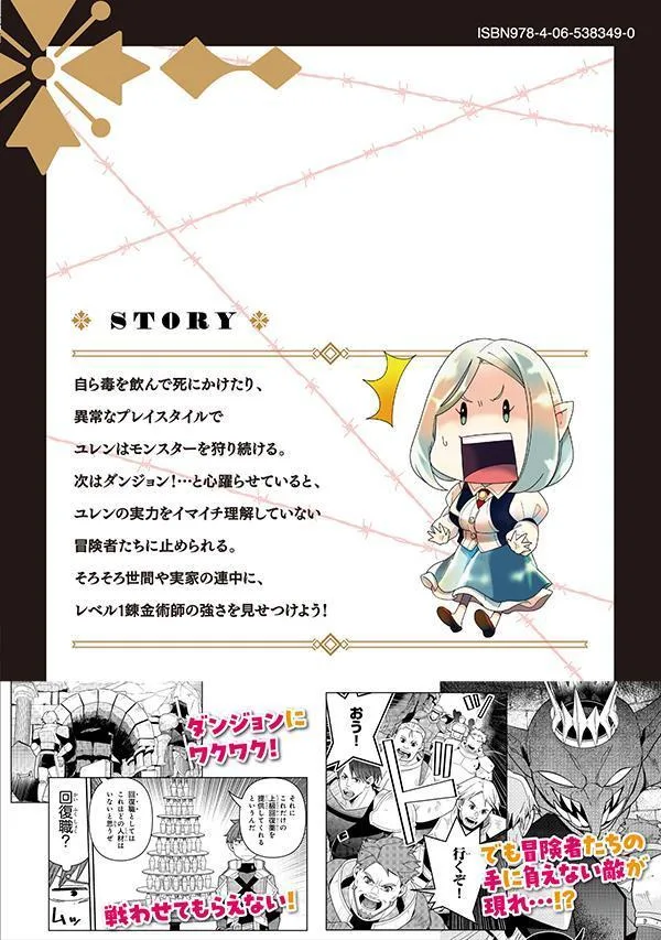 Юрен продолжает охотиться на монстров, используя необычный стиль игры, и даже чуть не умирает, выпив яд. Следующая остановка — подземелье! ...Как раз когда он начинает проявлять интерес, его останавливают искатели приключений, которые не совсем понимают истинные способности Юрена. Пришло время показать миру и своей семье силу алхимика 1-го уровня! !