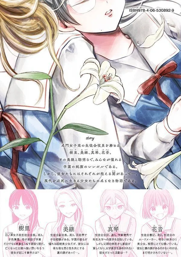 Джури, Макото, Мицуги и Канон, четыре участницы студенческого совета престижной женской средней школы, — школьные красавицы, которыми все восхищаются за их красоту и совершенство. Подобно белой лилии, лилии Мадонны, посвященной Деве Марии, они являются символами чистоты школы. Однако у каждой из них есть скрытая сторона. Джури вовлечена в любовную связь, нарушающую правила приличия, Макото занимается «сахарными» свиданиями... и так далее. Никто не может помешать белым лилиям запятнаться собственной нечистотой.