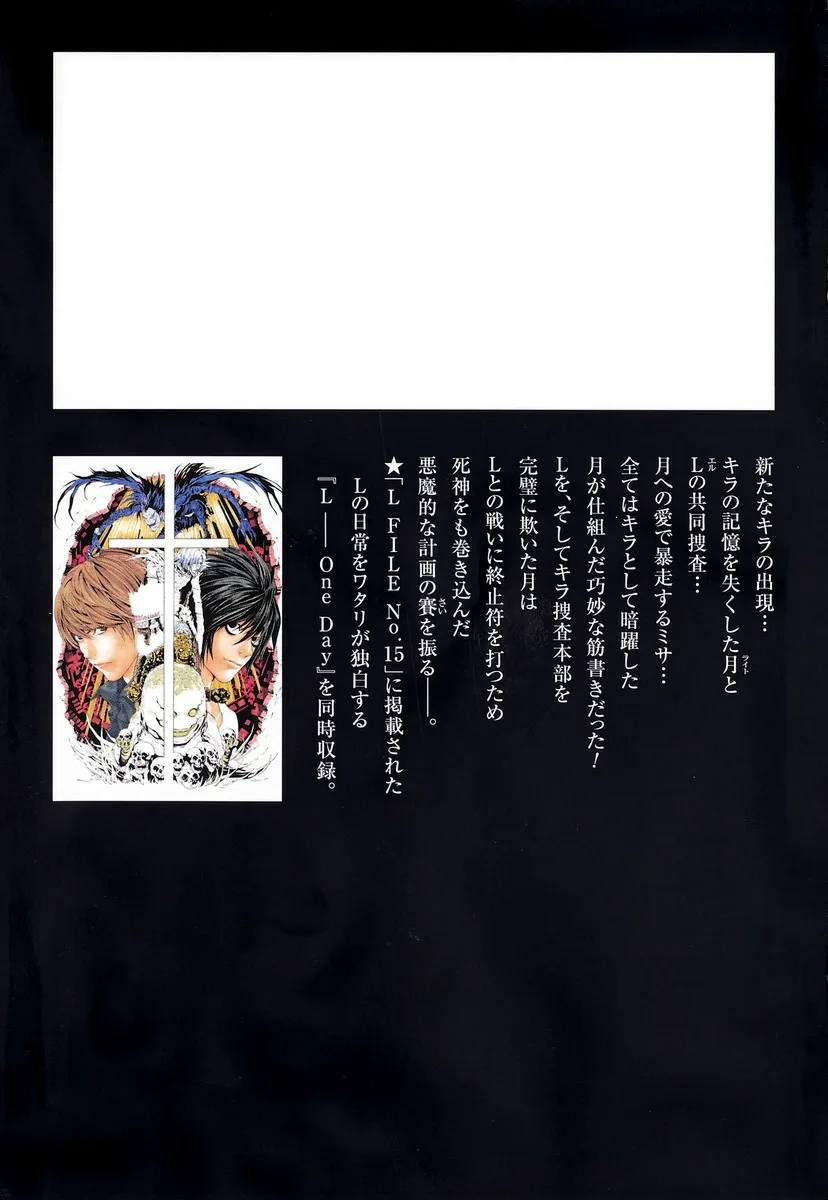 Появление нового Киры… Совместное расследование Лайта, потерявшего воспоминания о Кире, и L… Миса, сошедшая с ума от любви к Лайту… Все это было хитроумным планом, разработанным Лайтом, который действовал в тени под видом Киры! Идеально обманув L и штаб расследования Киры, Лайт бросает кости в дьявольском плане, который даже включает в себя Синигами, чтобы положить конец своей битве с L──. ●Включает монолог Ватари «L──Однажды», посвященный повседневной жизни L, который был опубликован в «L FILE No.15».