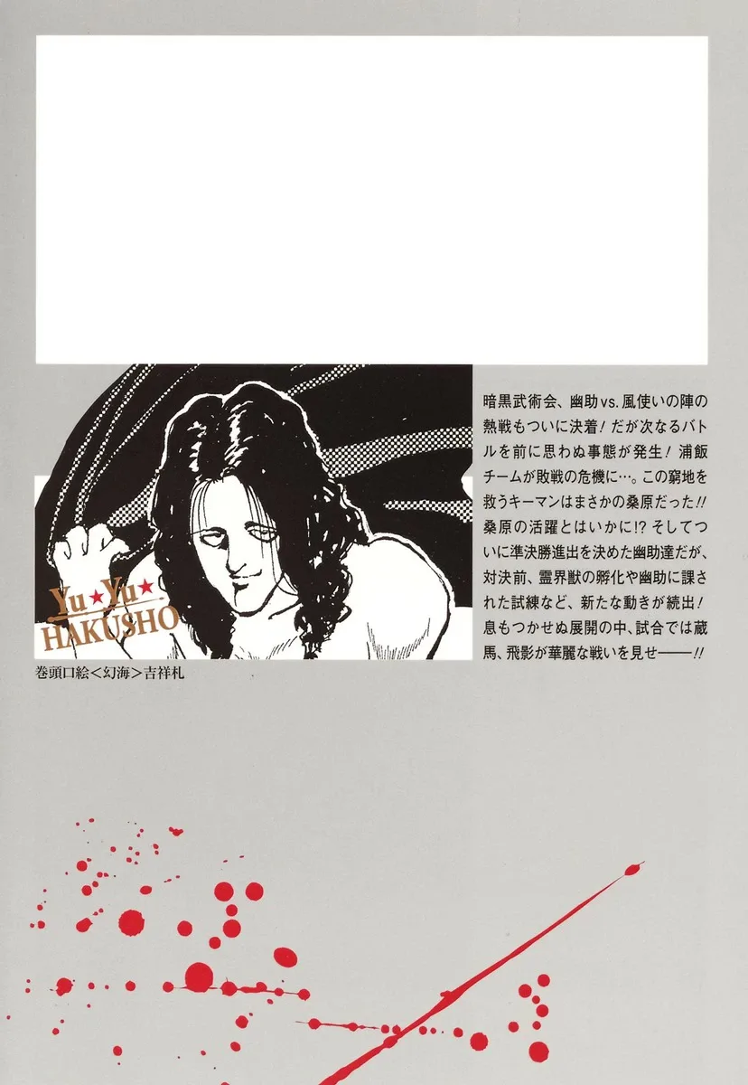 Напряженная битва Темного Турнира между Юсуке и Джином, пользователем ветра, наконец-то подошла к концу! Но перед следующей битвой возникает неожиданная ситуация! Команда Урамеши находится под угрозой поражения... Ключевым человеком, который спасет их от этого бедствия, является не кто иной, как Кувабара!! Какова будет роль Кувабары!? И как раз когда Юсуке и его команда наконец-то вышли в полуфинал, перед матчем разворачиваются новые события, включая появление духовных зверей и испытания, наложенные на Юсуке! В разгар захватывающей череды событий Курама и Хиэй демонстрируют свои блестящие боевые навыки в матче--!! Иллюстрация в начале: Генкай - Благоприятная карта