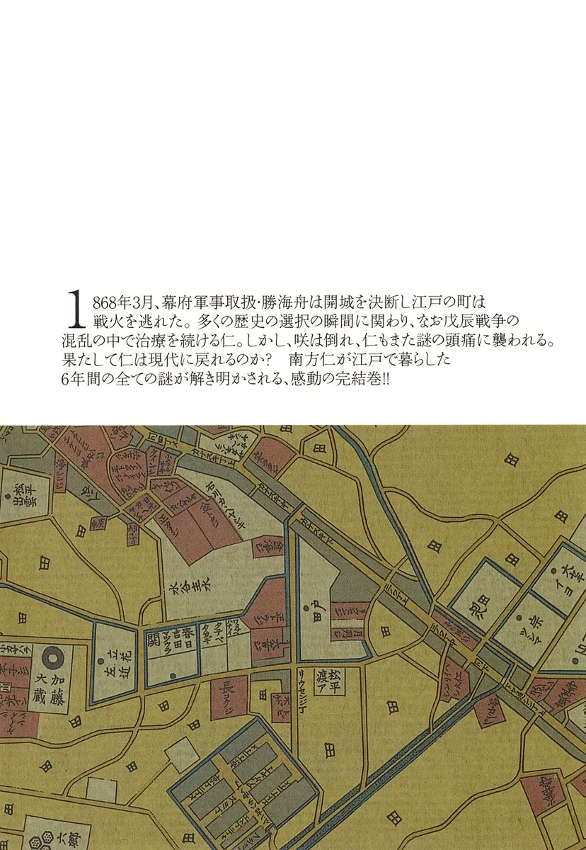 В марте 1868 года военный офицер сёгуната Кацу Кайсю решил сдать замок, спасая Эдо от разрушительных последствий войны. Дзин, участвовавший во многих важных исторических событиях, продолжает оказывать медицинскую помощь в хаосе войны Босин. Однако Саки теряет сознание, а самого Дзина мучает головная боль. Сможет ли Дзин вернуться в наши дни? Трогательный заключительный том раскрывает все тайны шести лет жизни Минакаты Дзина в Эдо!!