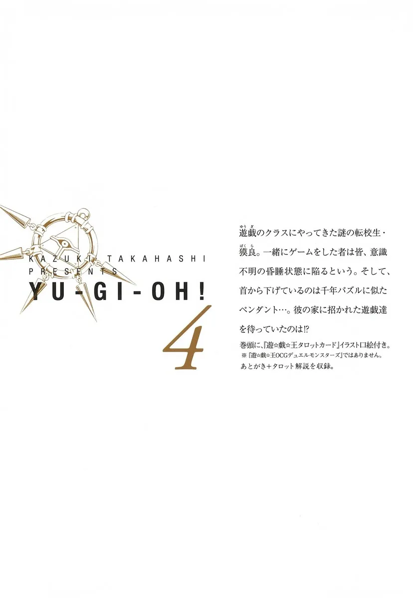 В класс Юги приходит загадочный ученик-переводчик по имени Бакура. Все, кто играет с ним в игры, впадают в кому. А на его шее кулон, напоминающий Головоломку Тысячелетия… Что ждет Юги и его друзей, когда их пригласят к нему домой!? В начале книги есть иллюстрация карт Таро Yu-Gi-Oh! *Это не официальная карточная игра Yu-Gi-Oh! Duel Monsters.