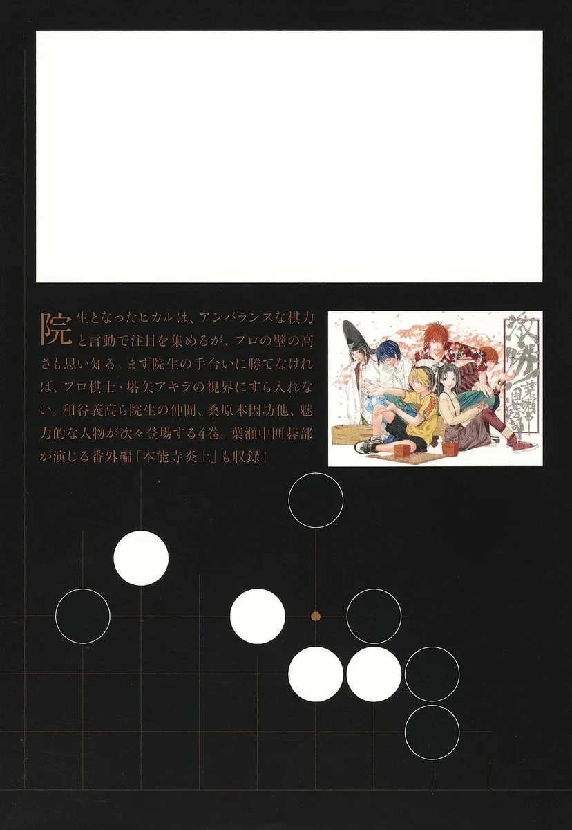 Хикару, теперь уже инсей (ученик игры в го), привлекает внимание своими неуравновешенными навыками и поведением в игре в го, но вскоре понимает, насколько высок барьер на пути к профессиональной карьере. Сначала он должен победить других игроков-инсей, иначе он даже не попадёт в поле зрения профессионального игрока в го Тоуи Акиры. В 4 томе появляются многие интересные персонажи, в том числе такие же инсей, как Ватая Ёситака и Кувахара Хонинбо. Также включает бонусный рассказ «Сожжение храма Хоннодзи» в исполнении клуба игры в го средней школы Хасэ!