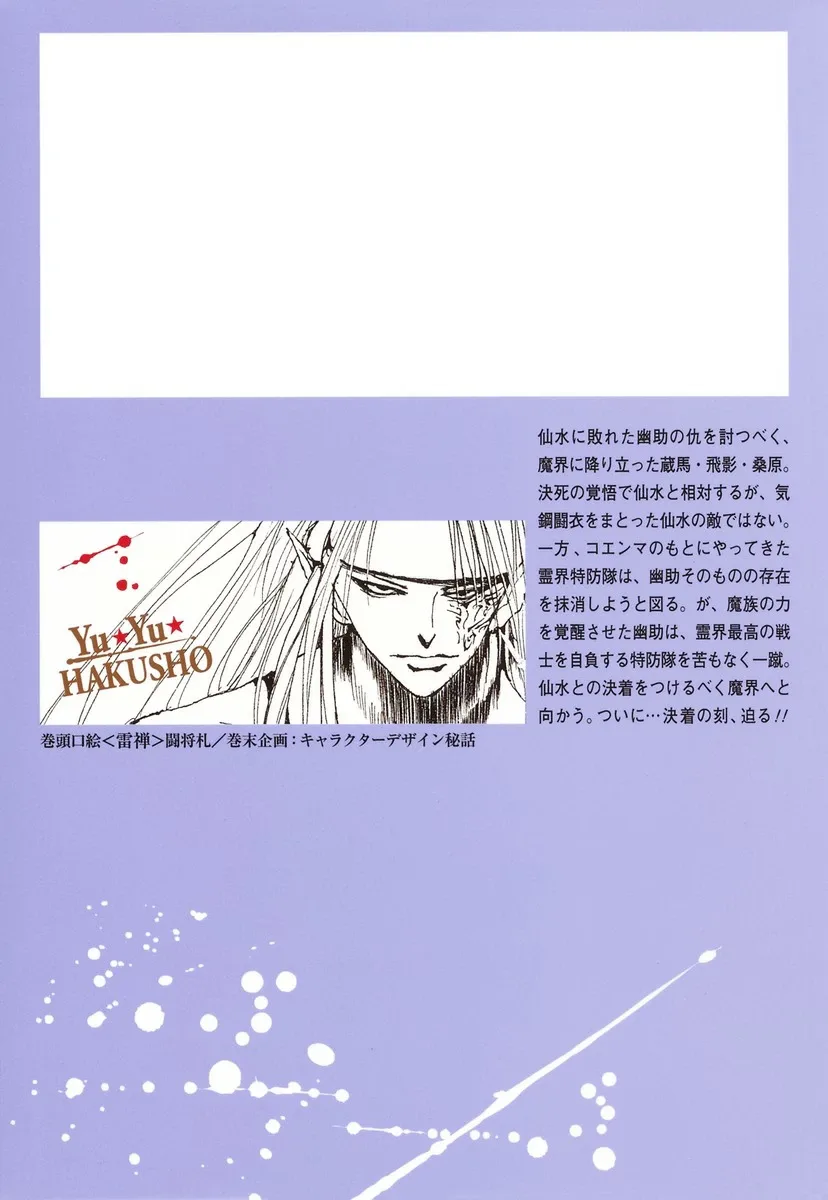 Курама, Хиэй и Кувабара спускаются в Мир Демонов, чтобы отомстить за поражение Юсуке от Сенсуи. Они противостоят Сенсуи с отчаянной решимостью, но не могут противостоять ему, облаченному в стальную броню Ки. Тем временем, к Коэнме прибывает Специальный отряд обороны Мира Духов, пытаясь стереть само существование Юсуке. Однако Юсуке, пробудив свои демонические силы, легко побеждает Специальный отряд обороны, который гордится тем, что является величайшими воинами в Мире Духов. Затем он отправляется в Мир Демонов, чтобы свести счеты с Сенсуи. Наконец... момент истины приближается!! Вступительная иллюстрация: <Райзен> Боевой Генерал Карта / Заключительная часть: Секреты дизайна персонажей