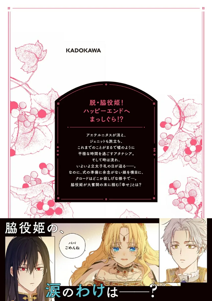 Этернитас исчезла, и Дженнет тоже уехала, позволив Атанасии наслаждаться мирным временем, словно все, что произошло раньше, было ложью. Время идет, и день церемонии посвящения наследного принца наконец приближается. Однако, пока его дочь занята подготовкой к церемонии, Клод кажется несколько одиноким... Какое же «счастье» наконец обретет эта поддерживающая принцесса после своей великой борьбы?