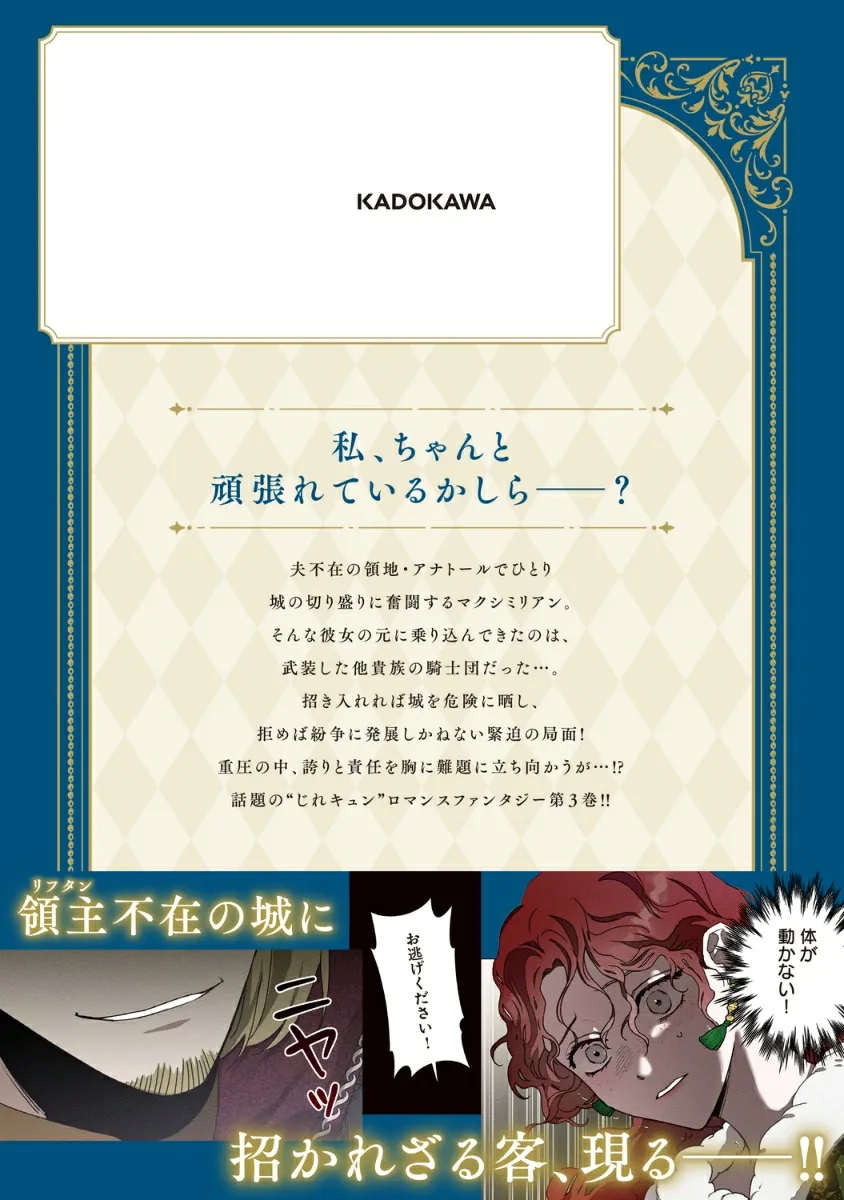 Максимилиан изо всех сил пытается в одиночку управлять замком в Анатоле, своей территории, пока ее муж в отъезде. Внезапно прибывает отряд вооруженных рыцарей из другой знатной семьи... Пригласить их означало бы поставить замок под угрозу, а отказ мог бы привести к конфликту — напряженная ситуация! Под огромным давлением она встречает вызов с гордостью и ответственностью...!? Третий том популярной «до невозможности приторной» романтической фэнтези!!