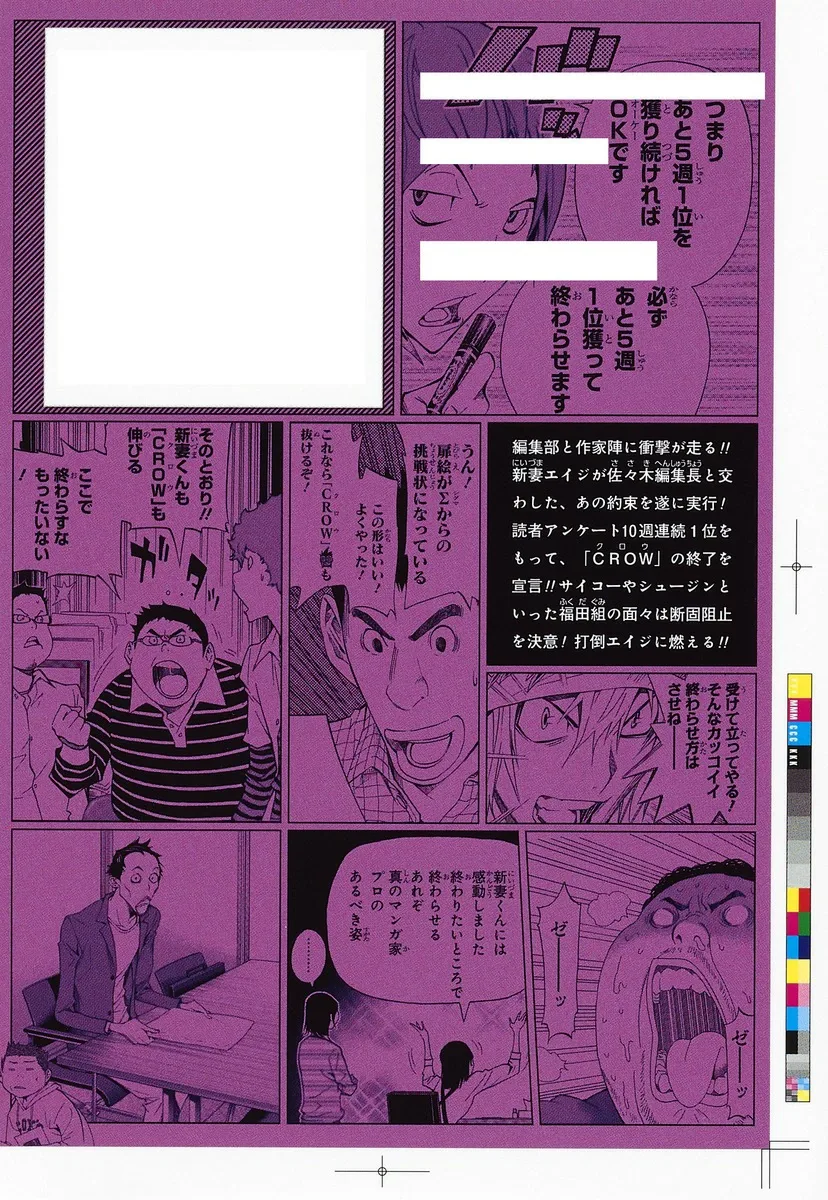Редакционный коллектив и авторы переживают настоящий шок!! Эйдзи Ниидзума выполняет обещание, данное главному редактору Сасаки! После того, как он 10 недель подряд занимал первое место в опросах читателей, он объявляет о конце «ВОРОНЫ»!! Сайко, Сюдзин и другие члены группы Фукуды полны решимости остановить его! Они пылают желанием победить Эйдзи!!
