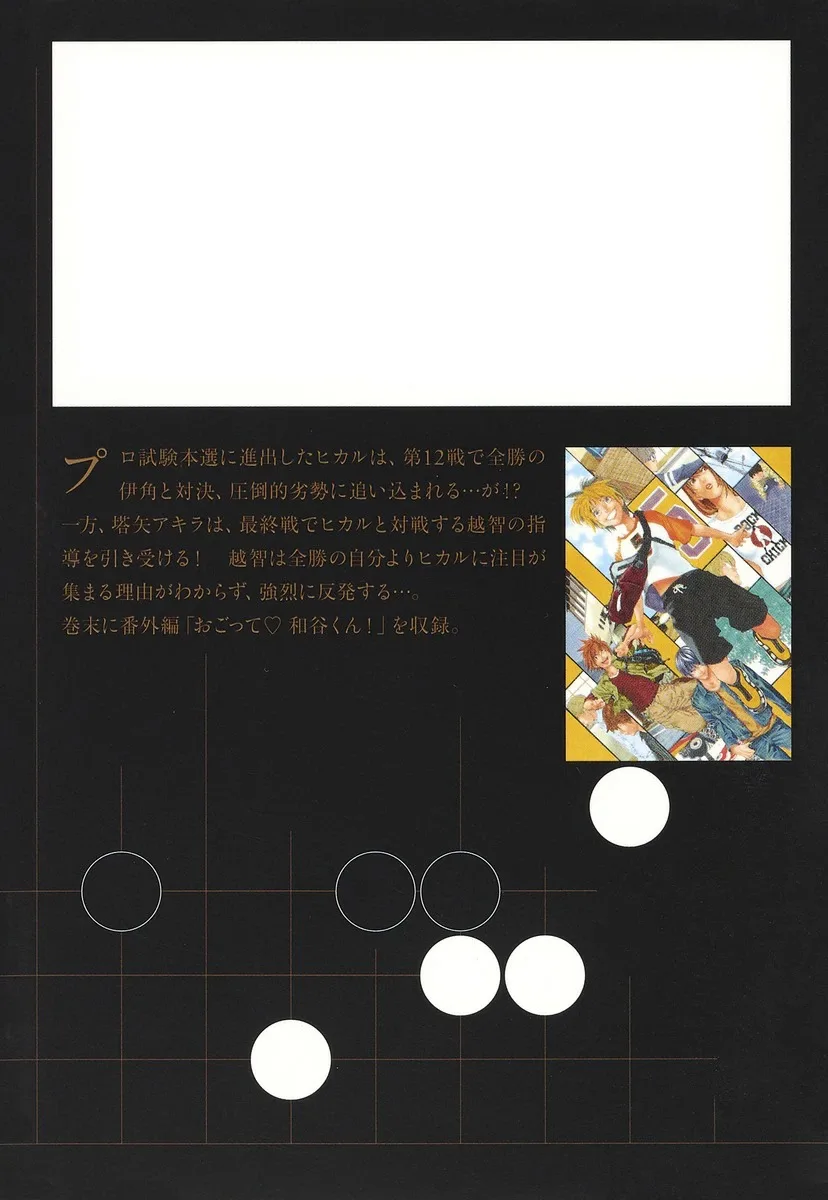 Хикару, прошедший в финальный раунд профессионального экзамена, в 12-м матче встречается с непобежденным Исуми и оказывается в крайне невыгодном положении... но!? Тем временем Тоуя Акира берет на себя роль тренера Очи, которому предстоит сразиться с Хикару в финальном матче! Очи не понимает, почему все внимание сосредоточено на Хикару, а не на нем самом, выигравшем все матчи, и оказывает сильное сопротивление... В конце тома включена бонусная глава «Угости меня обедом, Вая-кун!».