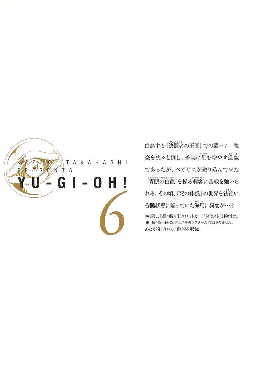 Битвы в Королевстве Дуэлистов накаляются! Юги неуклонно наращивает свои звёзды, побеждая одного сильного противника за другим, но ему приходится вступить в тяжёлую битву с убийцей, посланным Пегасом, который управляет «Белым Синеглазым Драконом». Тем временем с Каибой, который бродил по миру «Смертельного Чувства», происходит нечто странное: он впал в кому...!? В начале книги есть иллюстрации карт Таро из «Yu-Gi-Oh!». *Это не «Yu-Gi-Oh! OCG Duel Monsters».