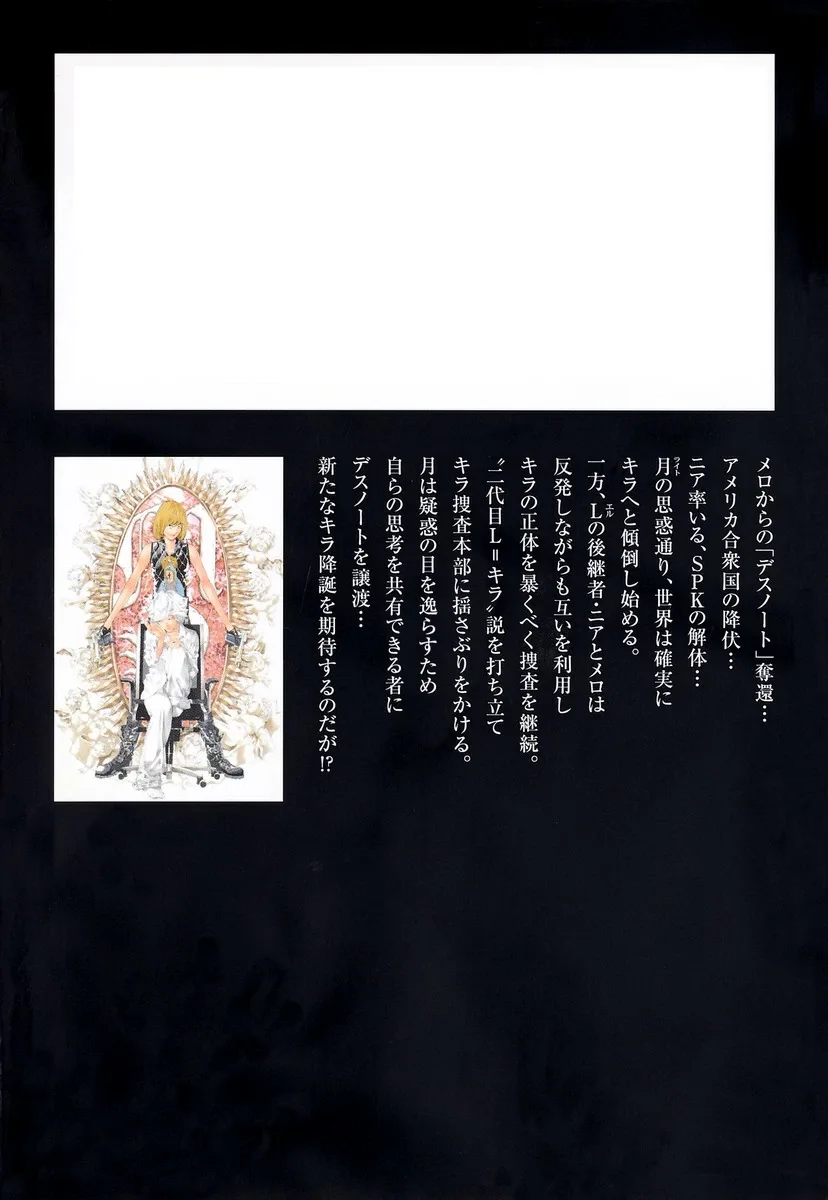 Тетрадь смерти найдена у Мелло... Соединенные Штаты капитулируют... Ниар распускает СПК... Как и планировал Лайт, мир начинает склоняться к Кире. Тем временем преемники L, Ниар и Мелло, продолжают расследование, чтобы раскрыть истинную личность Киры, используя друг друга, несмотря на конфликт. Они выдвигают теорию о том, что «второй L = Кира», и встряхивают штаб расследования Киры. Чтобы отвести подозрения, Лайт передает Тетрадь смерти тому, кто может разделить его мысли... Он надеется на рождение нового Киры!?