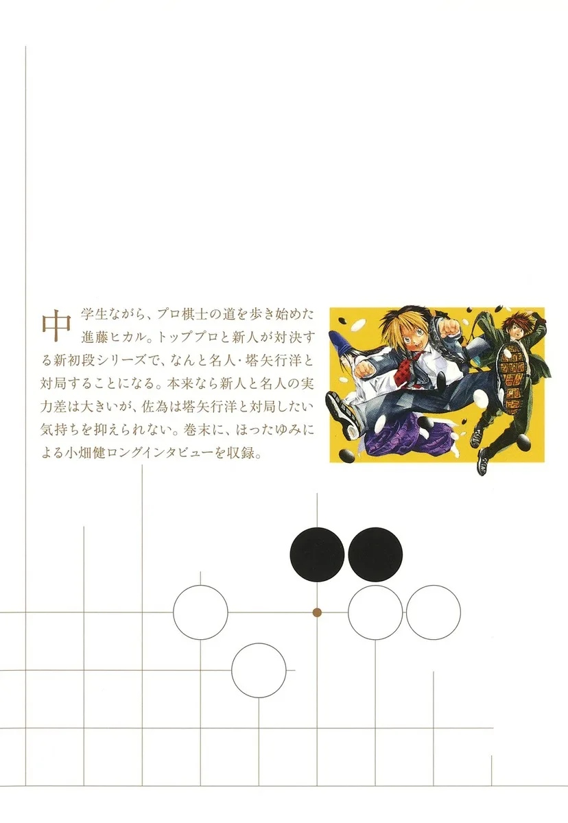 Хикару Синдо, ученик средней школы, начал свой путь к становлению профессиональным игроком в сёги. В серии New Shodan, где лучшие профессионалы сражаются с новичками, ему предстоит сыграть против не кого иного, как Мэйдзина Тоя Коё. Обычно между новичком и Мэйдзином существует огромная разница в уровне мастерства, но Сай не может подавить в себе желание сыграть против Тоя Коё. В конце книги приводится большое интервью с Такеши Обатой, взятое Юми Хоттой.